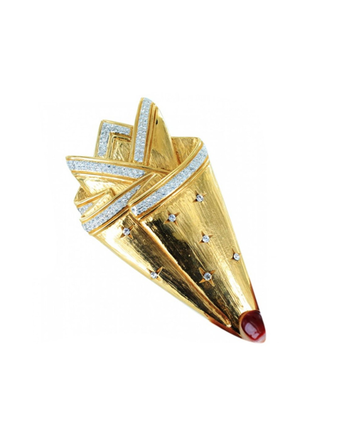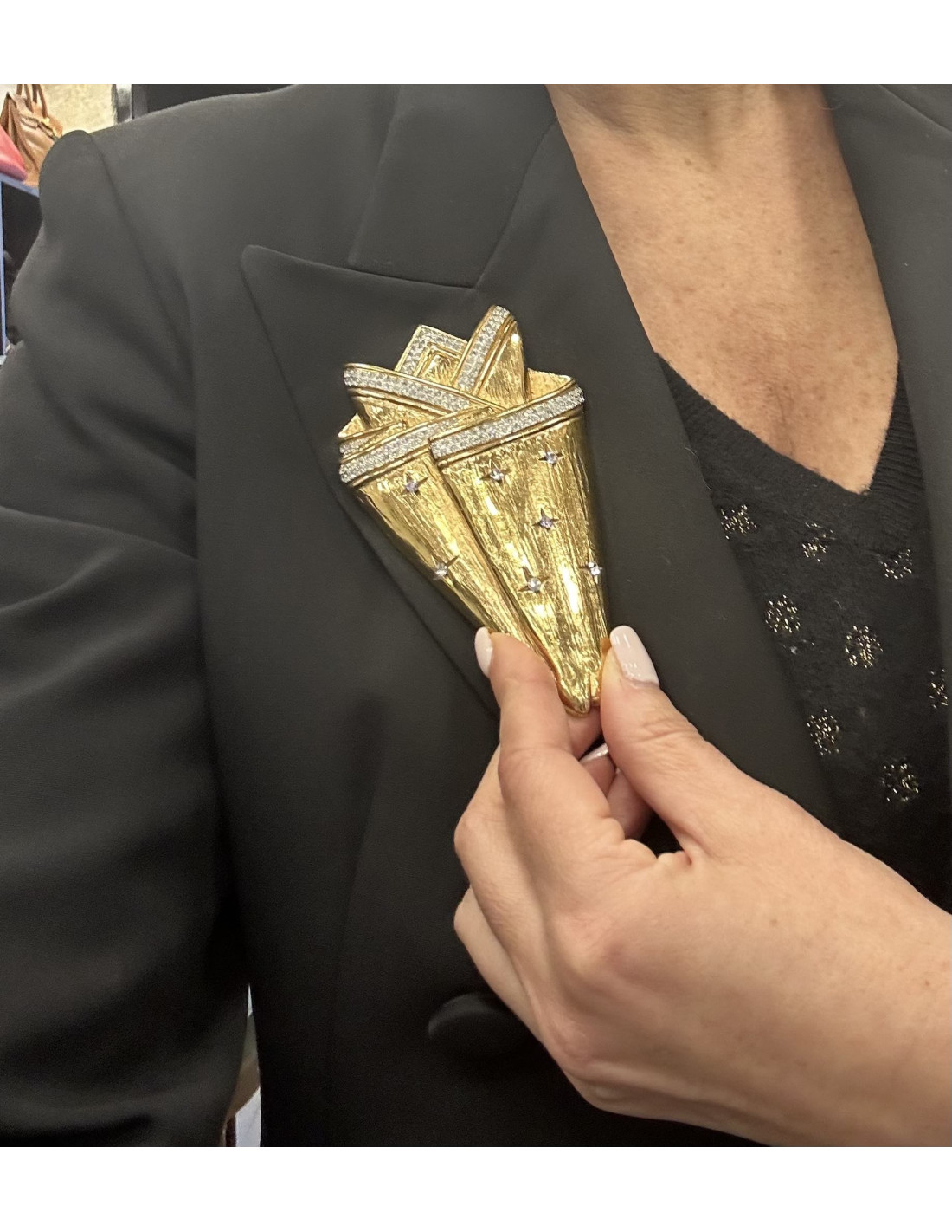 Imposing Valentino brooch in the shape of a draped cornucopia, in gold-plated metal and Swarovski rhinestones. In very good condition.