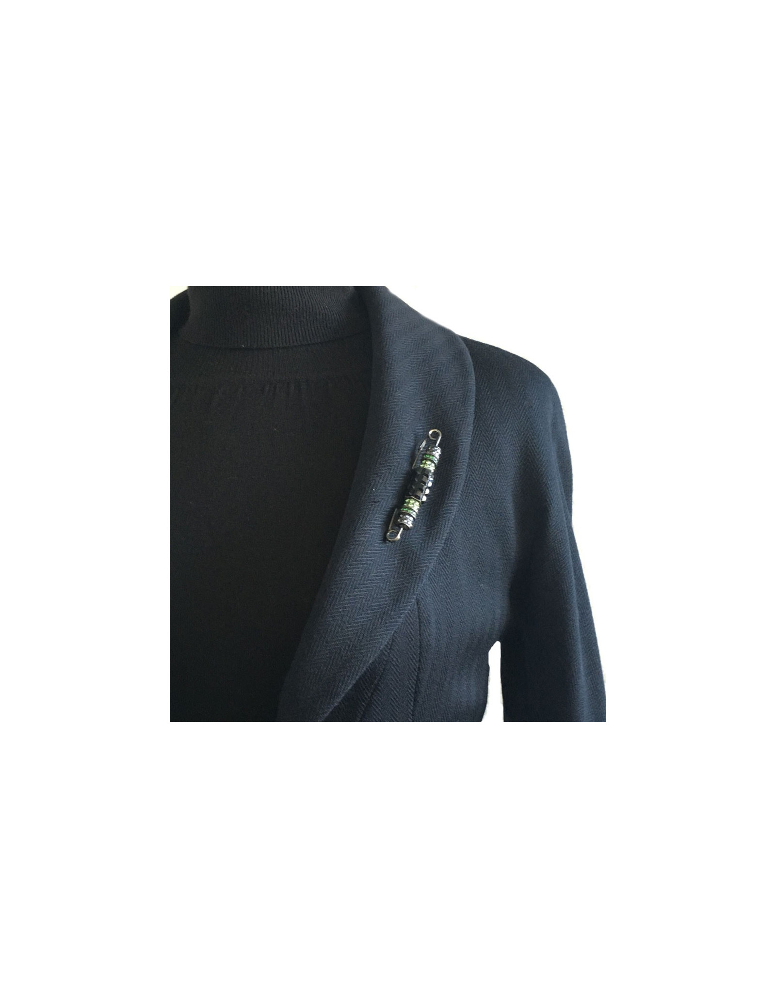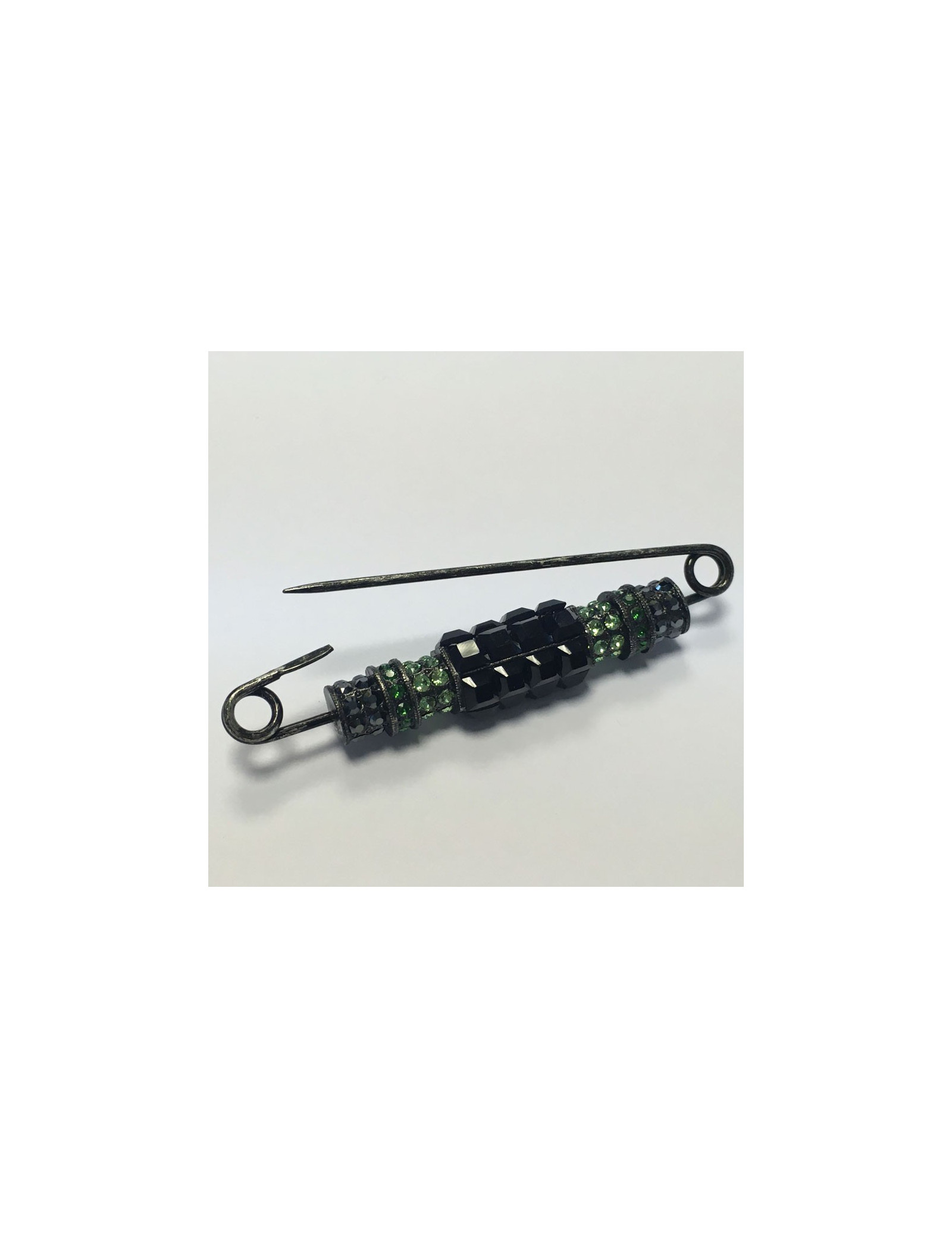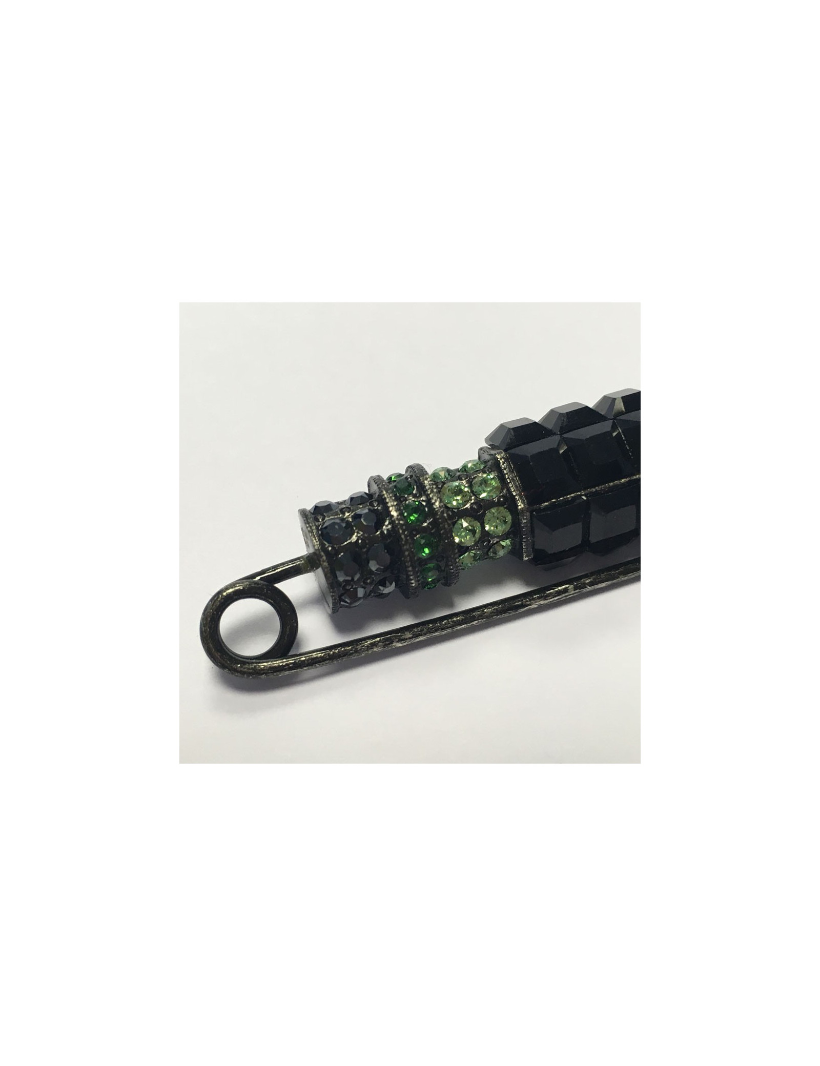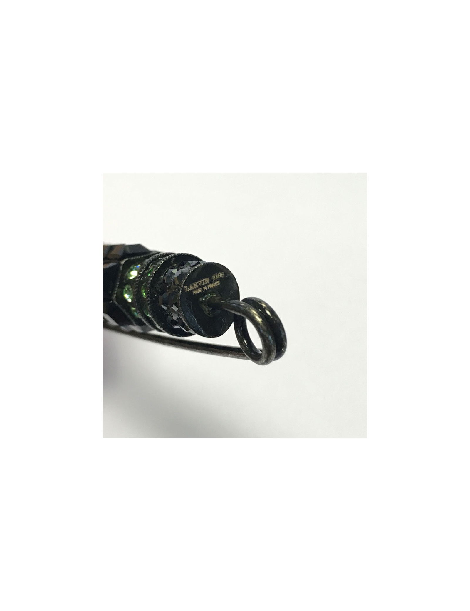 LANVIN pin brooch in blackened silver metal and rhinestones in various colors (green, blue, gray and black). Never worn. Brand stamp present.