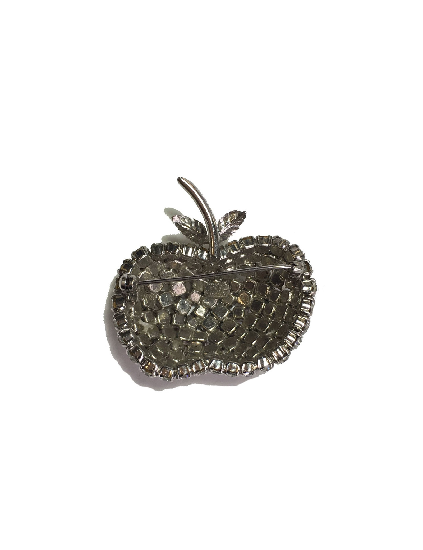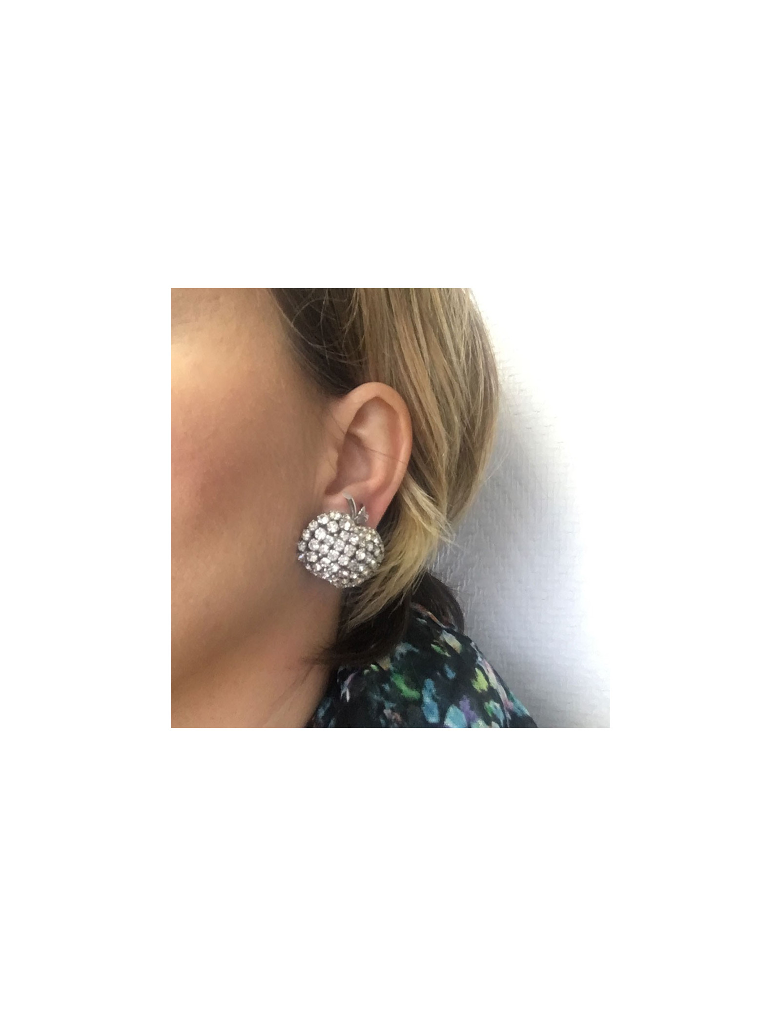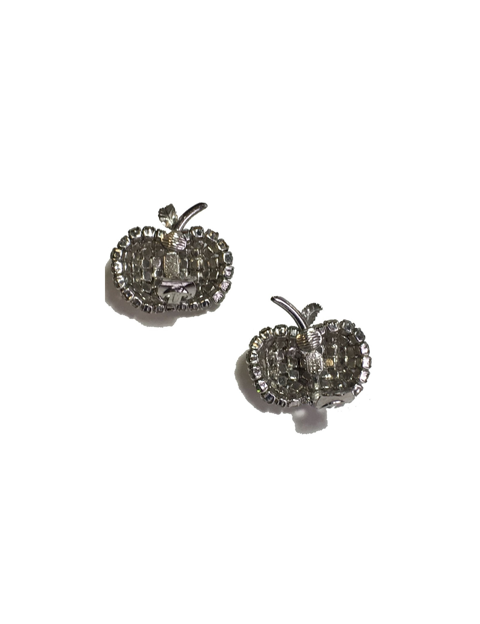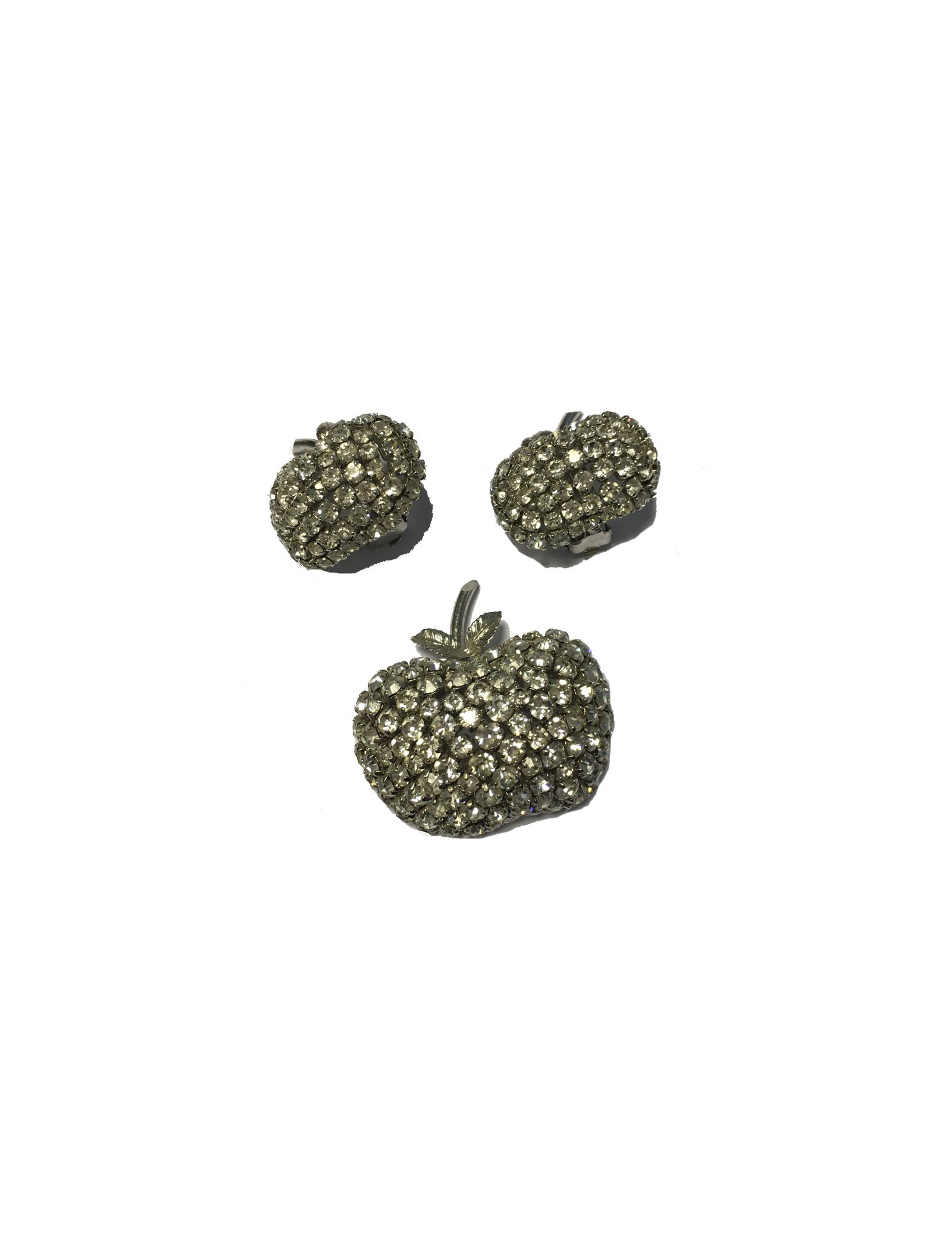 Glamour! Très belle parure CHRISTIAN DIOR comprenant une broche en forme de pomme tout en strass et métal argenté et les boucles d'oreilles clips assorties.