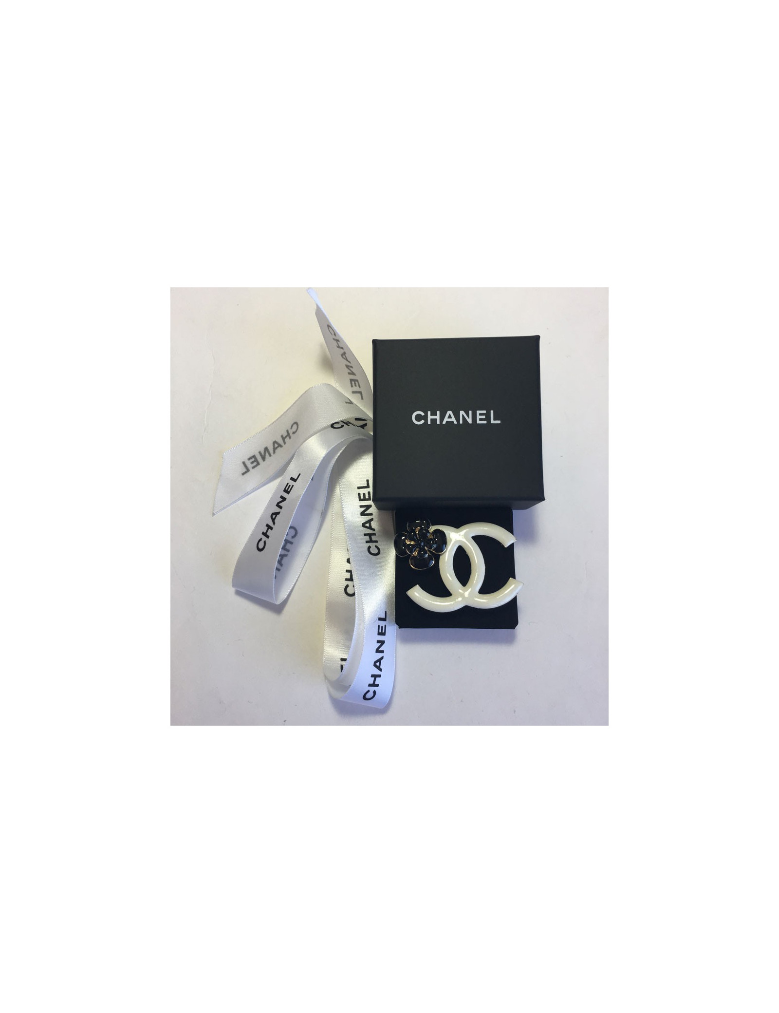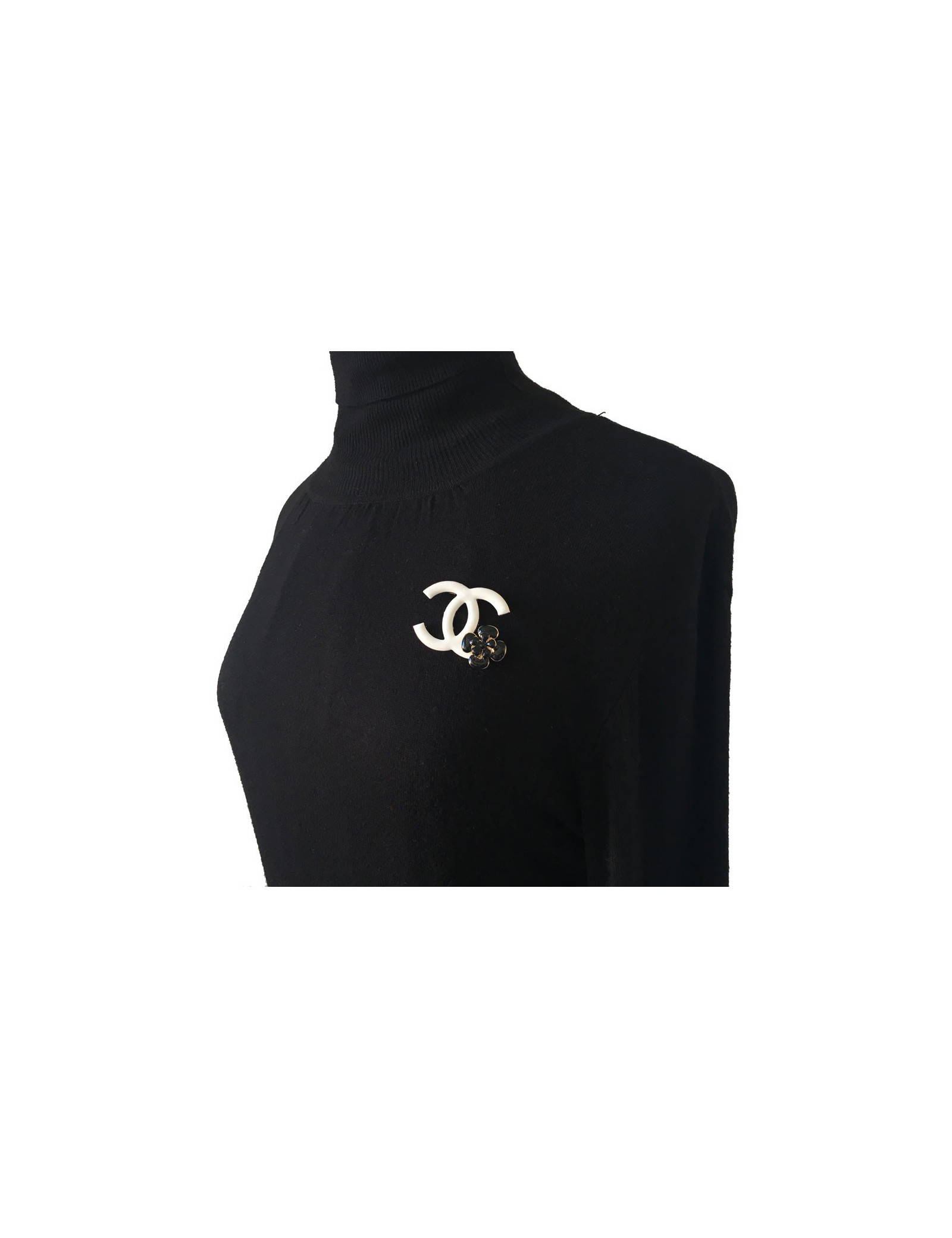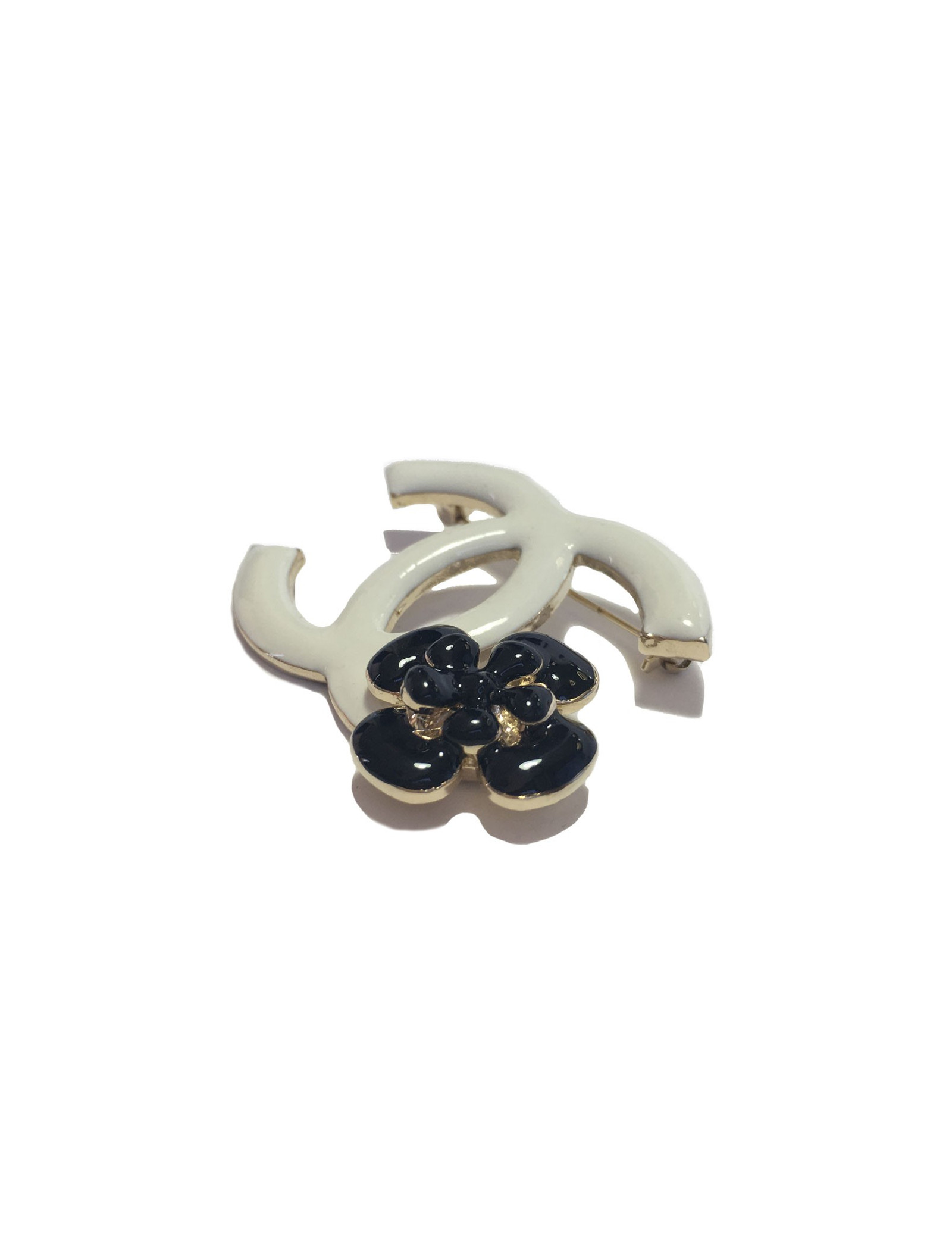 PIN CHANEL double C in white enamel and Camellia in black enamel