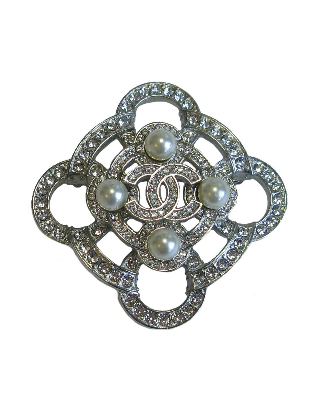 Beautiful Chanel brooch made of on silver metal with rhinestones and 4 pearl glass. The "CC" is set with 2 different sizes of Swarovski rhinestones. In very good condition, worn once.