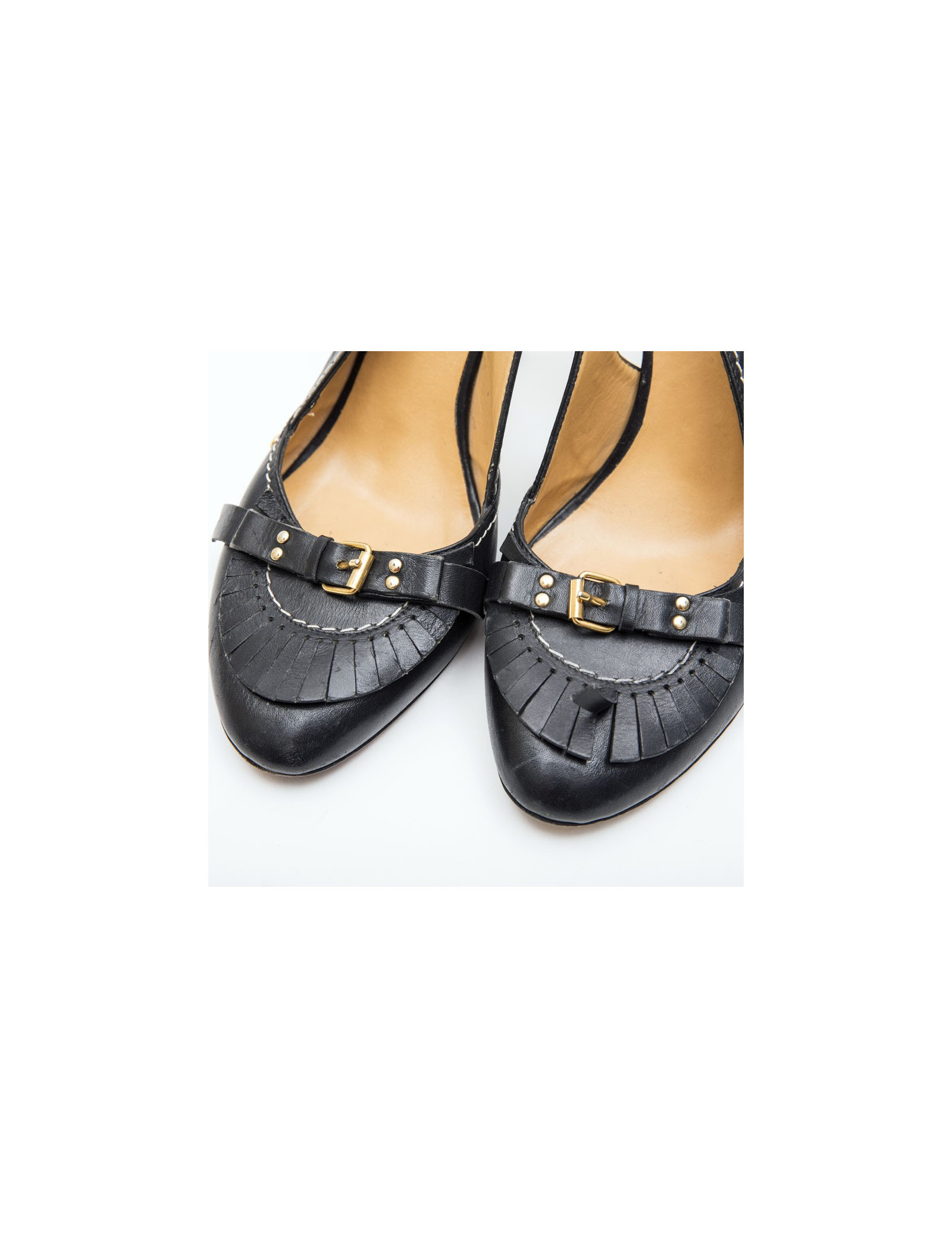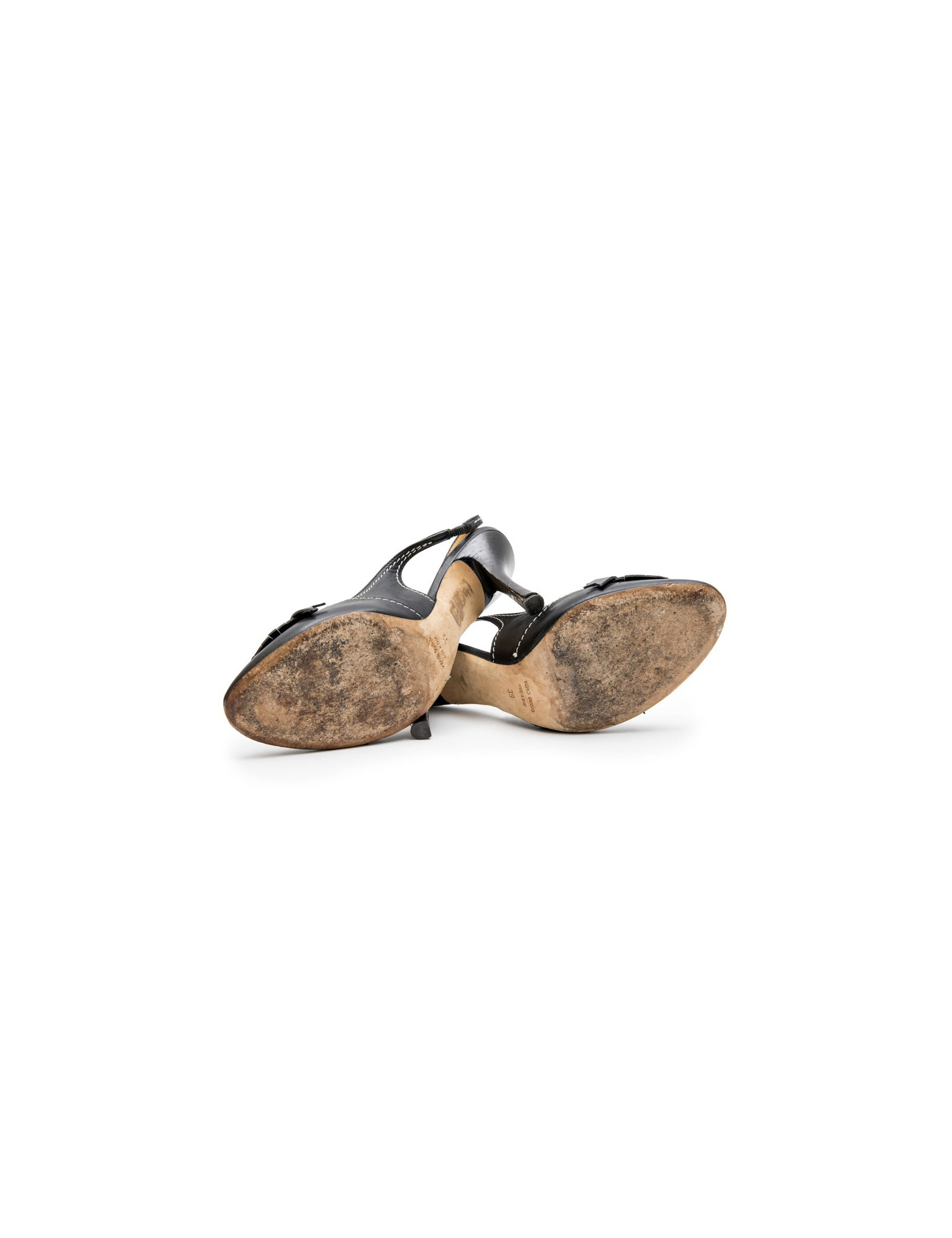Sold PUMPS - WEDGES CHANEL shoes T 39.5 black leather and silver chain CHANEL 20225 390.00 € The House of Chanel in black leather and silver chain pumps. Open end. Size 39.5. In very good condition. Slight wear to the soles. Height heel: 8,5 cm, length Insole: 25 cm.p > will be delivered in their original Chanel box View