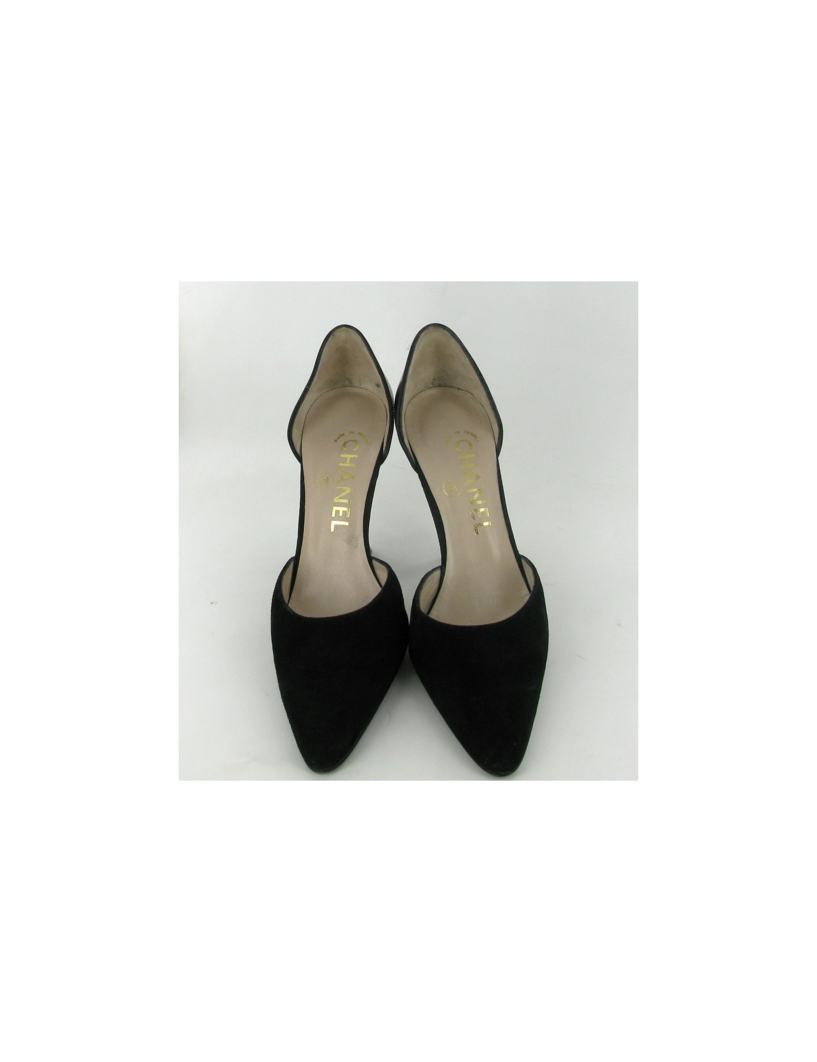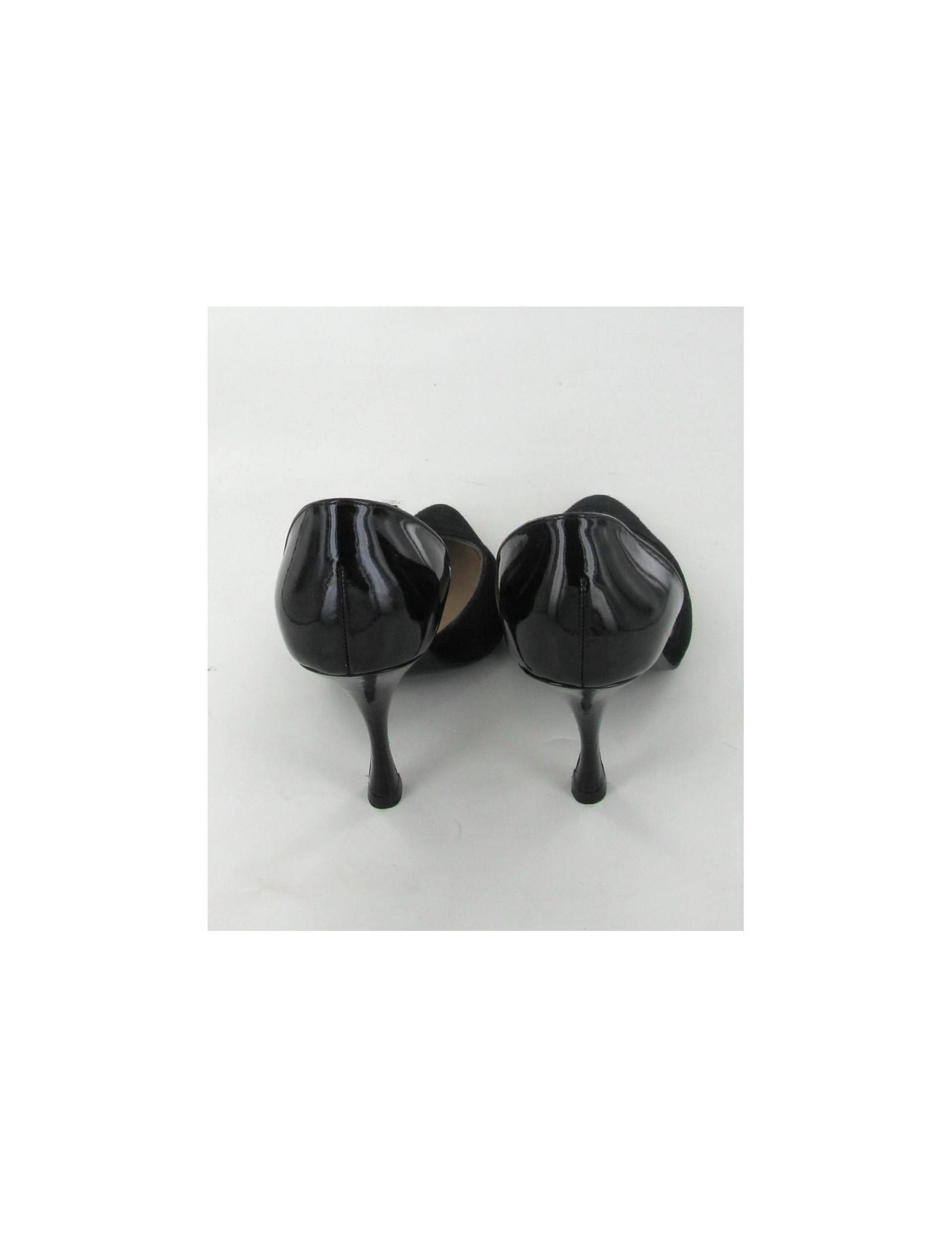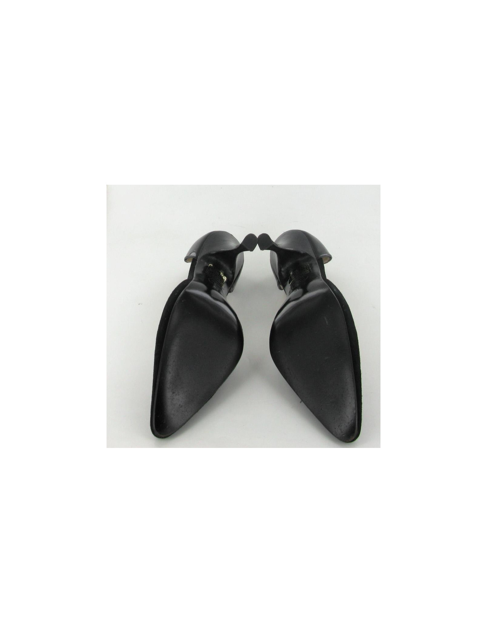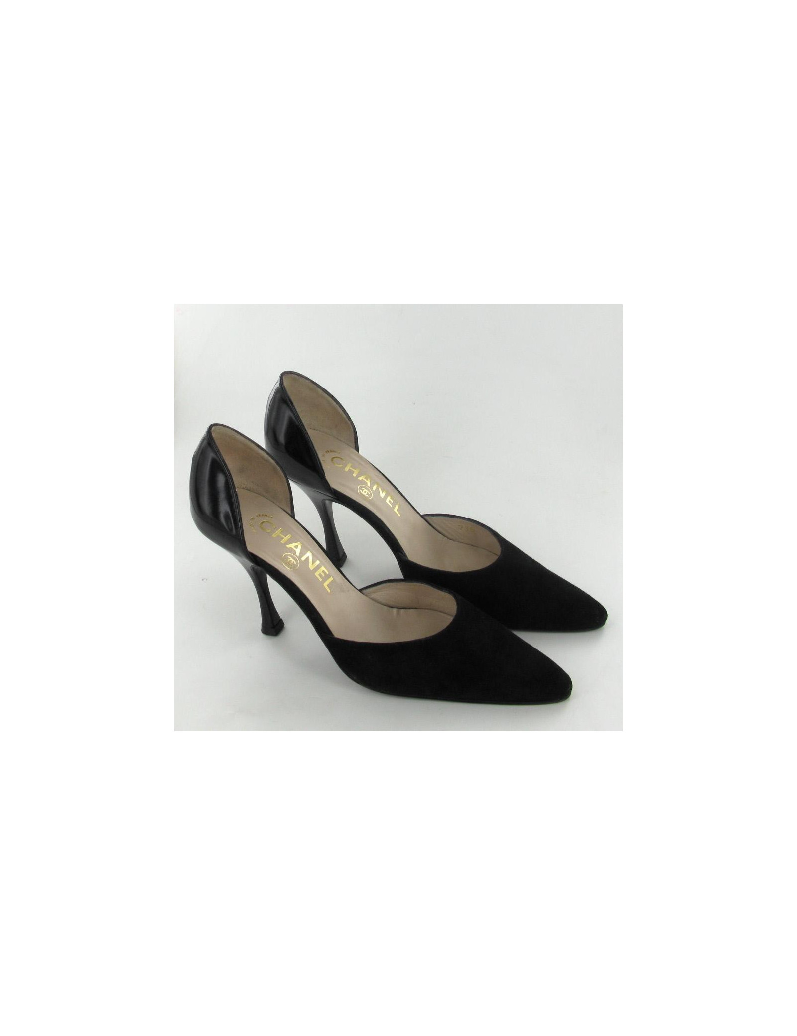 Chic stilettos and elegant CHANEL T36 in black suede and leather Polish. Inner and outer soles are leather. They are comfortable and in very good condition. Light marks very inconspicuous on the varnish of the heel. these soles have been brought only 2 times.