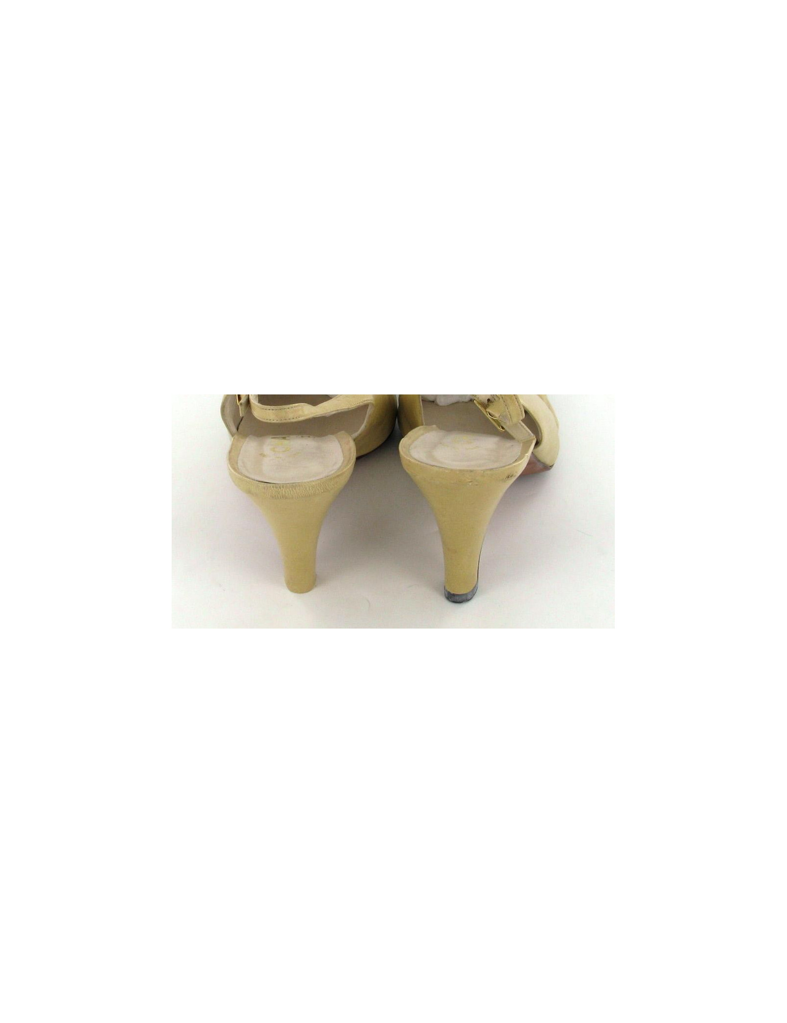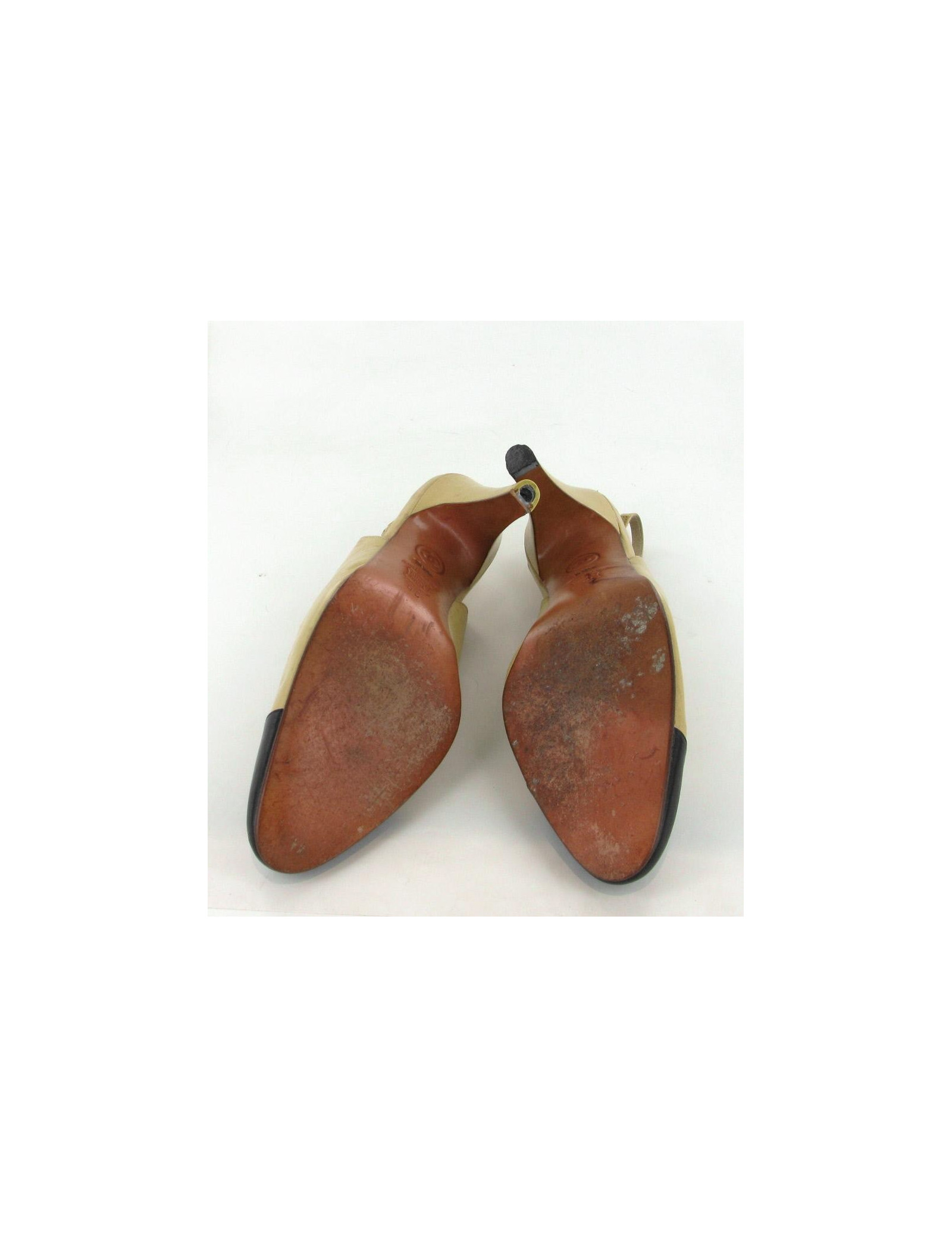 Classical and mythical two-tone CHANEL pumps, beige and black T39. The clasp of the strap is metal gilt with the inscription "CHANEL" engraved on it. It is noticeable traces of wear and small spots. They are in good condition.