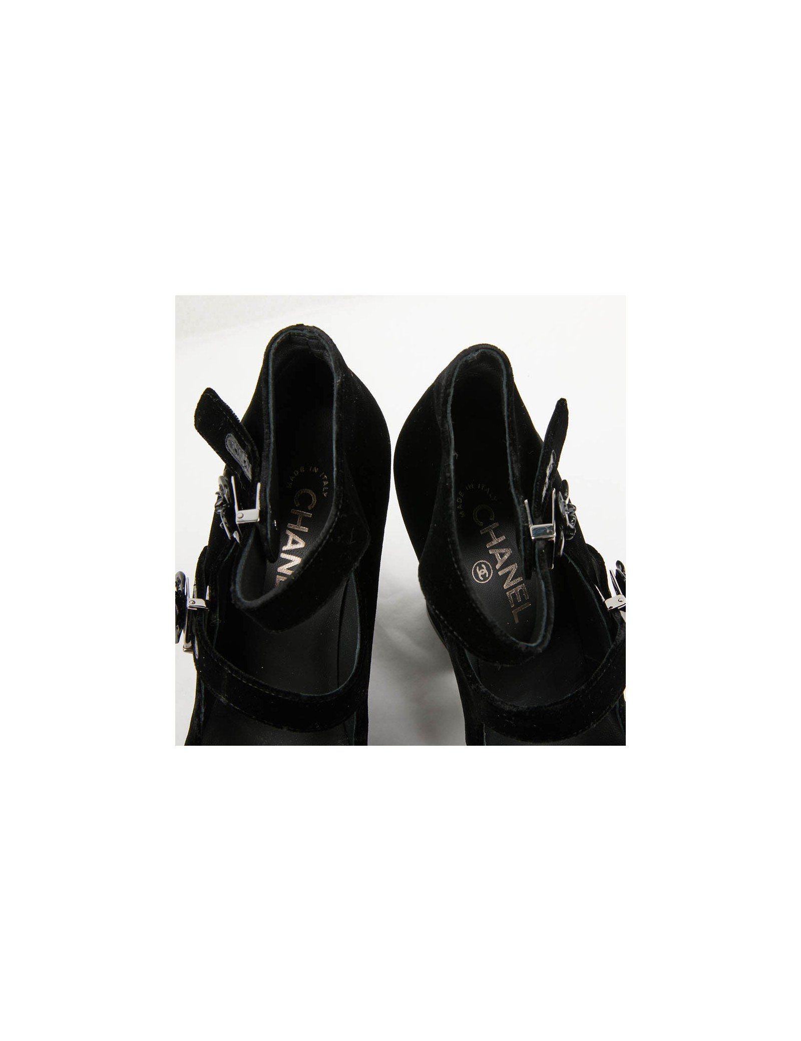Last items in stock PUMPS - WEDGES CHANEL T37 blue patent leather pumps CHANEL 14841 300.00 € Shoes Chanel T 37 blue duck leather varnished with a platform silver color with the Chanel logo on the front of the shoe. Very good condition. Heel height: 11.5 cm width outside: 7.5 cm length inside the shoe: 24.2 cm delivered in a dustbag. Add to cart