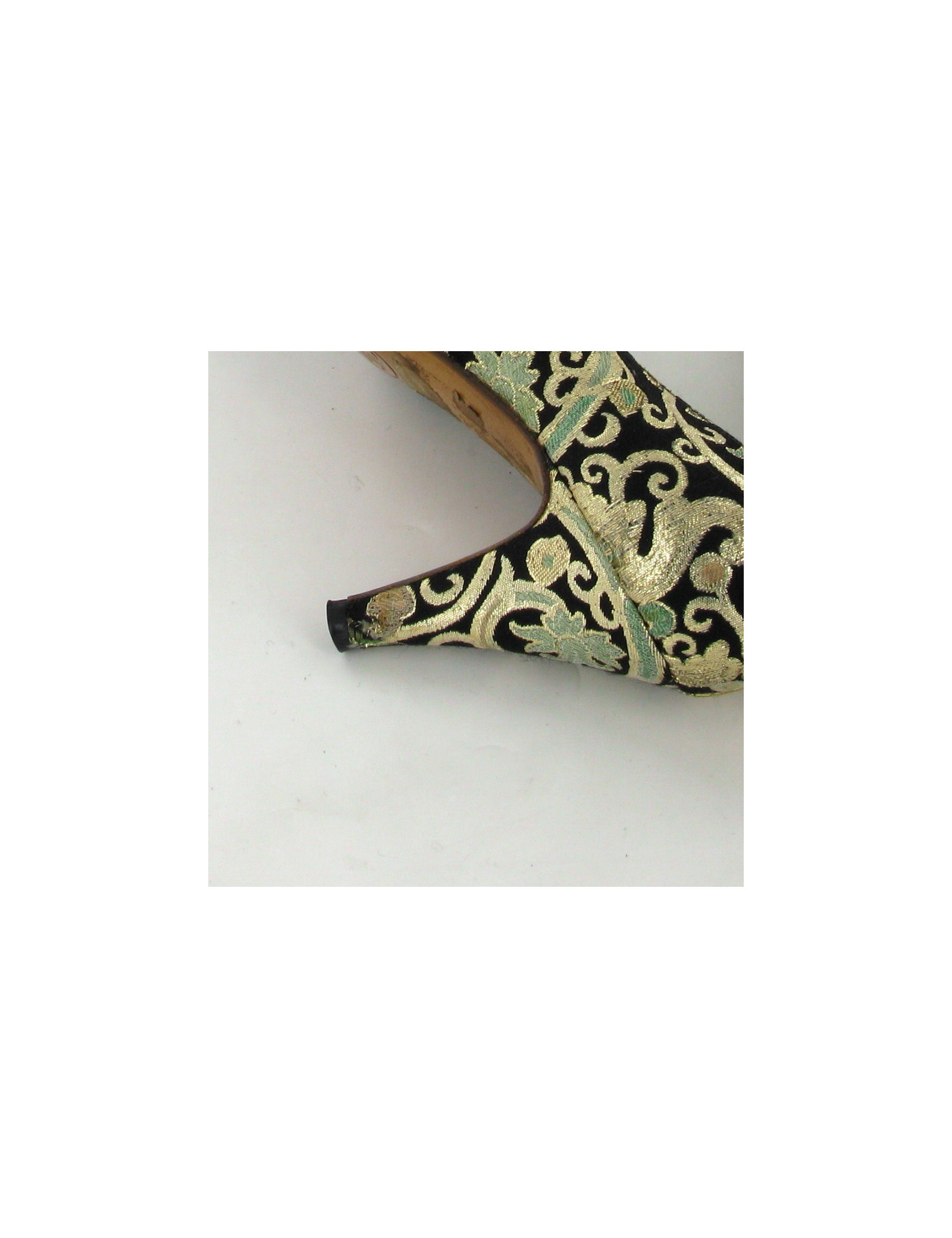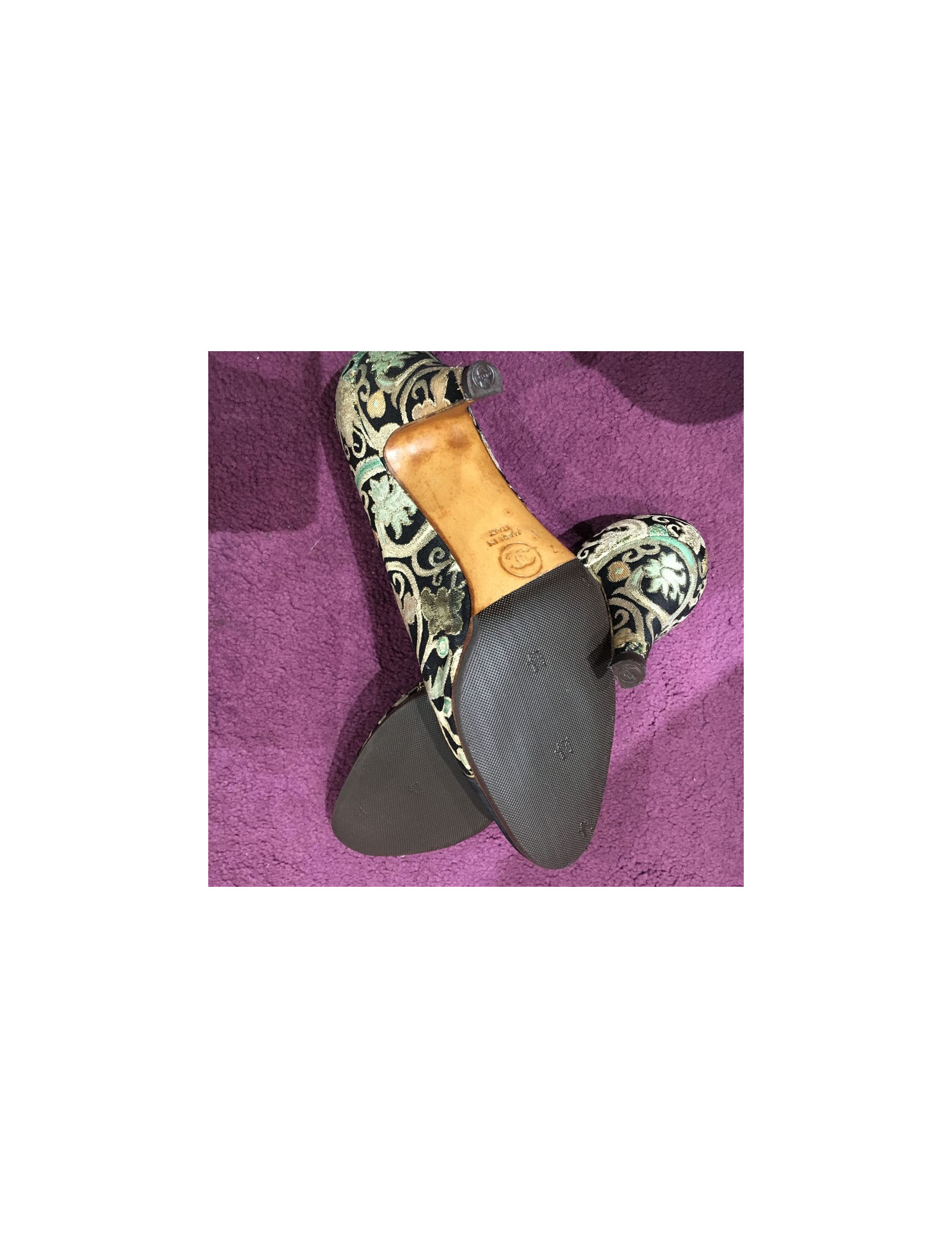 These beautiful Couture House Chanel shoes have been brought, the insole has lost its original golden color but the initials of the brand remains visible. The Golden son weaving is slightly worn on the heel of the left shoe, but the patterns and colors are not entaches.
