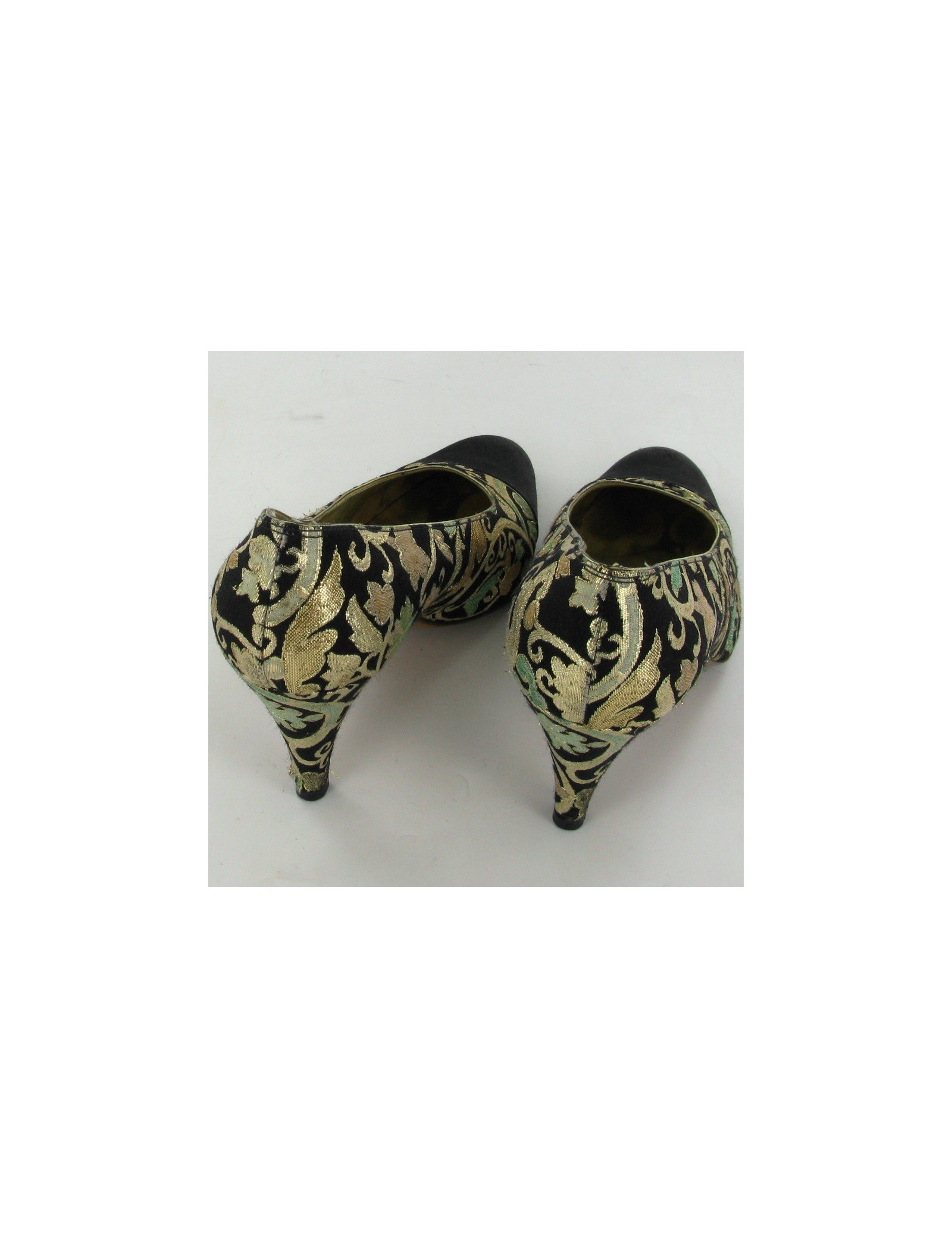 CHANEL Couture Vintage T.38 pumps in black satin and Golden son.