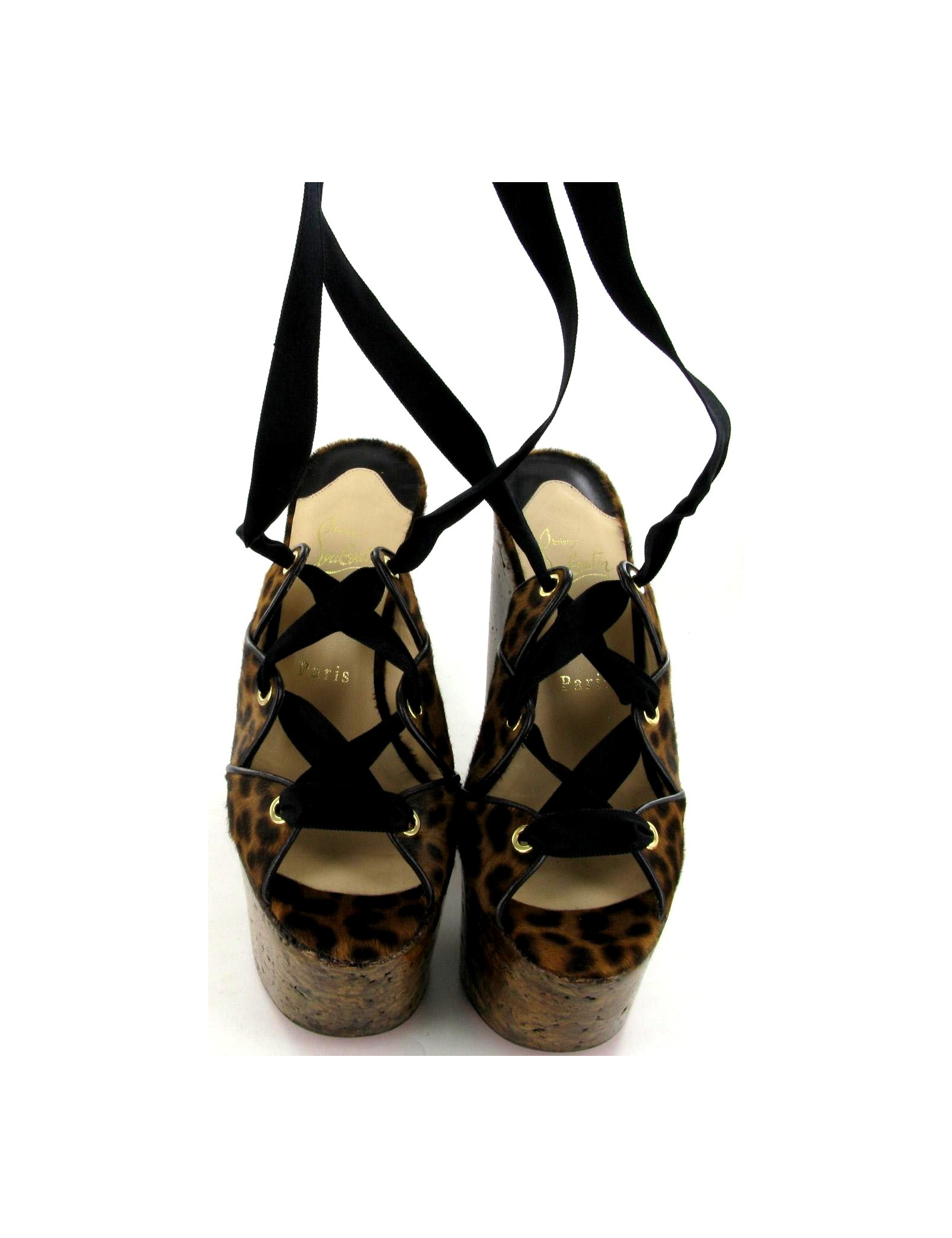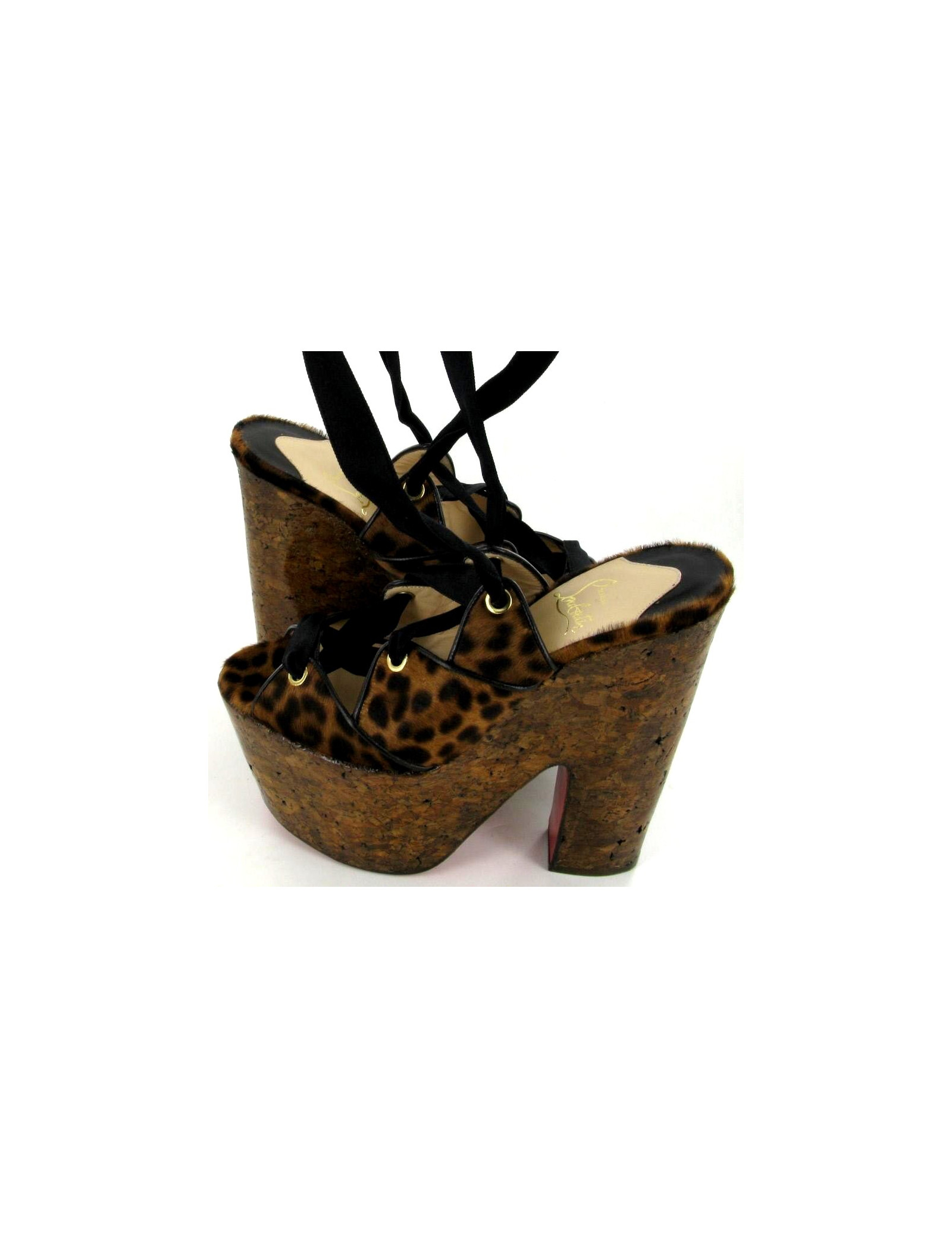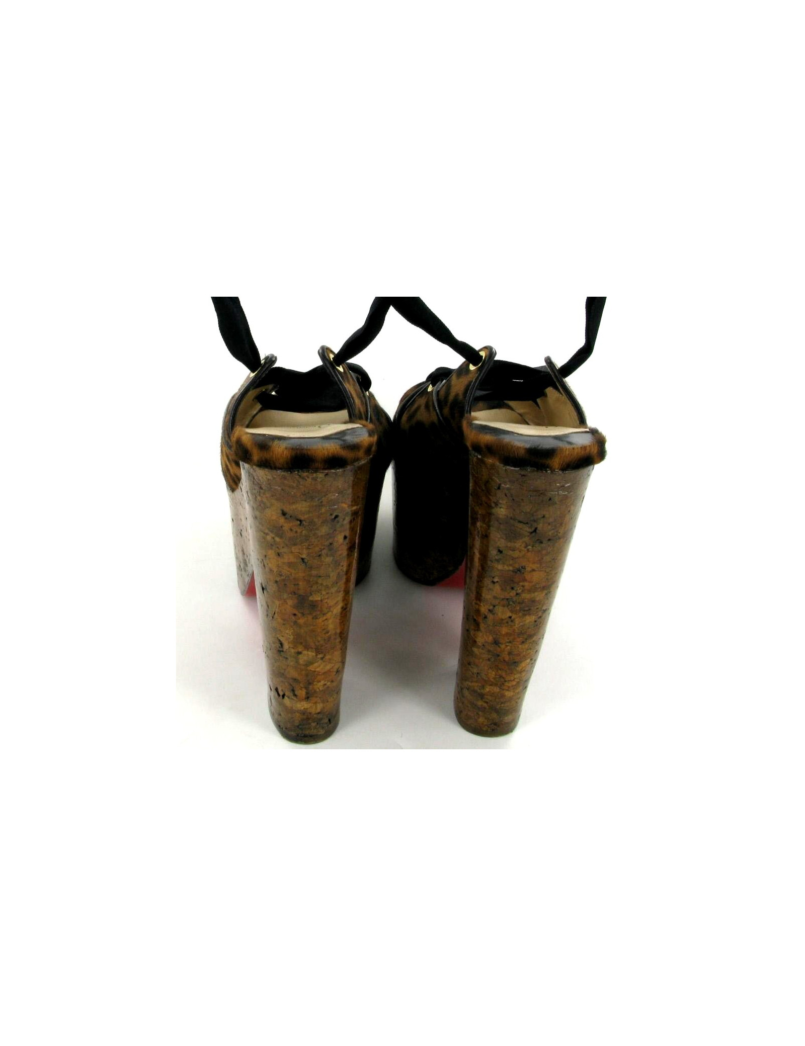 Pair of offset heeled shoes CHRISTIAN LOUBOUTIN, Paris, size 37. This open in leopard printed foal pair is in very good condition, as worn only once. These shoes are closed using black satin ribbon laces. Golden Oeuillets. Beautiful edgings in dark brown leather.