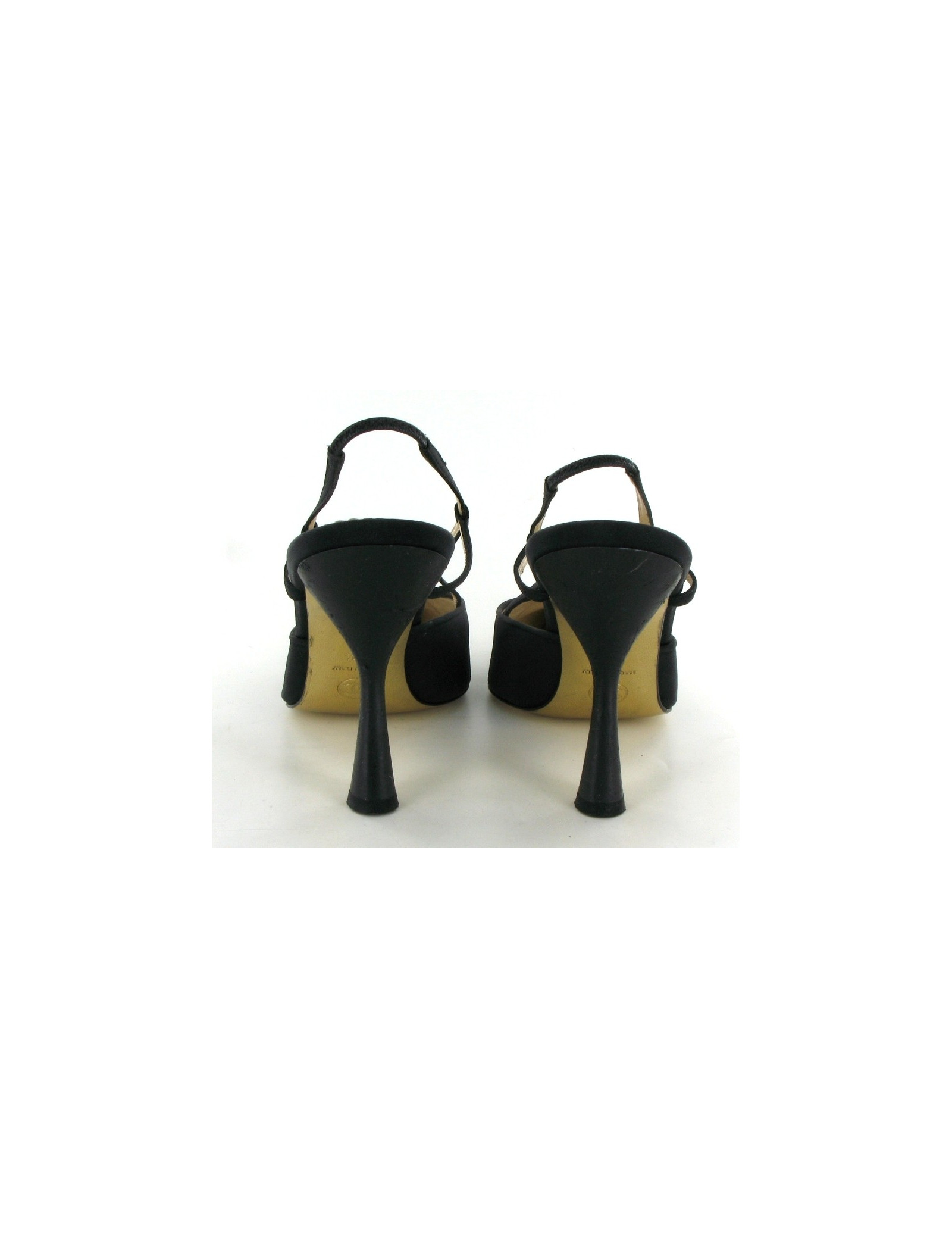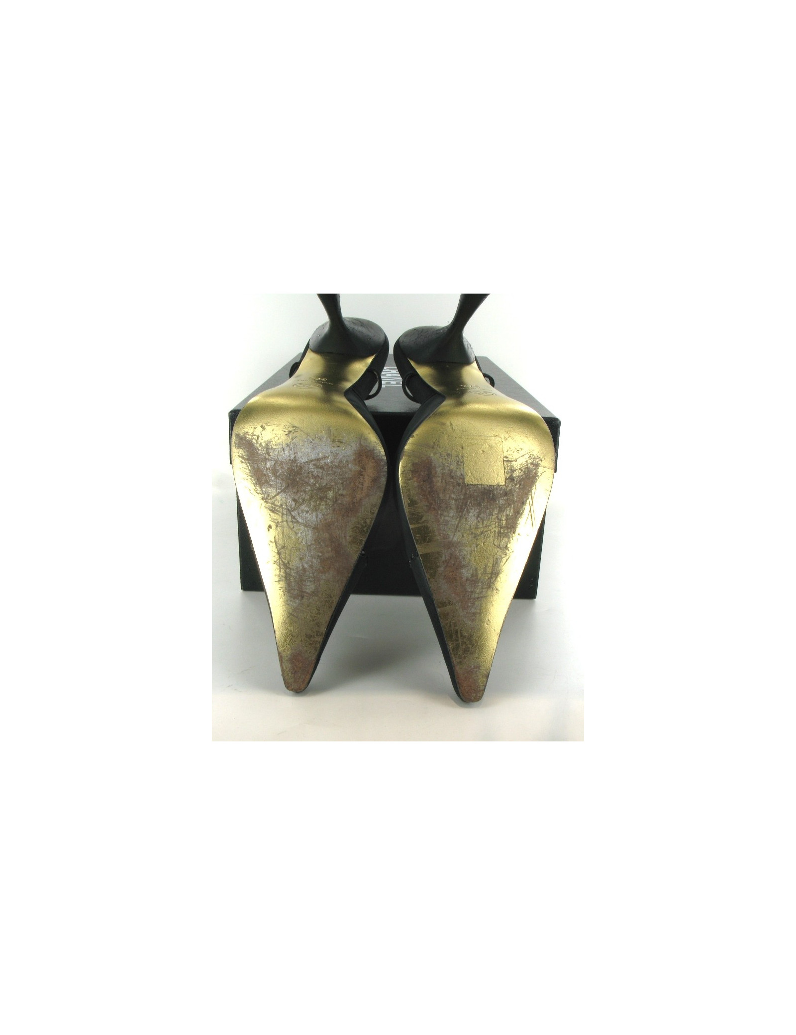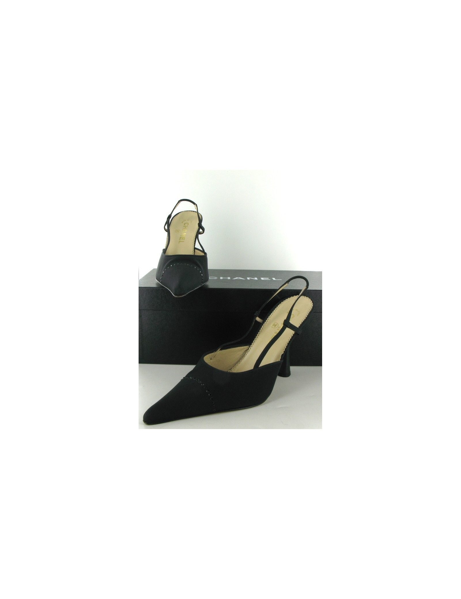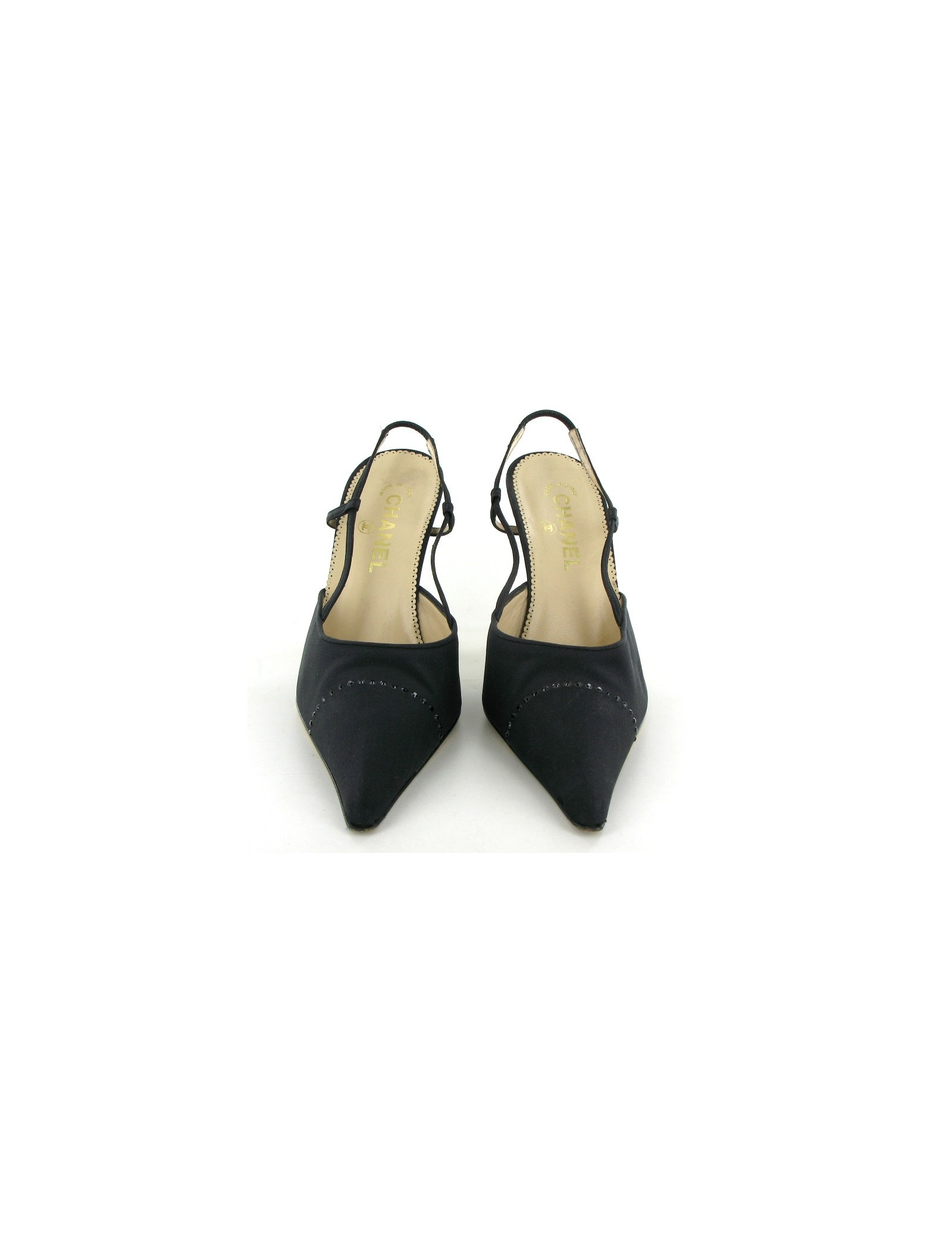 CHANEL pumps in black fabric, black rhinestones-size 37.5. The gum at the curved heel, brings a touch of originality to this very classic and elegant shoe. The fabric is beautifully decorated with a row of black rhinestone. Pretty sublime clamps the sides and ankle. Little worn this pair in very good overall condition. Inner and outer leather soles. Made in Italy.