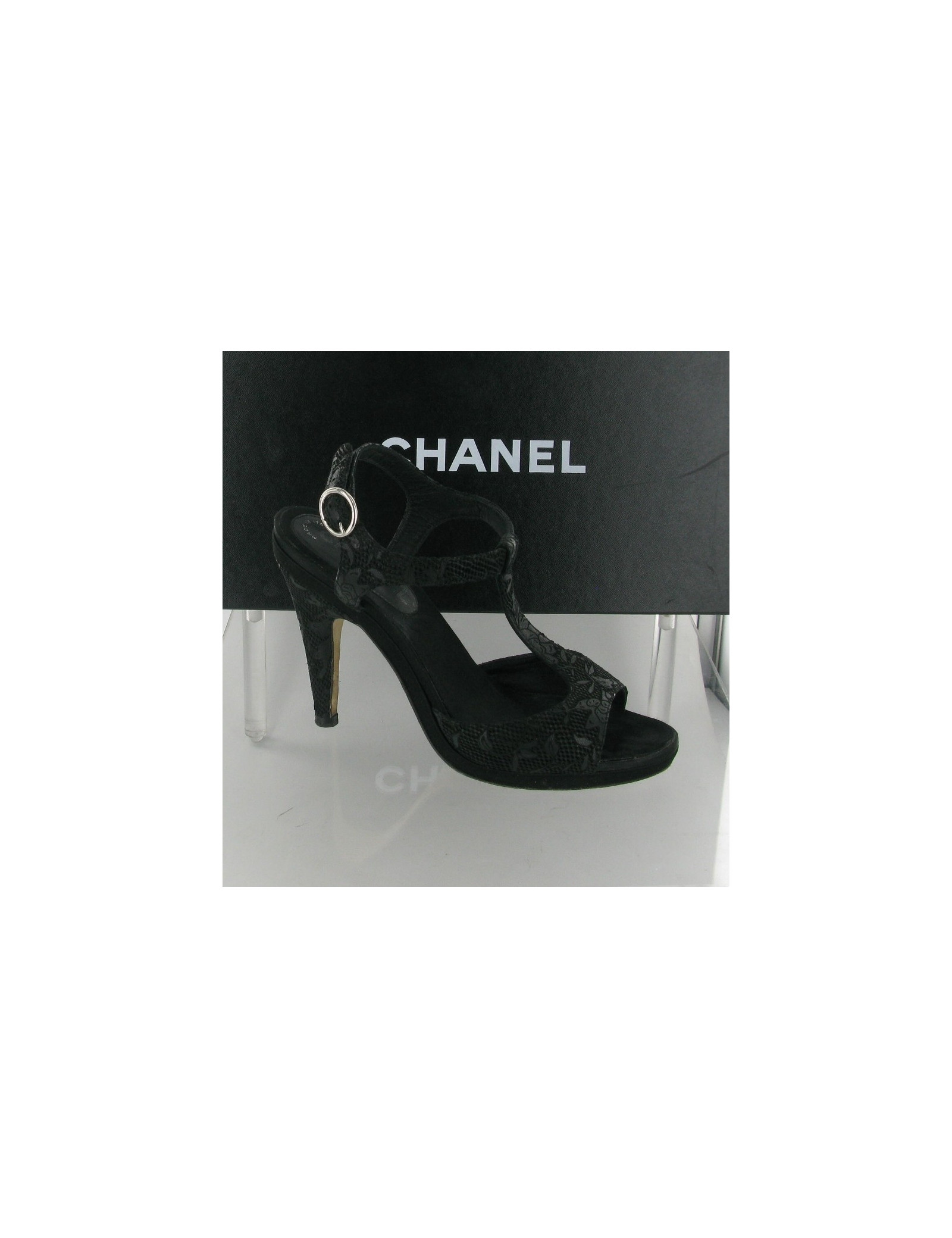 -350.00 € Last items in stock PUMPS - WEDGES CHANEL t 37 in silver python sandals CHANEL 31602 350.00 € 700.00 € Sandals silver scales Python 37 CHANEL; Heel height: 9 cm, heels, inside length of the sole in liege 24 cm, outer width of the footing 7. 5 cm. There is a double "c" on the back of the shoe silver ring and the heel is mix of a big black Mole.They will be delivered in their box Chanel. Add to cart