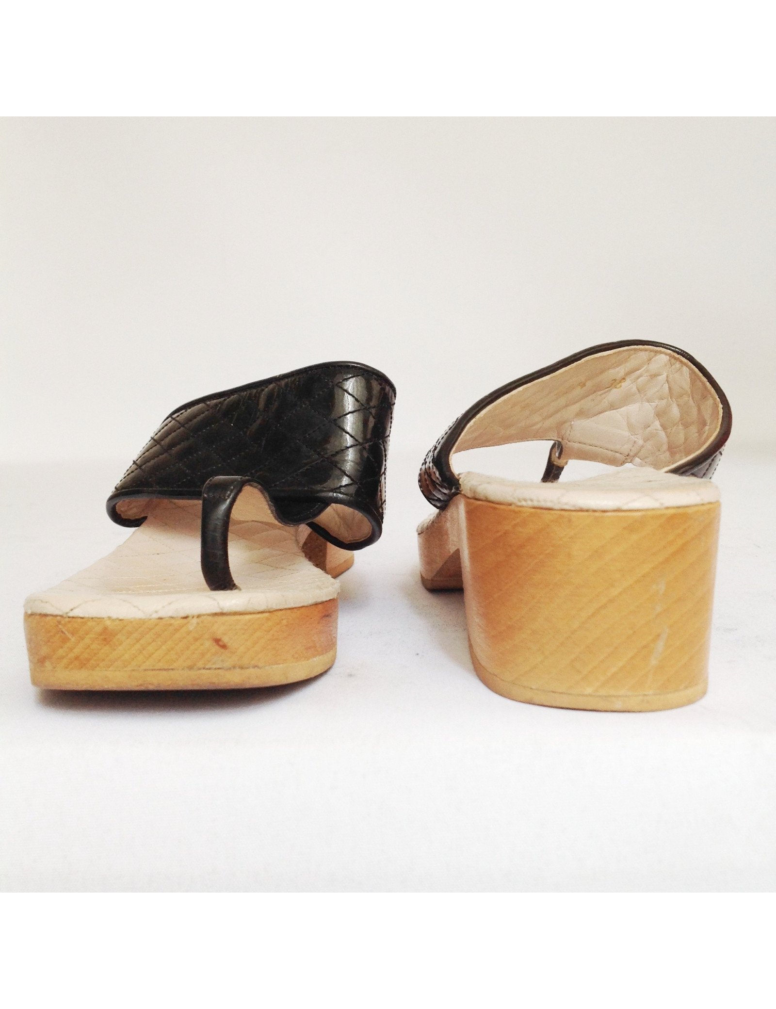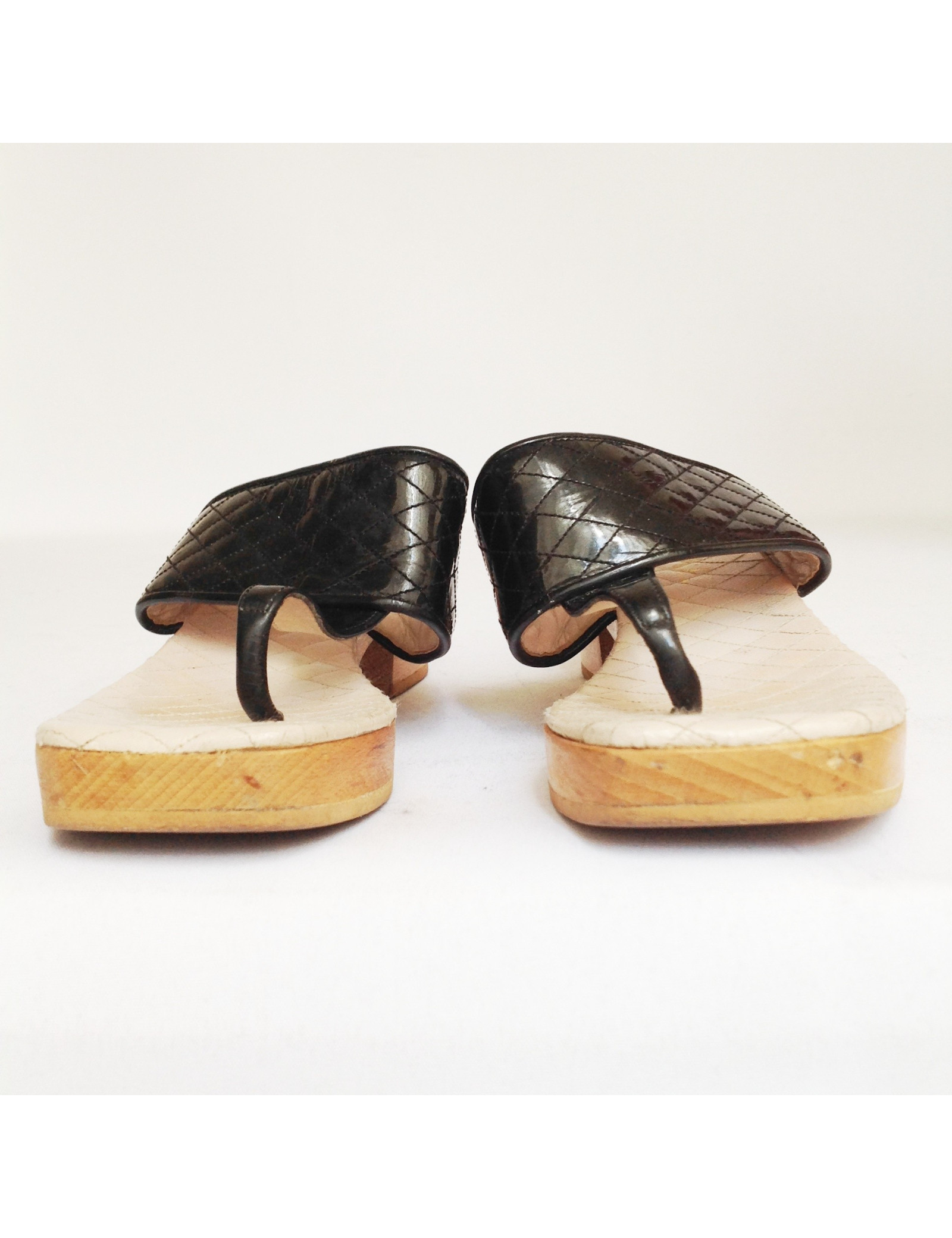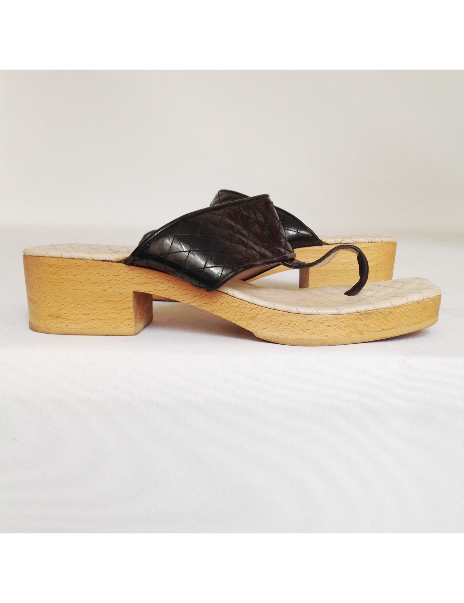 Hooves T38 Chanel quilted Black patent leather and soles in light brown wood. Manufactured in France. In good condition. The sole is slightly faded.
