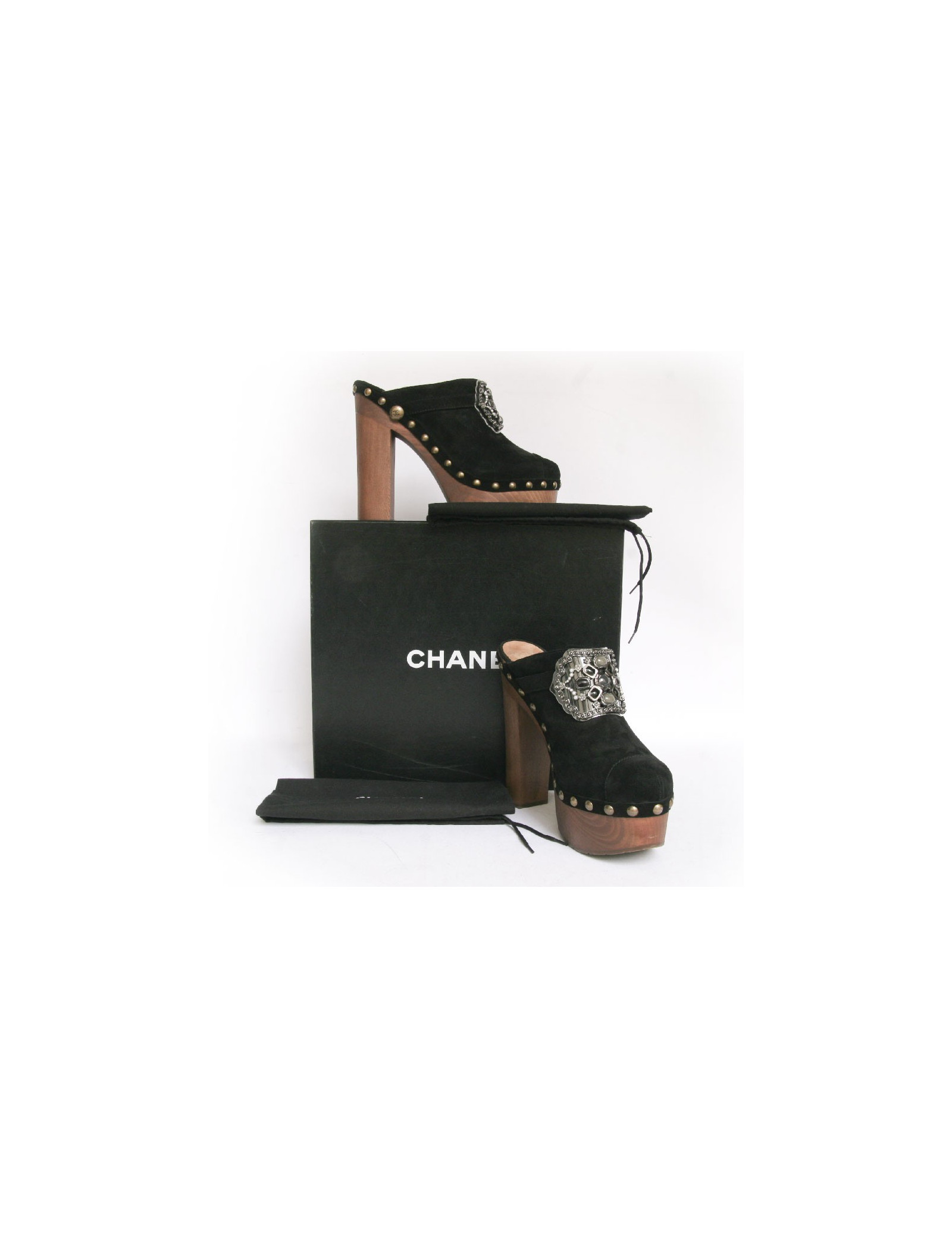 Chanel wooden and Black Suede mules. Size 41. The heel and sole are wooden. They have a jewel of colors black, green and silver. In very good condition. Public price 1800 euros.