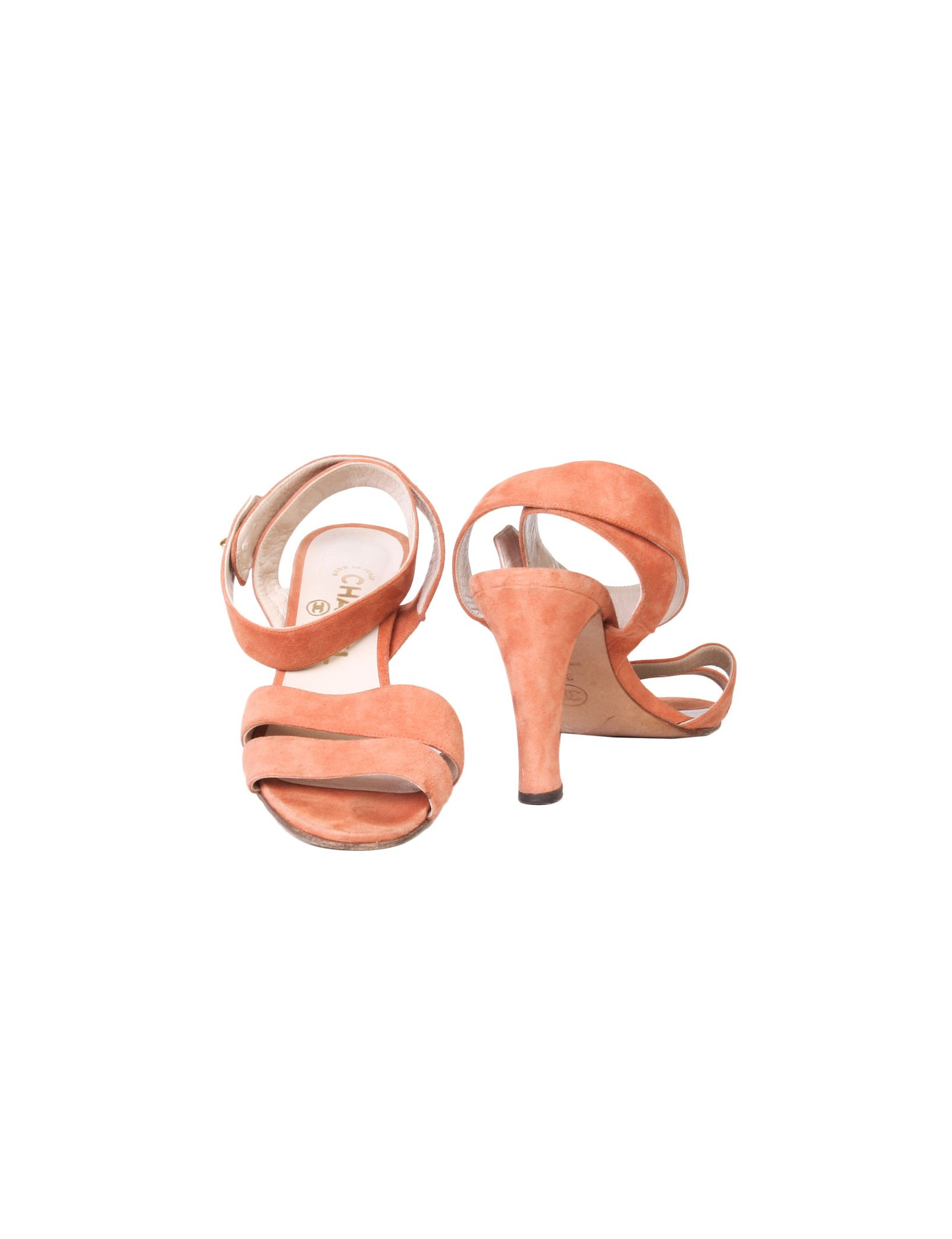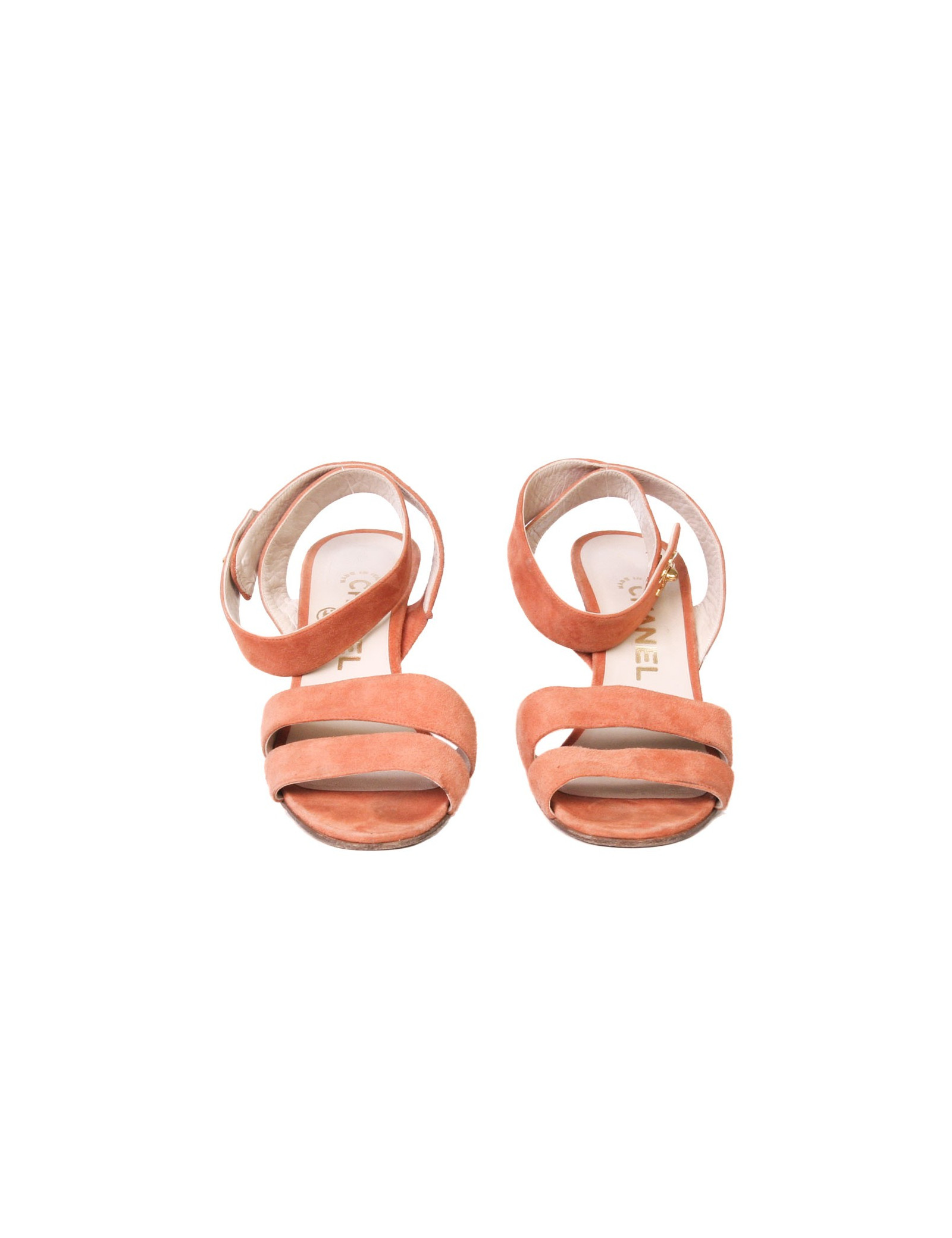 Lovely pair of high Sandals of the House of Chanel in coral-colored suede. Size 38.5. They attach using a 'CC' brass clasp gold ankle. In very good condition. They were laid and indicate slight traces to erase.