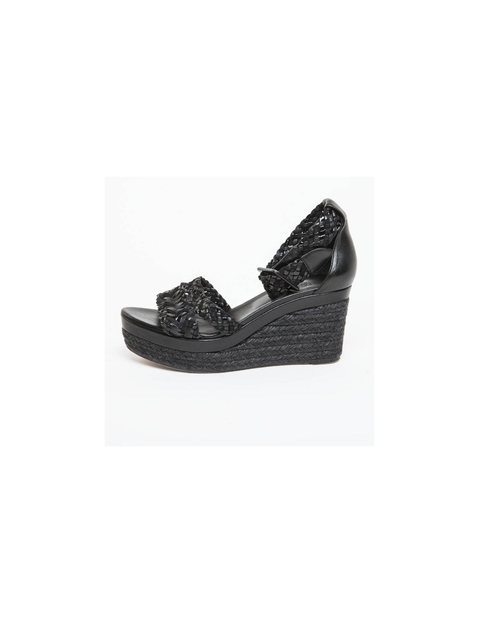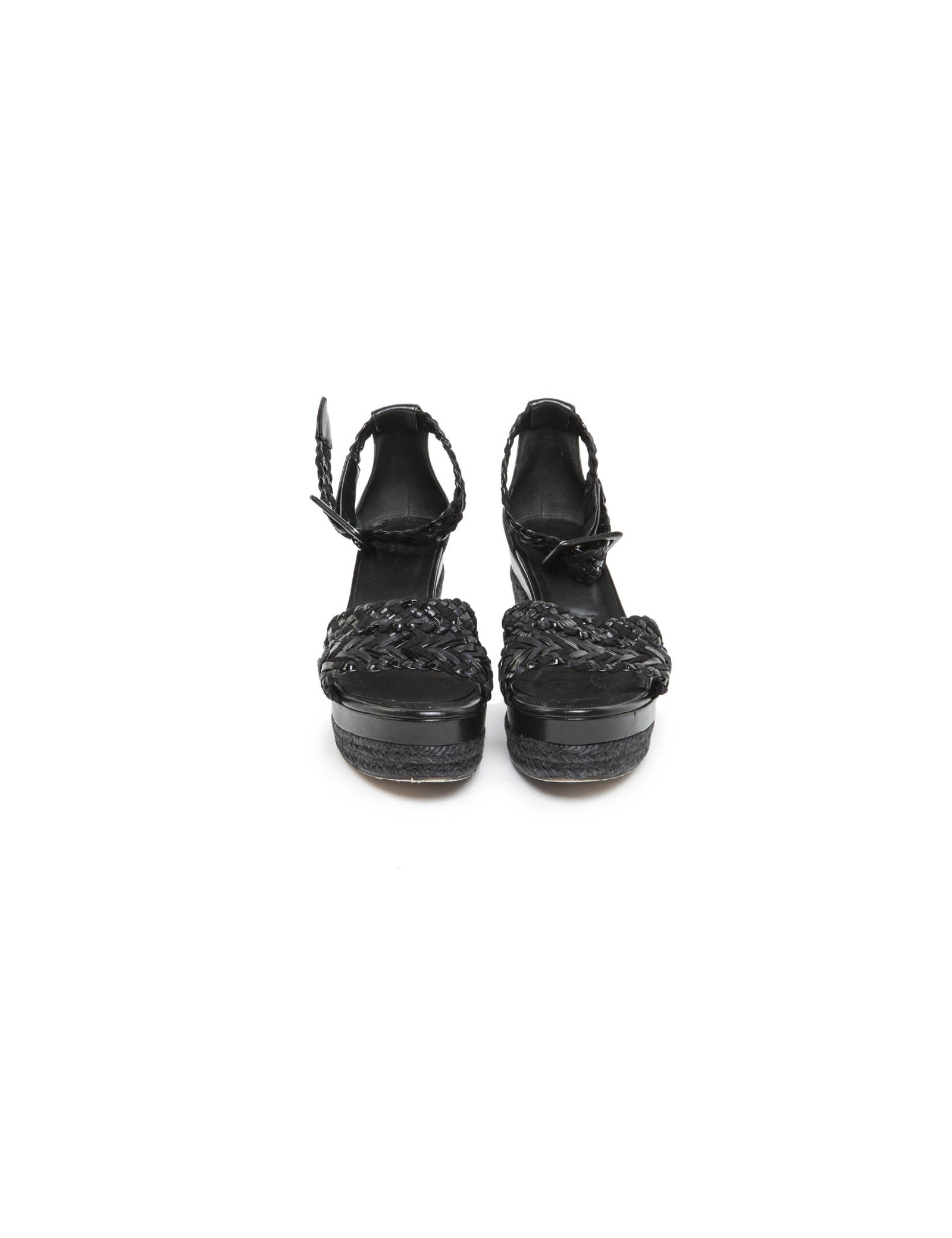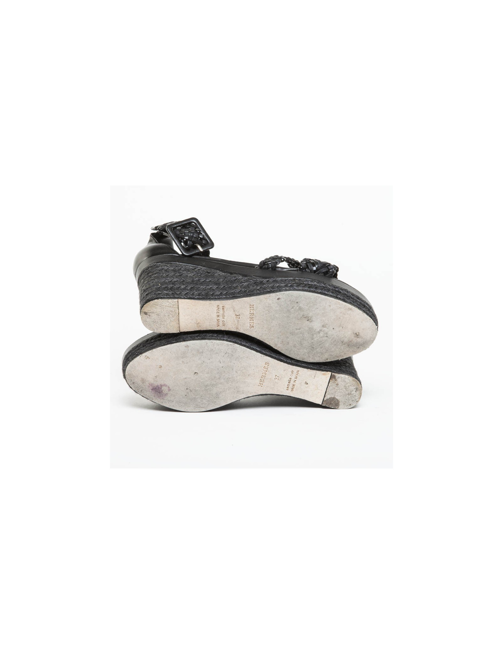 Sandales hautes compensées en cuir tressé noir mate et brillant de la Maison Hermès. Taille 37. Semelle en cuir.