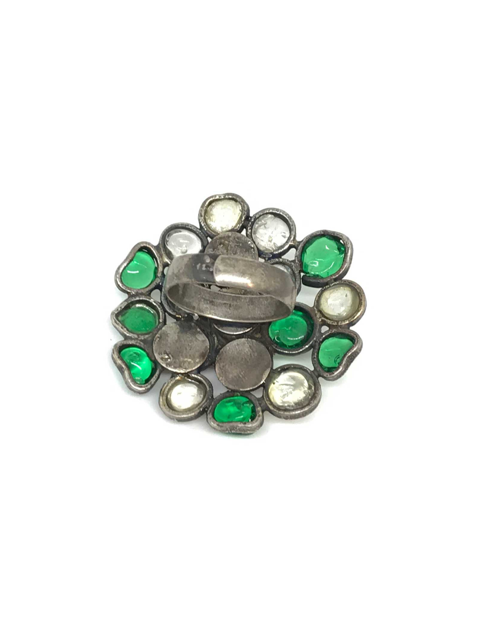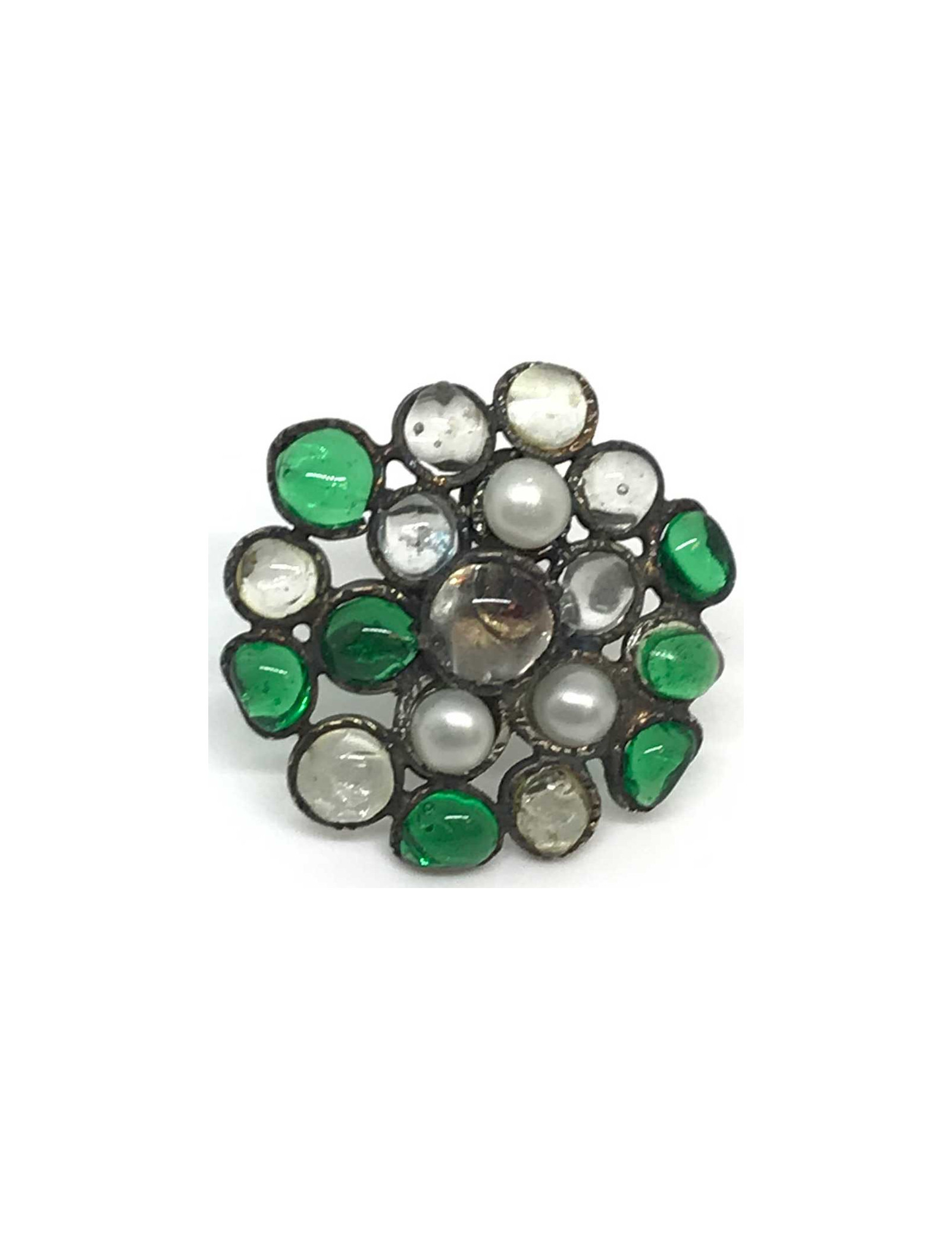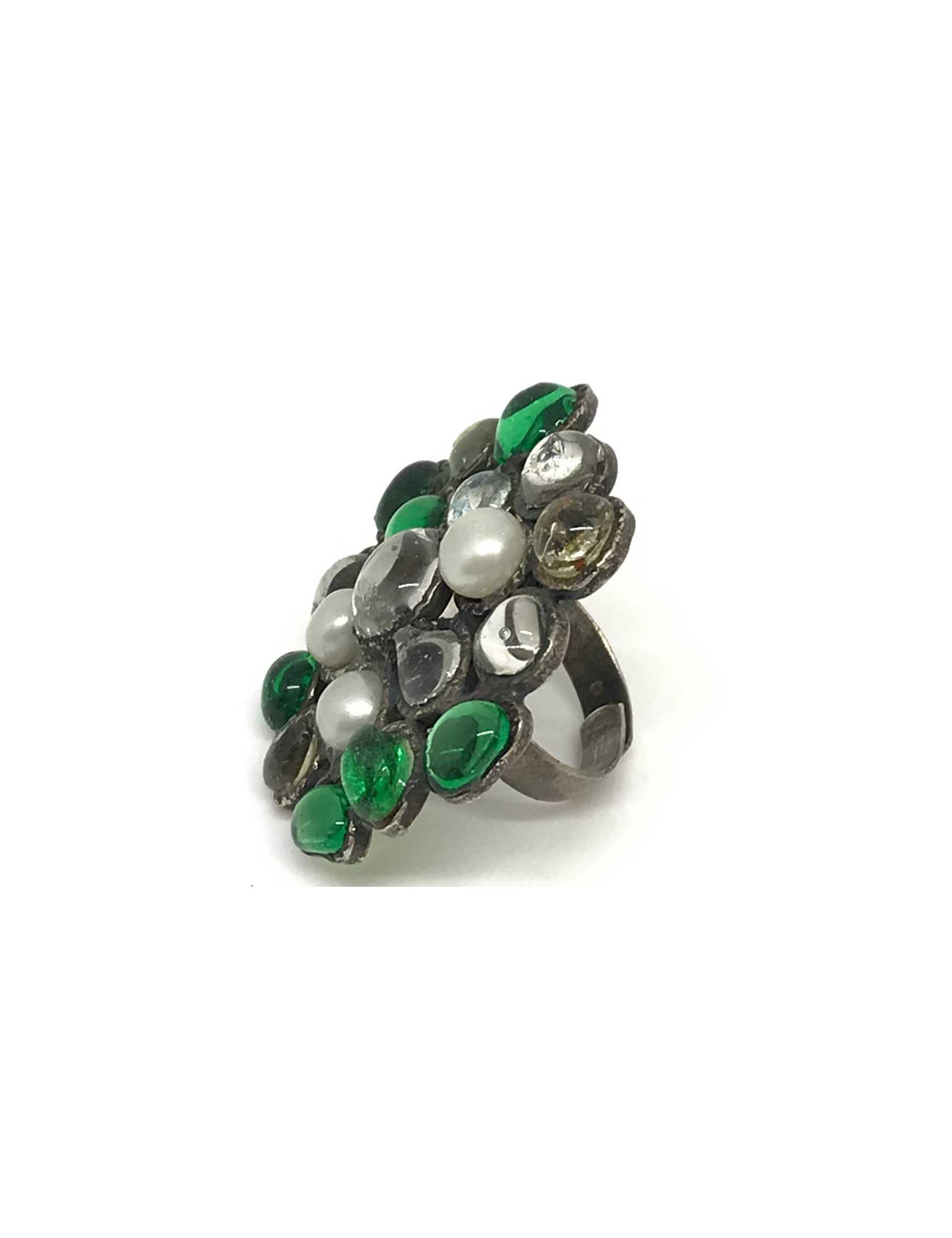 Last items in stock RINGS MARGUERITE DE VALOIS molten glass ring MARGUERITE DE VALOIS 14618 220.00 € MARGUERITE DE VALOIS molten glass ring Made in FranceCondition: very goodMaterials: molten glass, Swarovski crystals, metalColors: silver, anise, lavenderMeasurements: diameter: 3cmSize: one size fits all (adjustable)Details: Marguerite de Valois round ring, composed of four mauve and anise green molten glass and Swarovski rhinestones. Ring in black... Add to cart