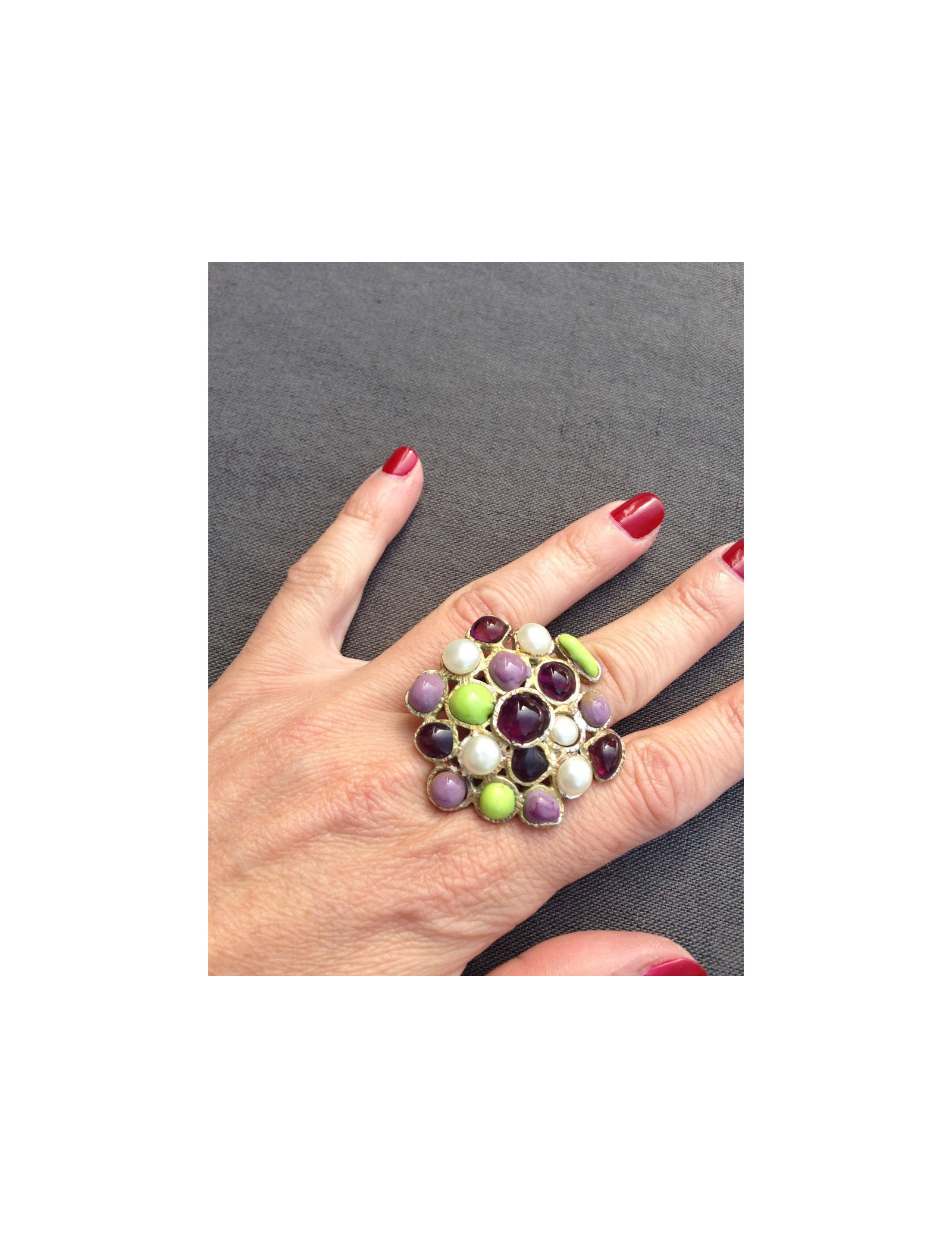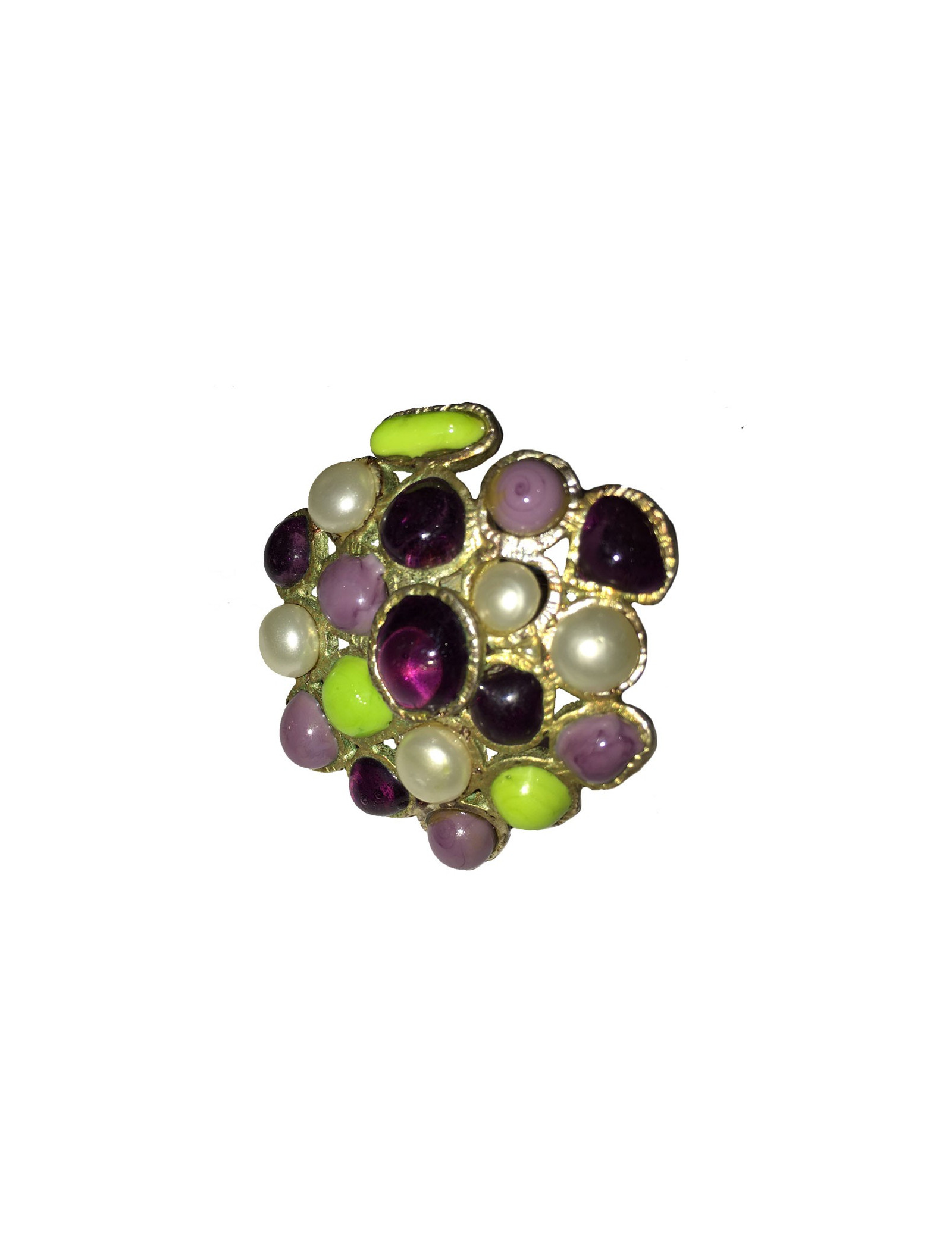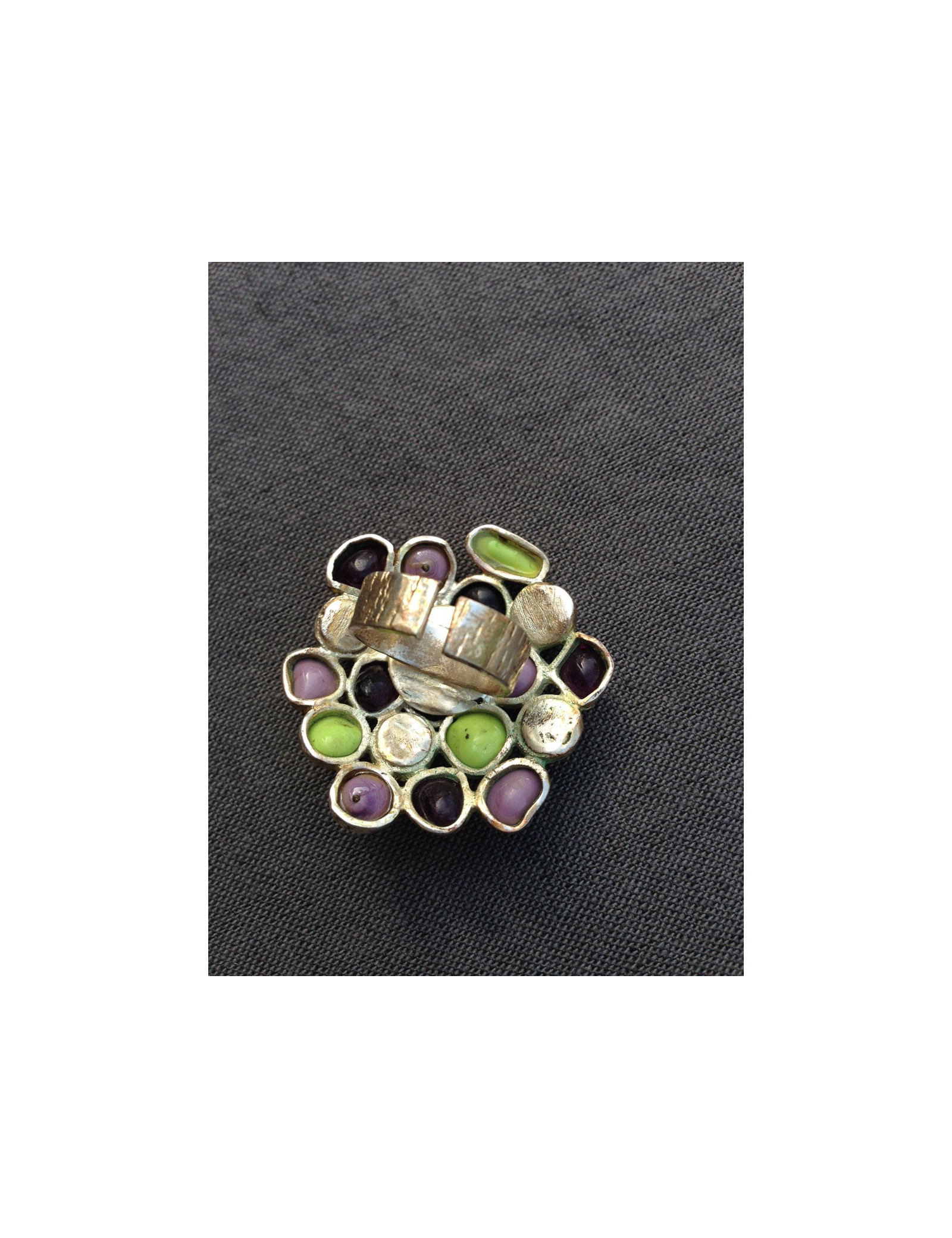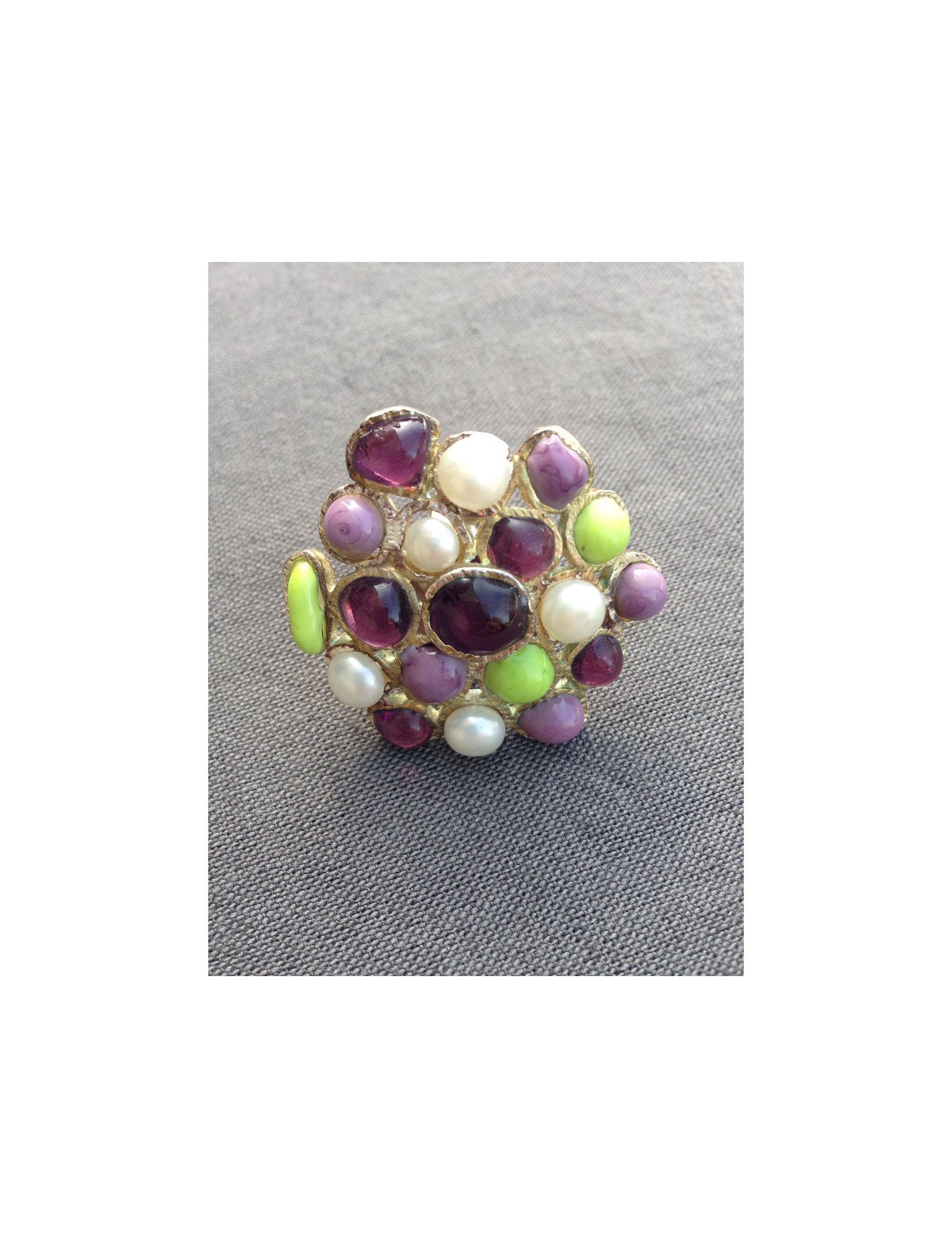 Ring style Byzantine Marguerite de Valois purple glass transparent, aniseed green and purple translucent and Pâte de verre pearly, all mounted on metal Golden to pale gold.
