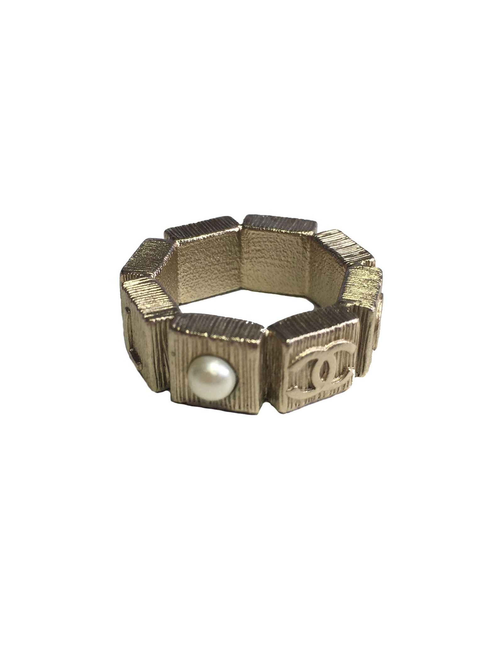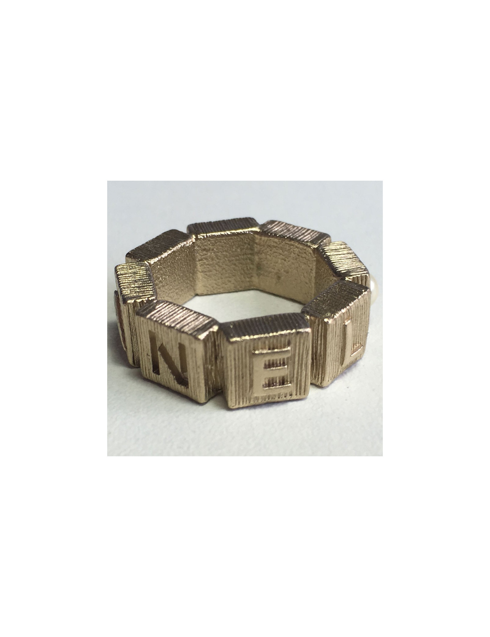 Beautiful metal color ring CHANEL pale hammered gold set with a little Pearly Pearl. A CC and CHANEL on the back of the ring. In very good condition. Lozenge of the brand presents.
