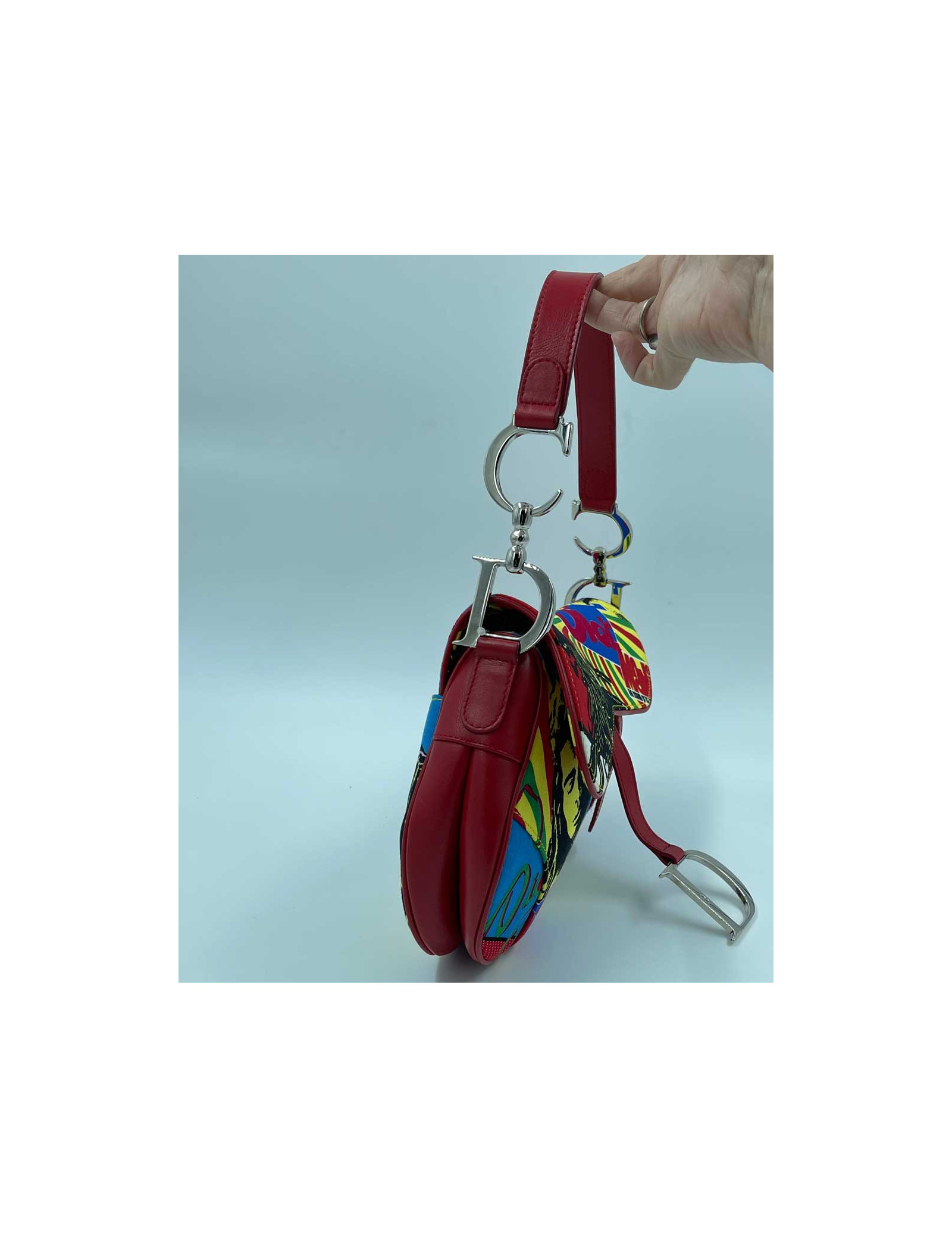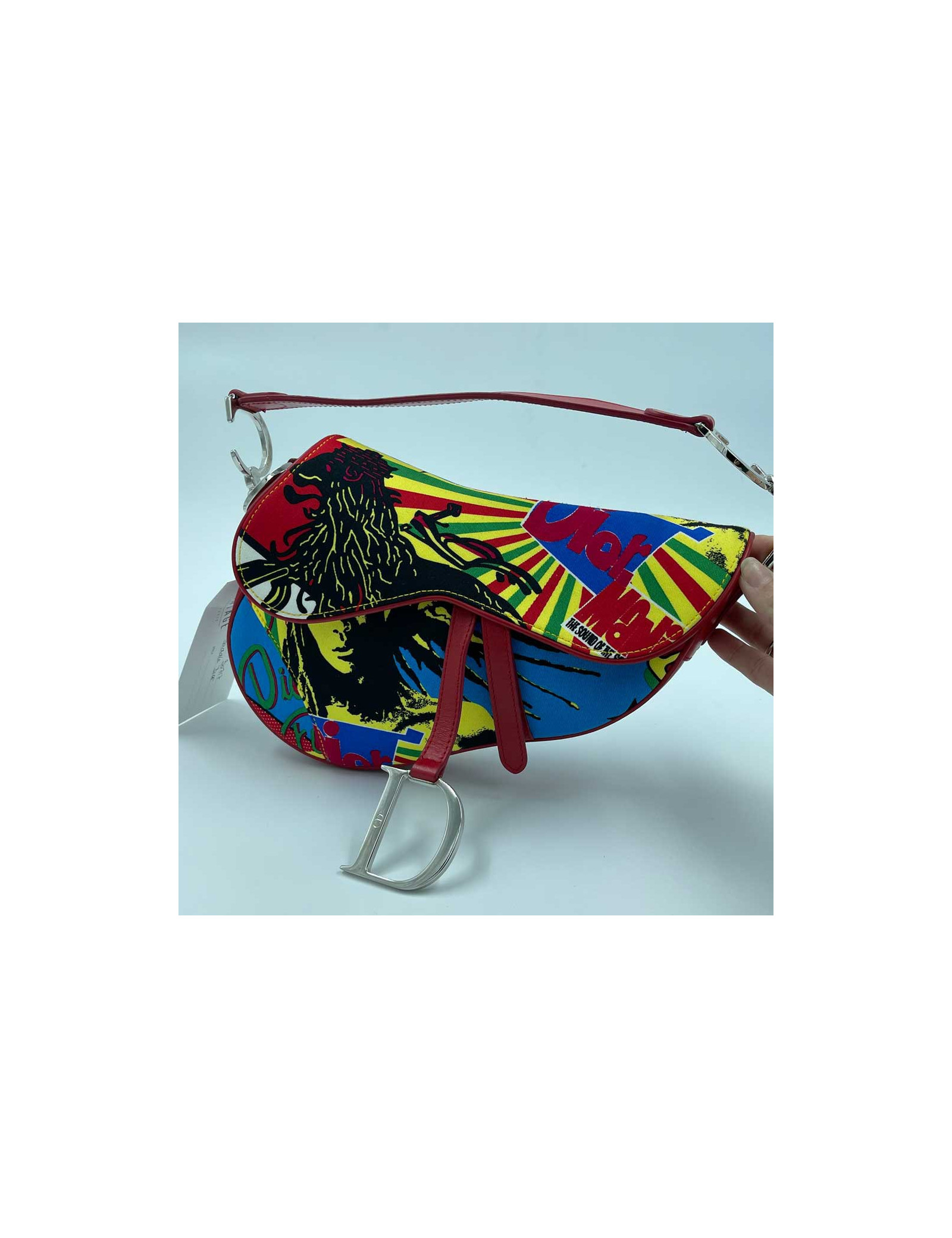 Collector's Edition released in 2003, this Italian-made bag is in very good condition. The cotton canvas is red, blue, yellow, green, black with representations of Bob Marley in the background. Velcro flap closure.