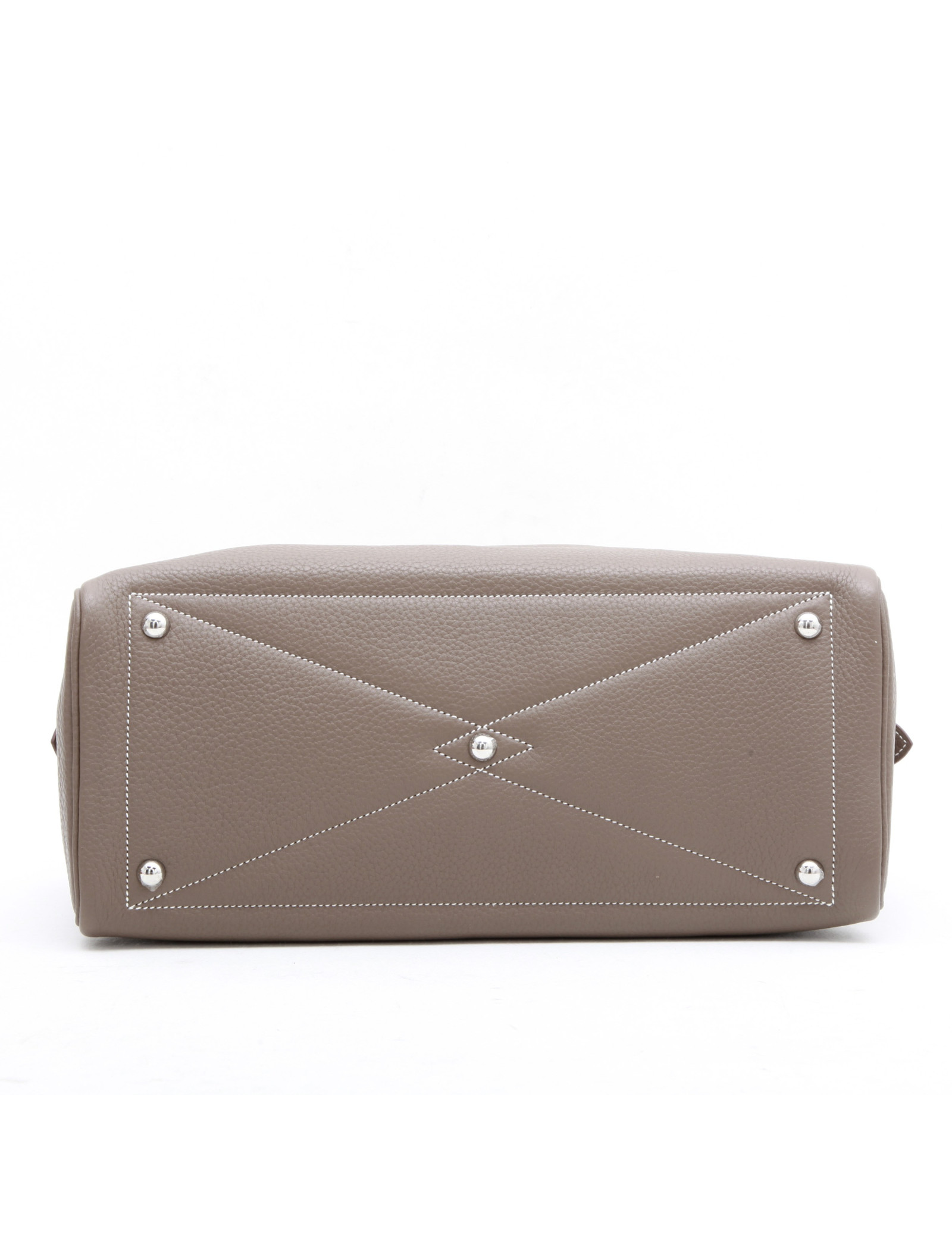 Hermes Victoria bag in étoupe clémence taurillon leather, with white saddle stitching. The interior is in chevron fabric.