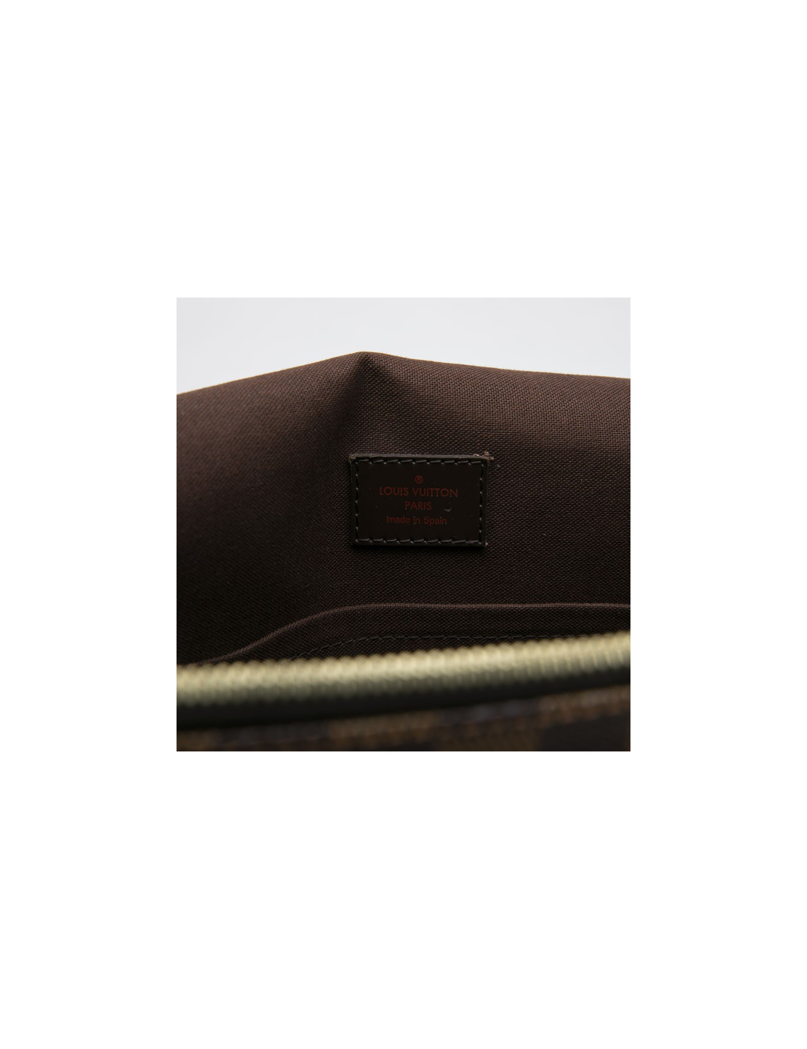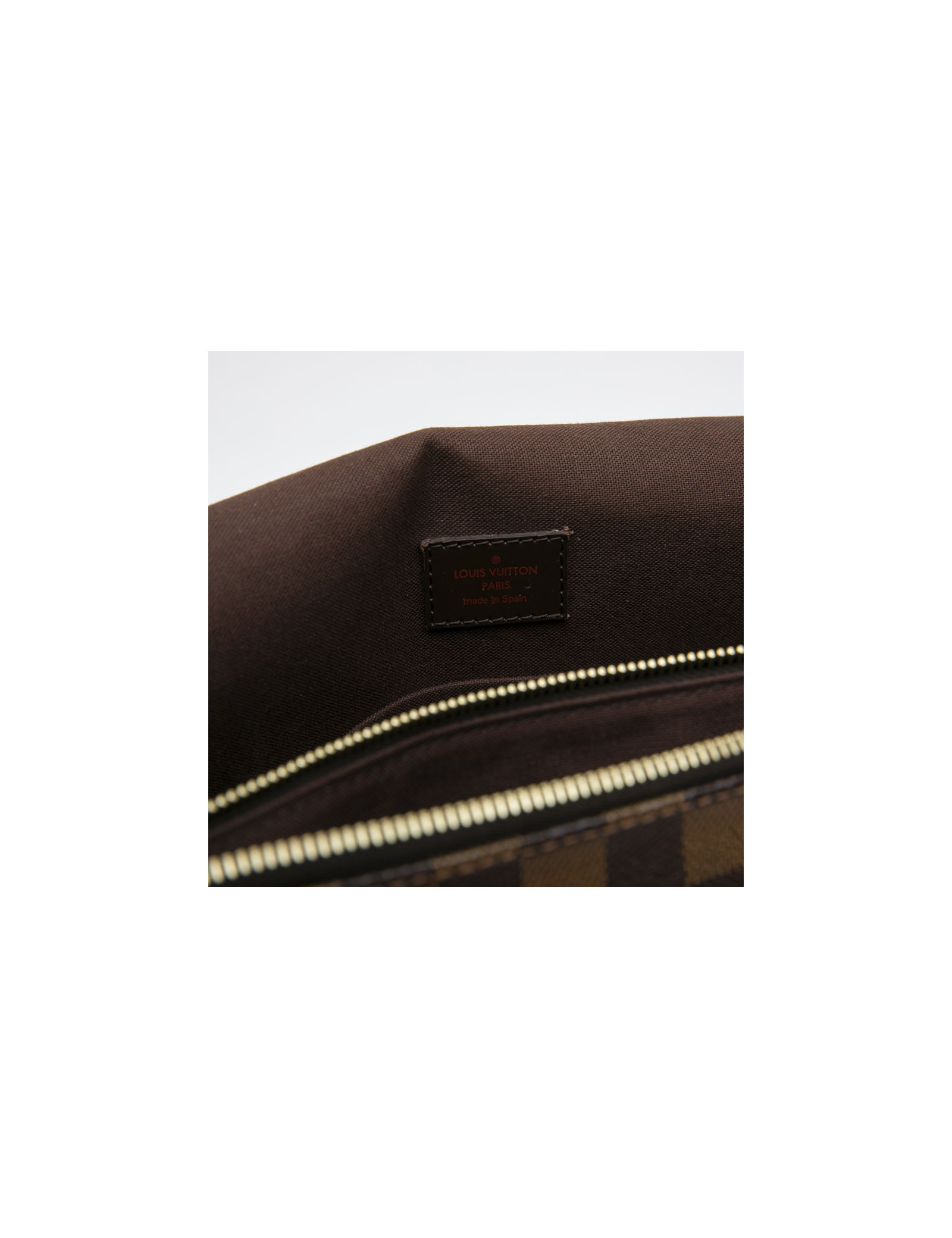 The inner lining is in brown fabric with 2 slit pockets and one zippered pocket. A zipped pocket on the back of the bag.
