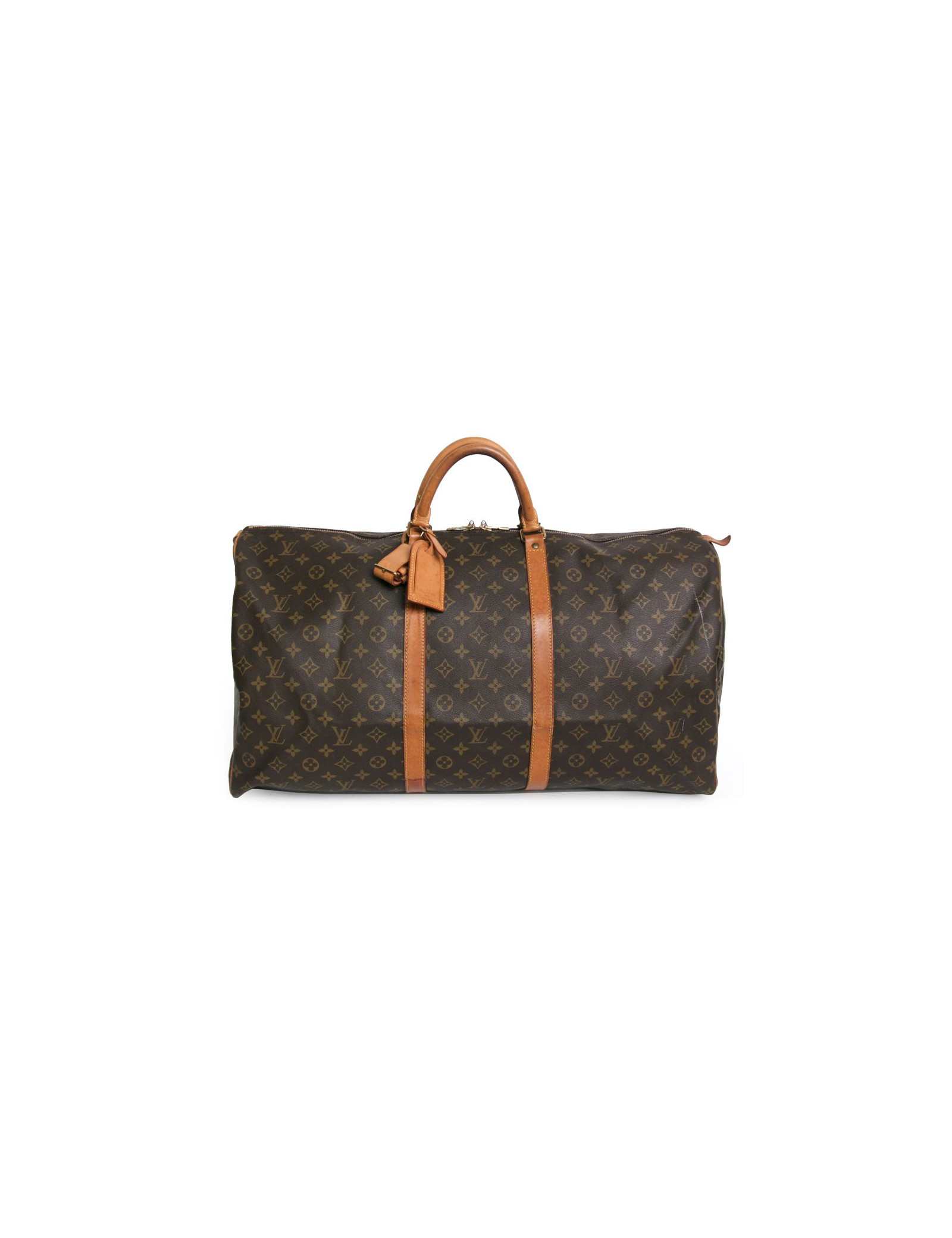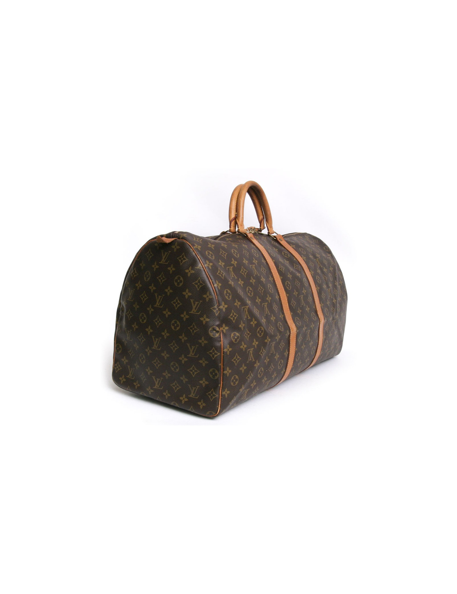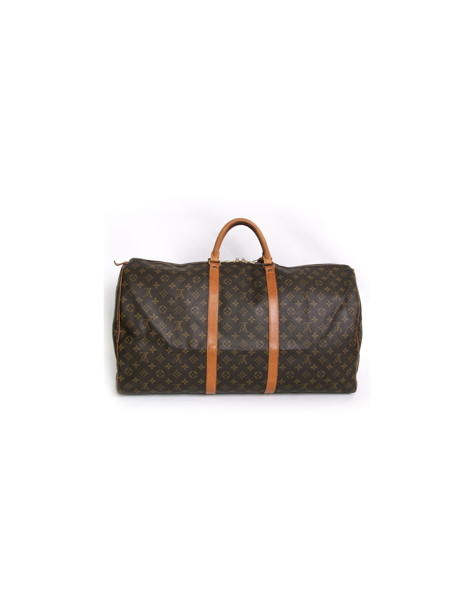"Keepall 60" bag of the Maison Louis Vuitton monogram canvas. An icon since its inception in 1930. The followers of the art of making her suitcase can easily slide into its generous size, the business necessary for a week. Les pièces métalliques sont en laiton doré. Fermeture zippée. Porté main à l'aide de deux poignées. Porte nom. La doublure est en toile marron. Les parements sont en cuir de vache naturel. Patinage du cuir. Légère usure sur les coins sous le sac. Deux fines traces blanches sur le côté. Voir photos.