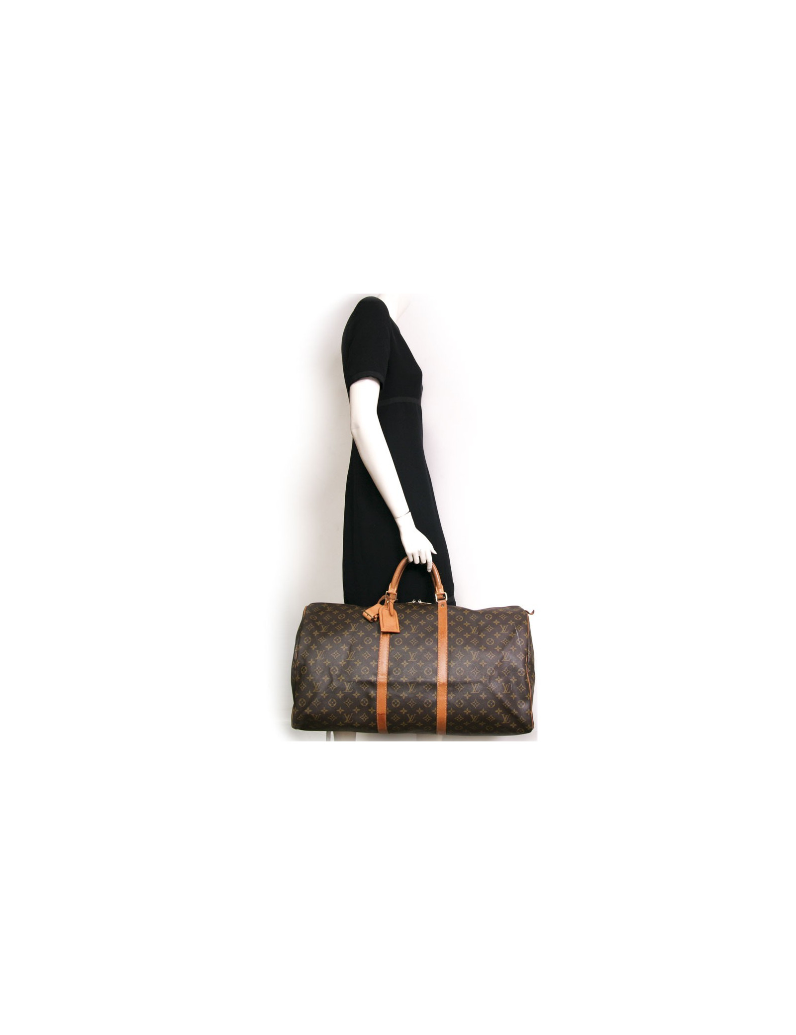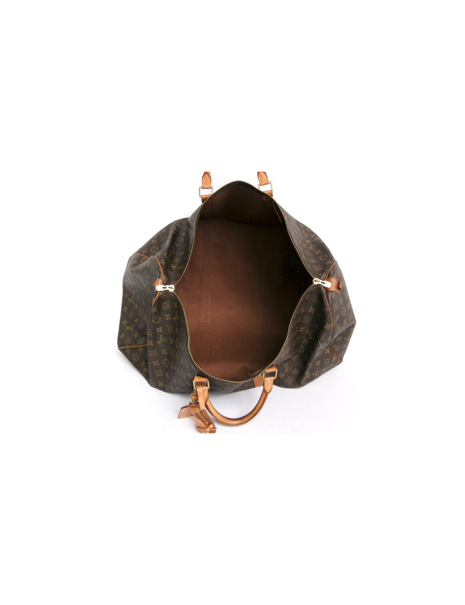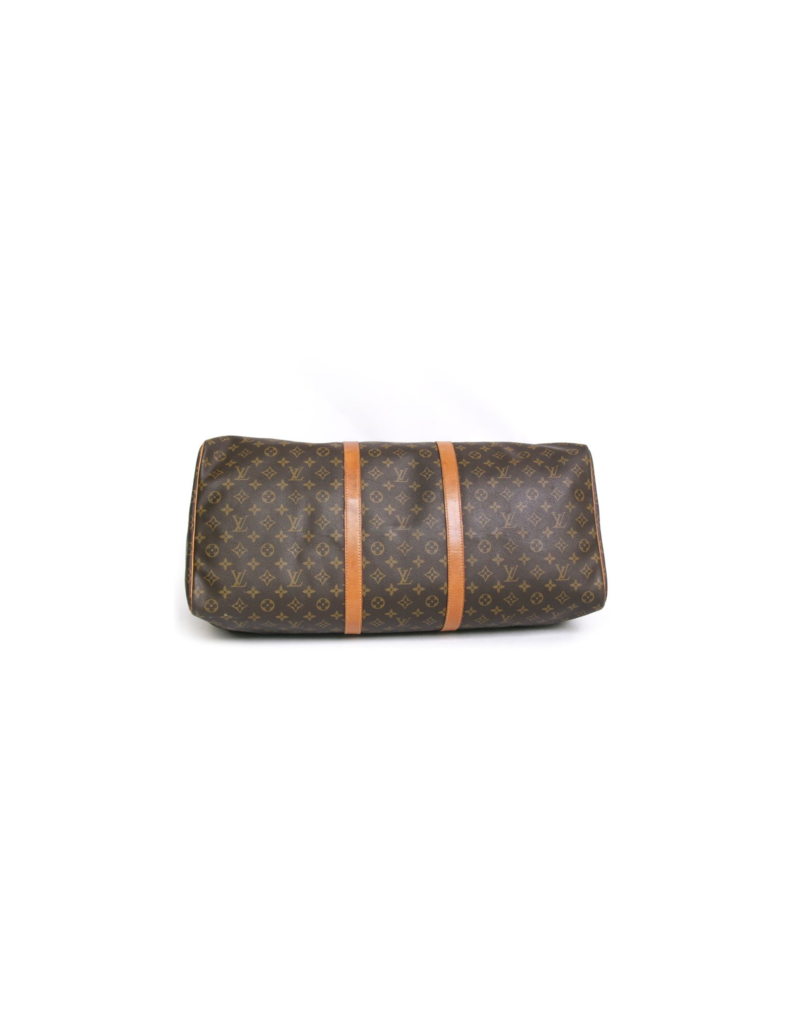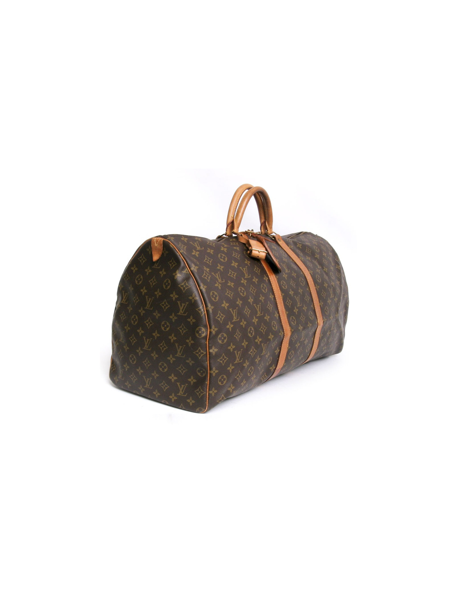 "Keepall 60" bag of the Maison Louis Vuitton monogram canvas. An icon since its inception in 1930. The followers of the art of making her suitcase can easily slide into its generous size, the business necessary for a week. Les pièces métalliques sont en laiton doré. Fermeture zippée. Porté main à l'aide de deux poignées. Porte nom. La doublure est en toile marron. Les parements sont en cuir de vache naturel. Patinage du cuir. Légère usure sur les coins sous le sac. Deux fines traces blanches sur le côté. Voir photos.