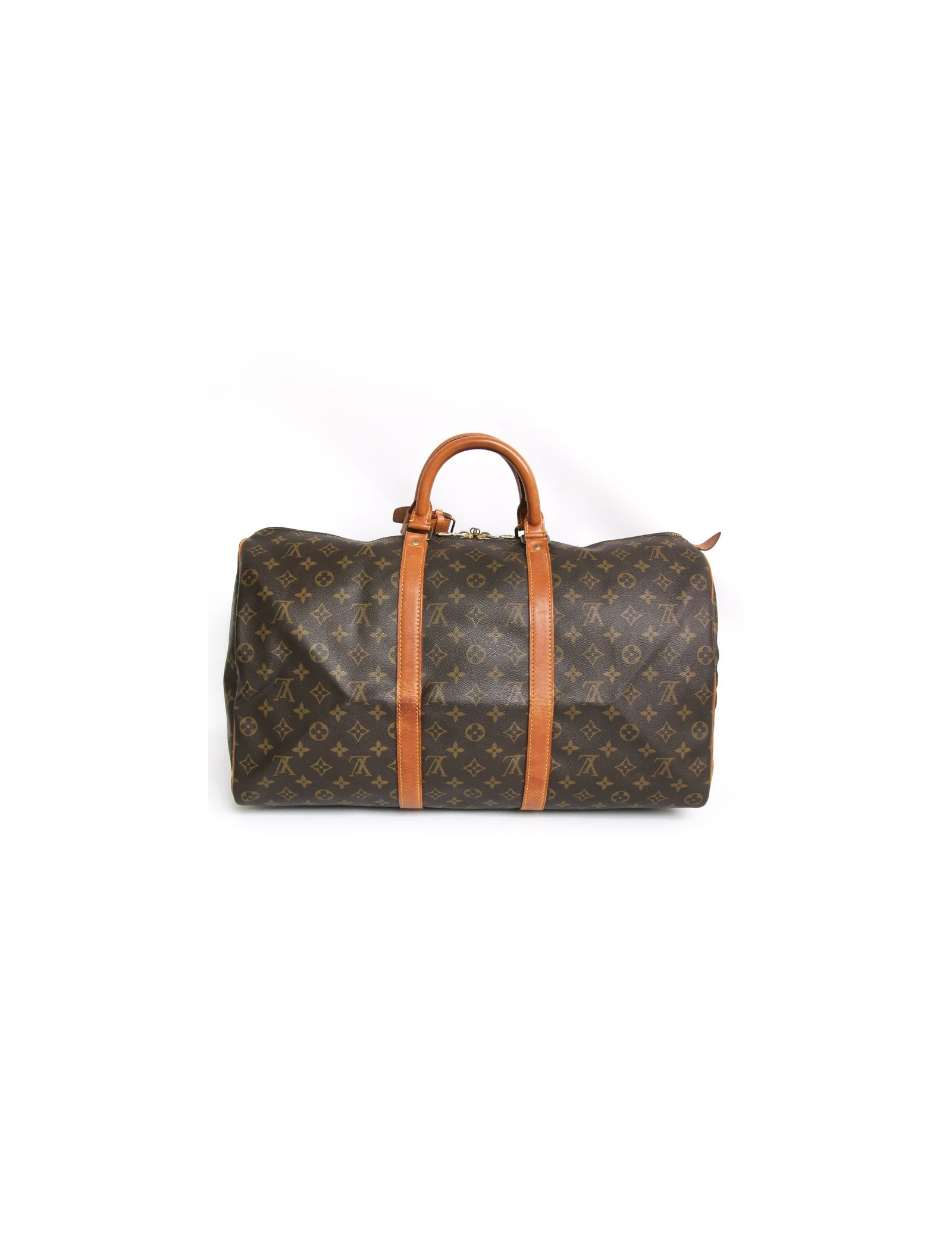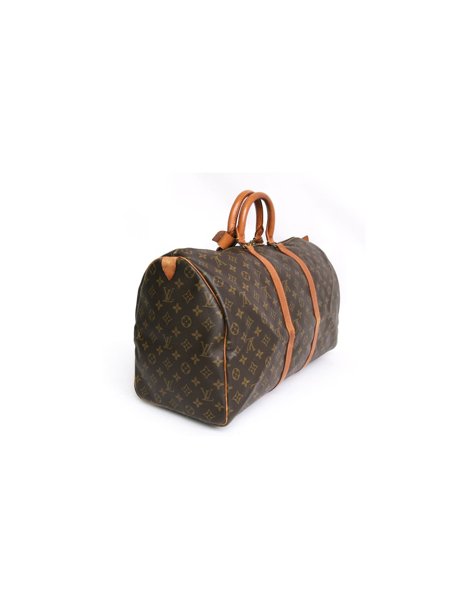 "Keepall 50" bag of the Maison Louis Vuitton monogram canvas. An icon since its inception in 1930. Light, flexible and always ready for a start imminent but especially practical because of its cabin size. The metal parts are made of gilded brass. Zipped. Door hand using two handles. Door name. The lining is brown canvas. The facings are natural cowhide. In very good condition. Very light patina of leather. A few small marks of wear under the bag. See photos.