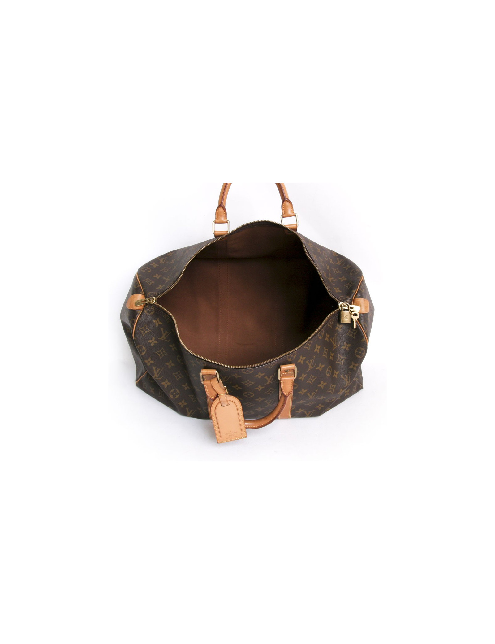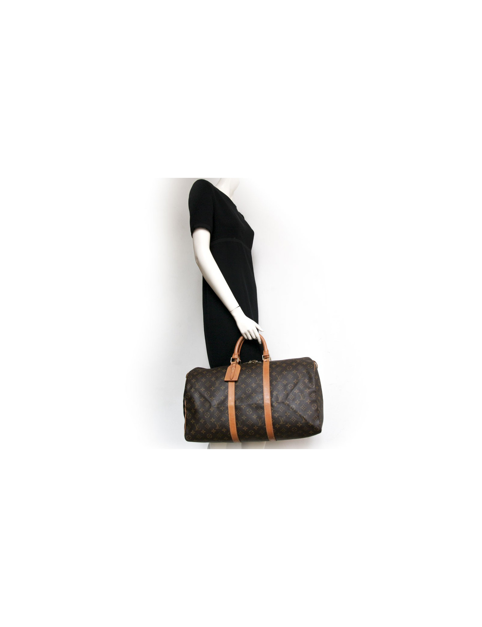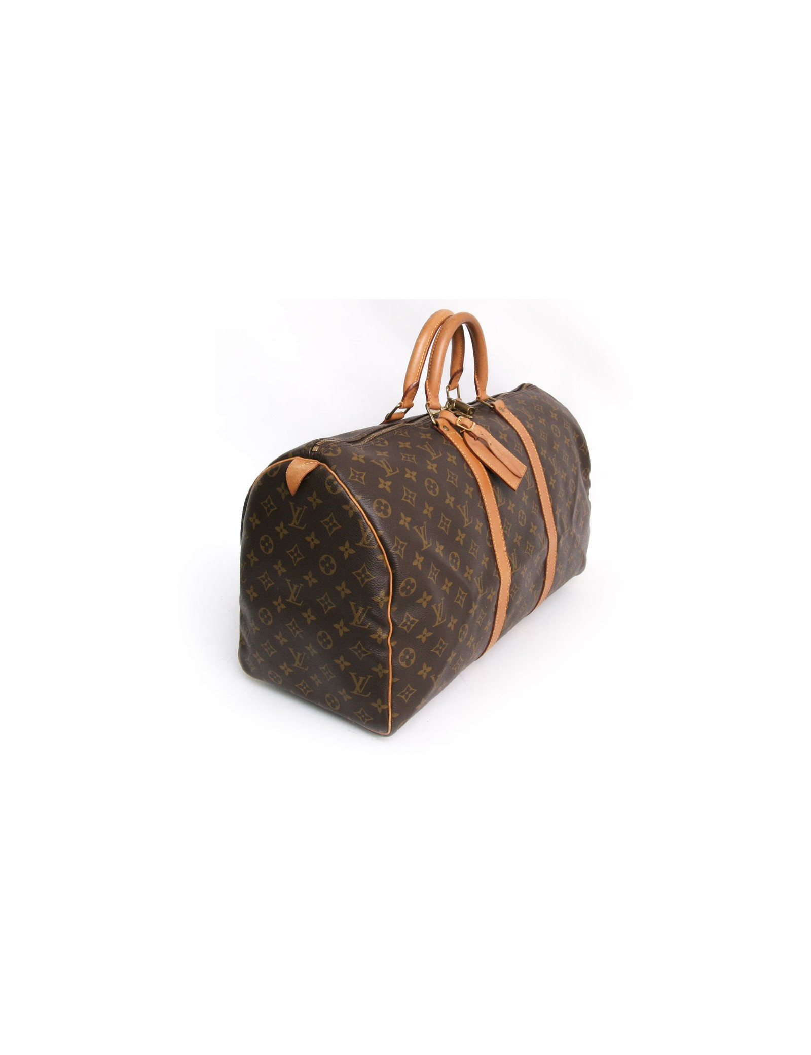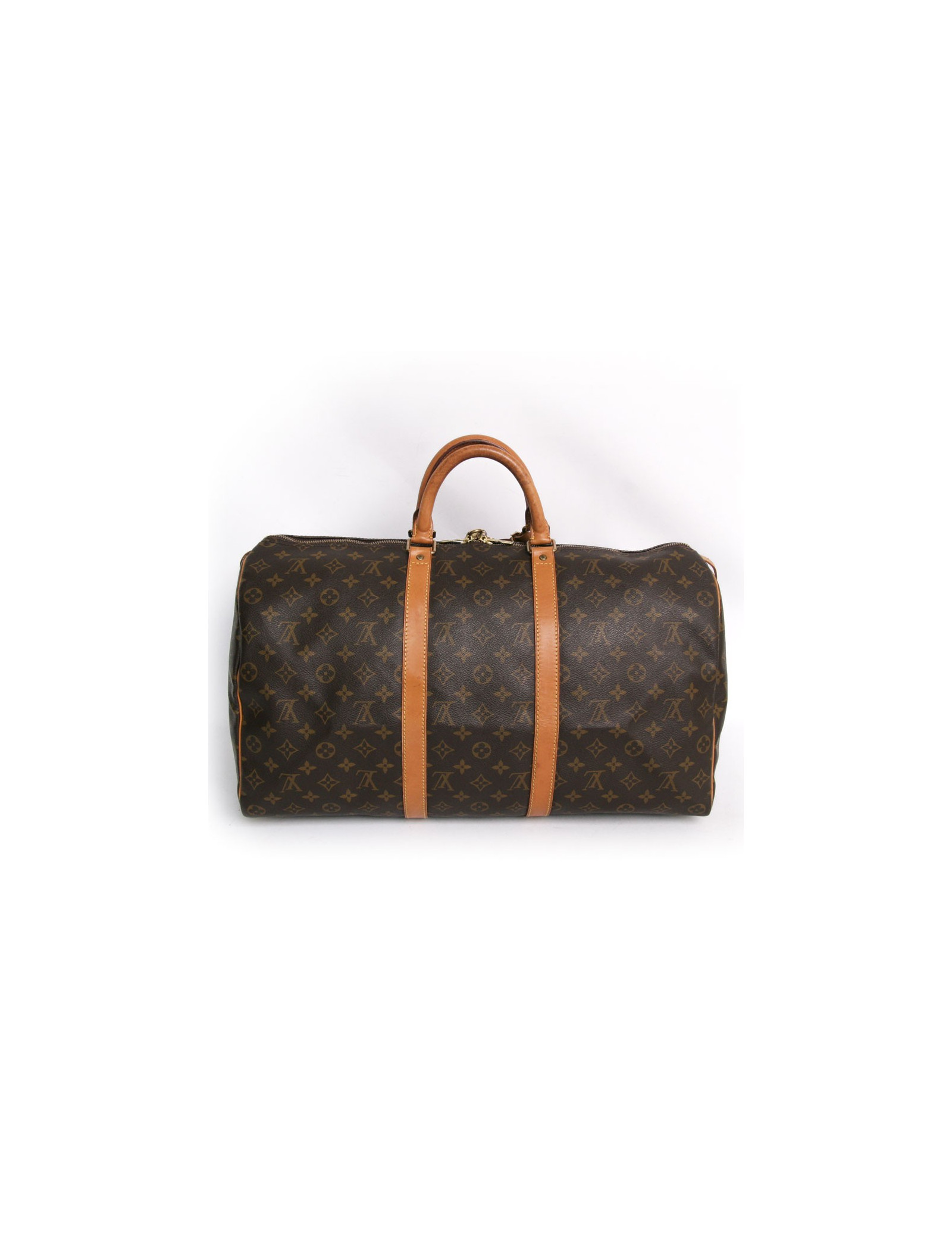 "Keepall 50" bag of the Maison Louis Vuitton monogram canvas. An icon since its inception in 1930. Light, flexible and always ready for a start imminent but especially practical because of its cabin size. The metal parts are made of gilded brass. Zipped. Door hand using two handles. Door name. The lining is brown canvas. The facings are natural cowhide. In very good condition. Very light patina of leather.