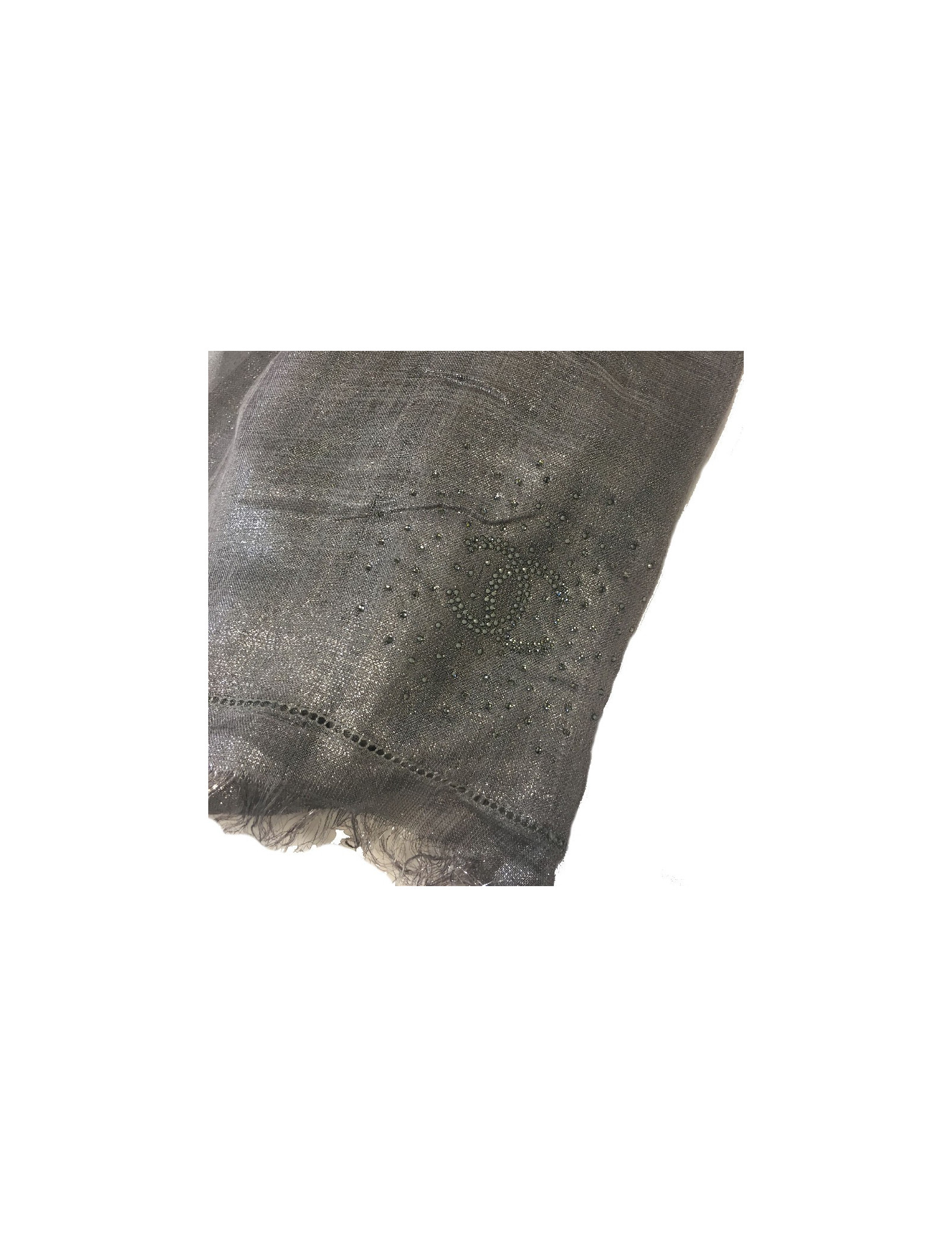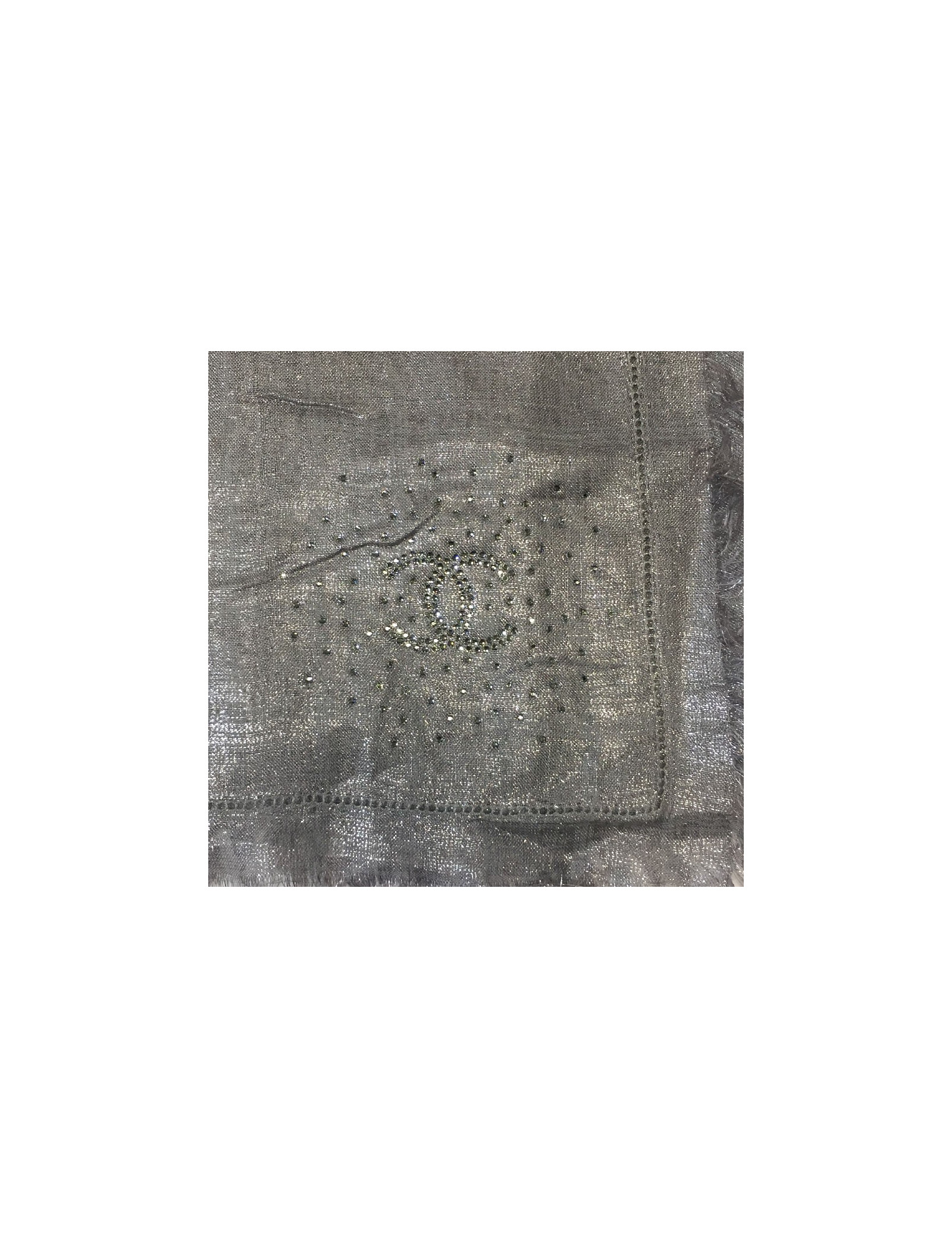 Very beautiful Chanel shawl with small fringes in grey modal, silk and cupro embellished with small silver threads. A rhinestone CC is at one end of the shawl.