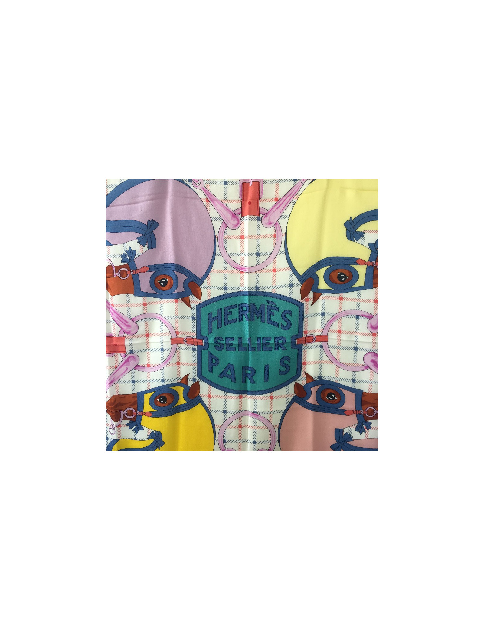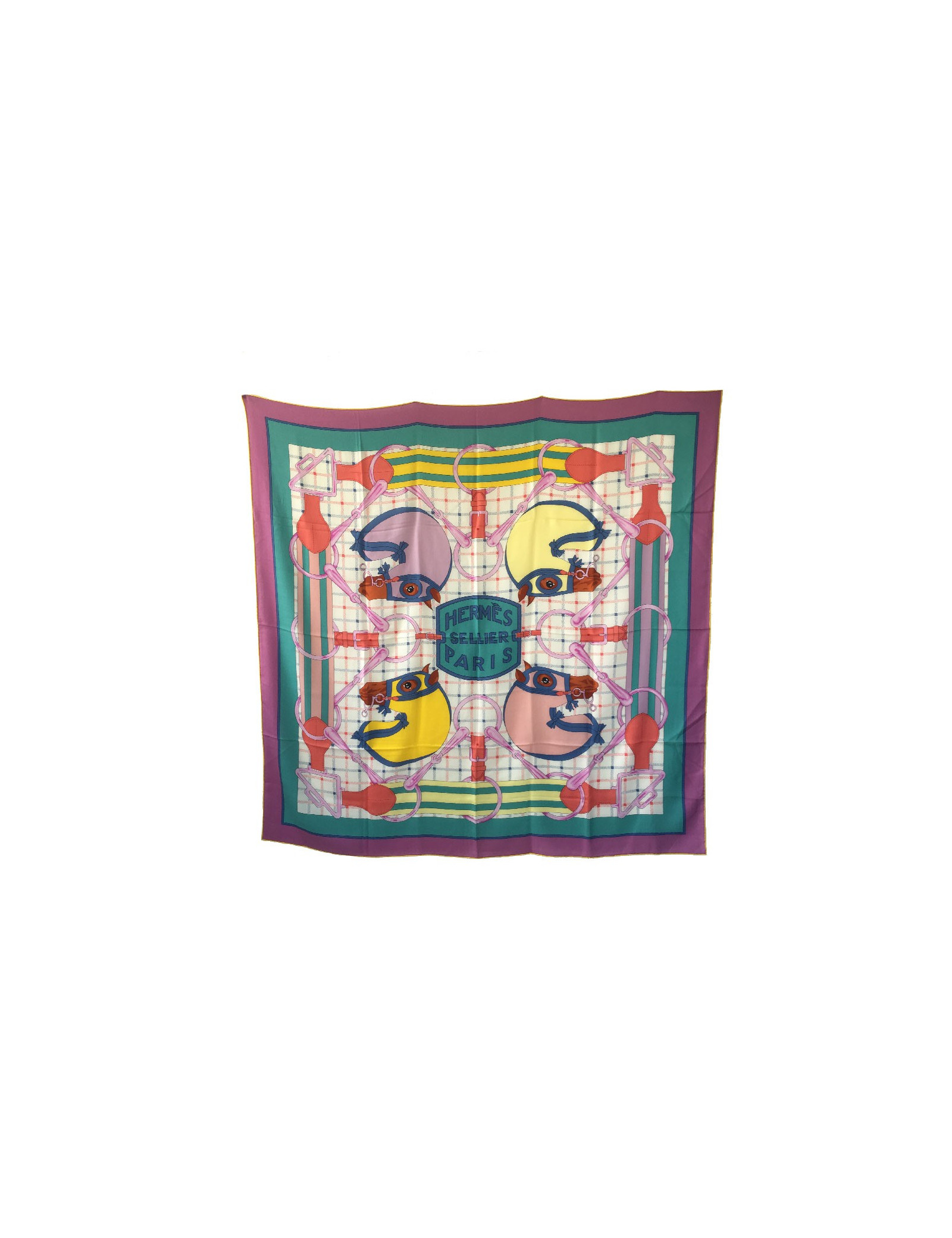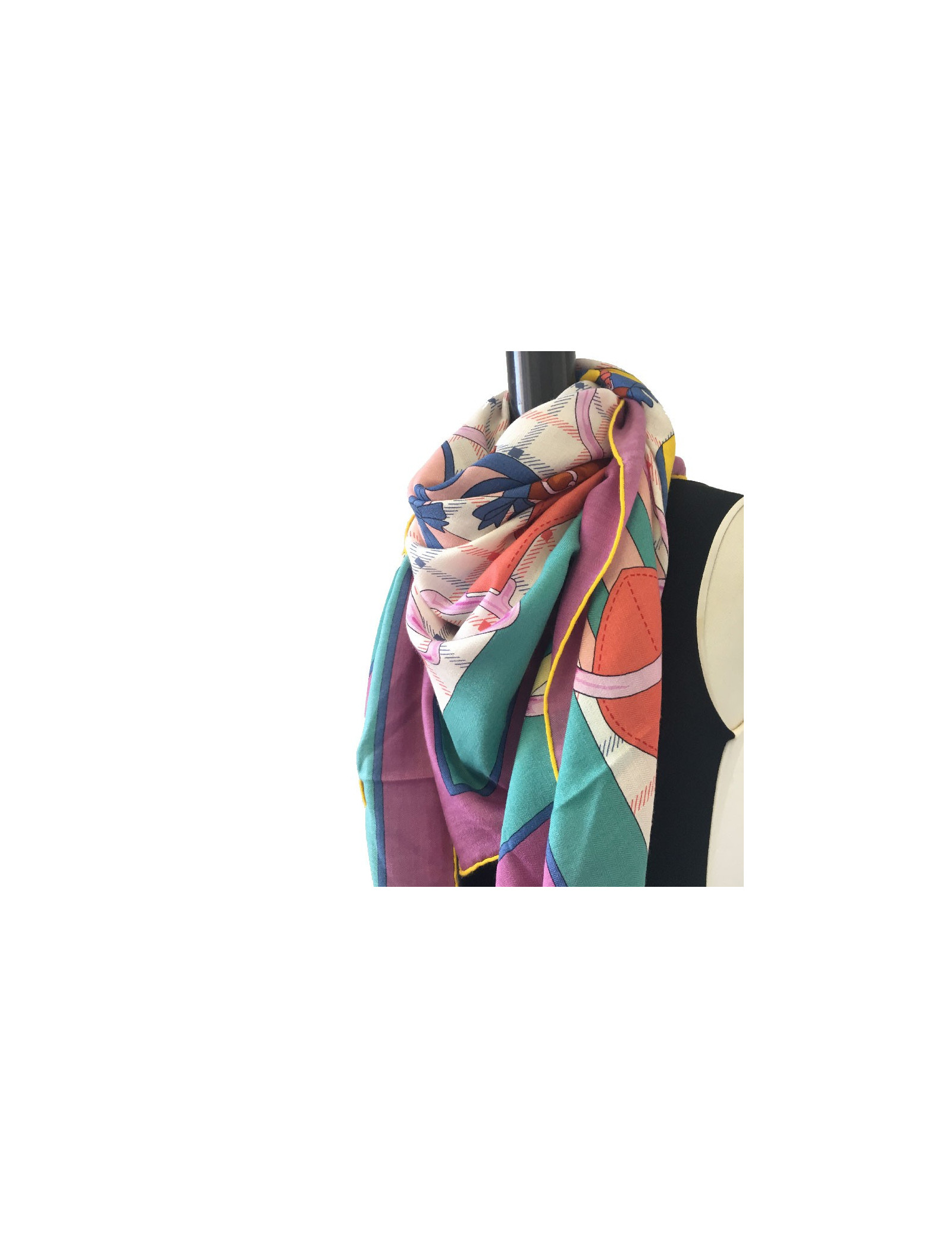 Hermès 'Sellier' shawl in cashmere and silk. Colors: purple, cream and bright yellow.