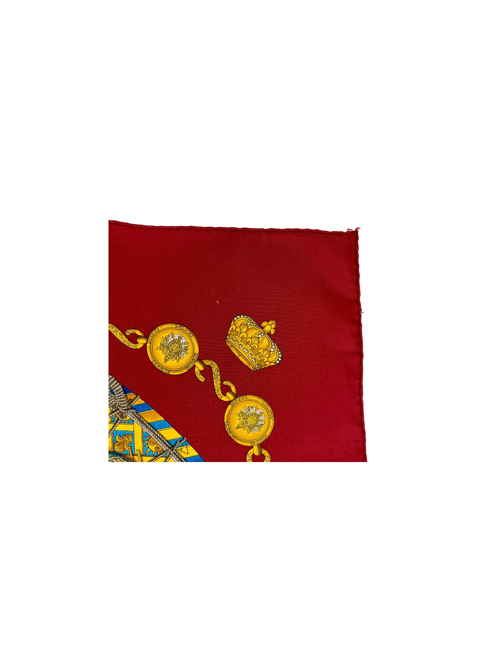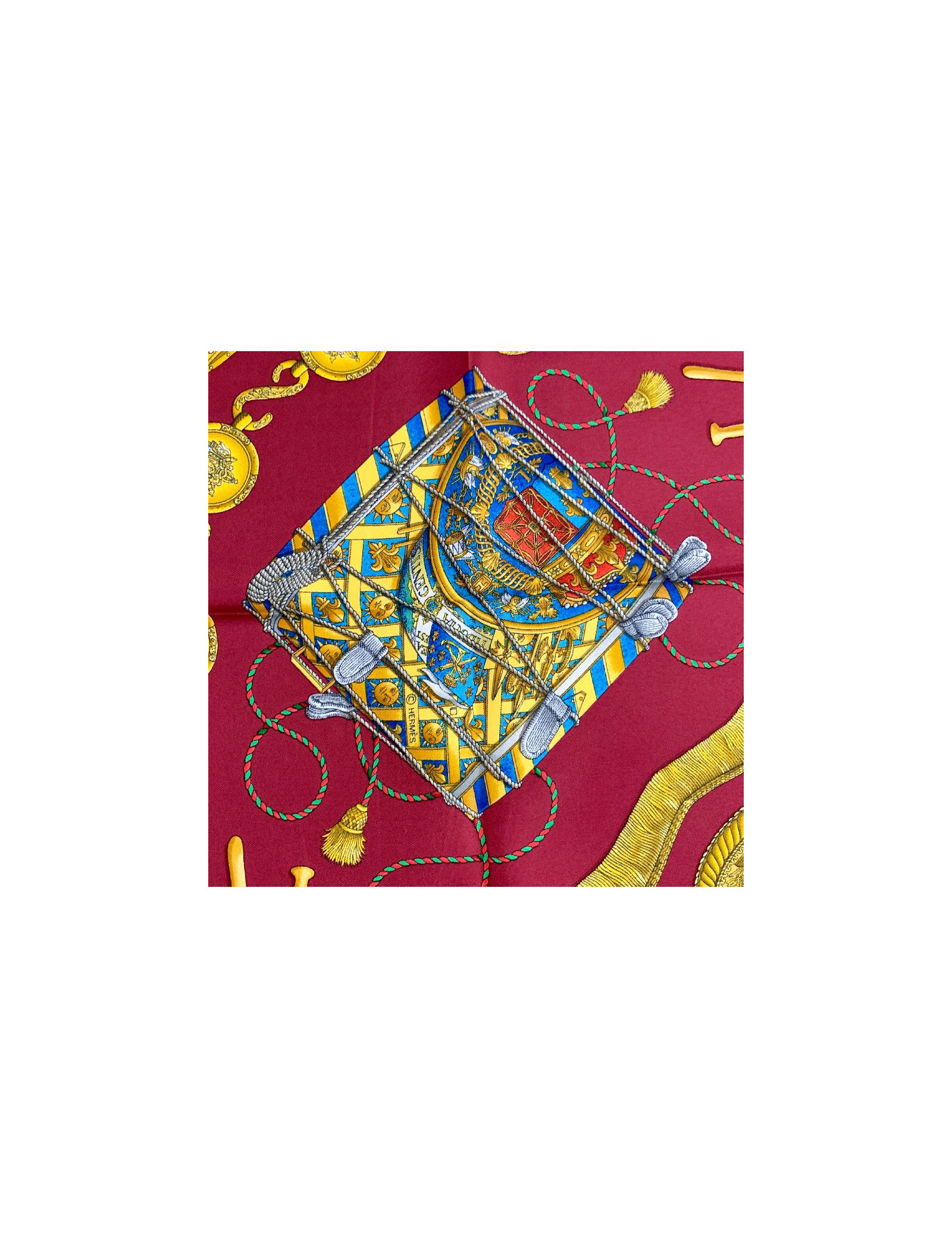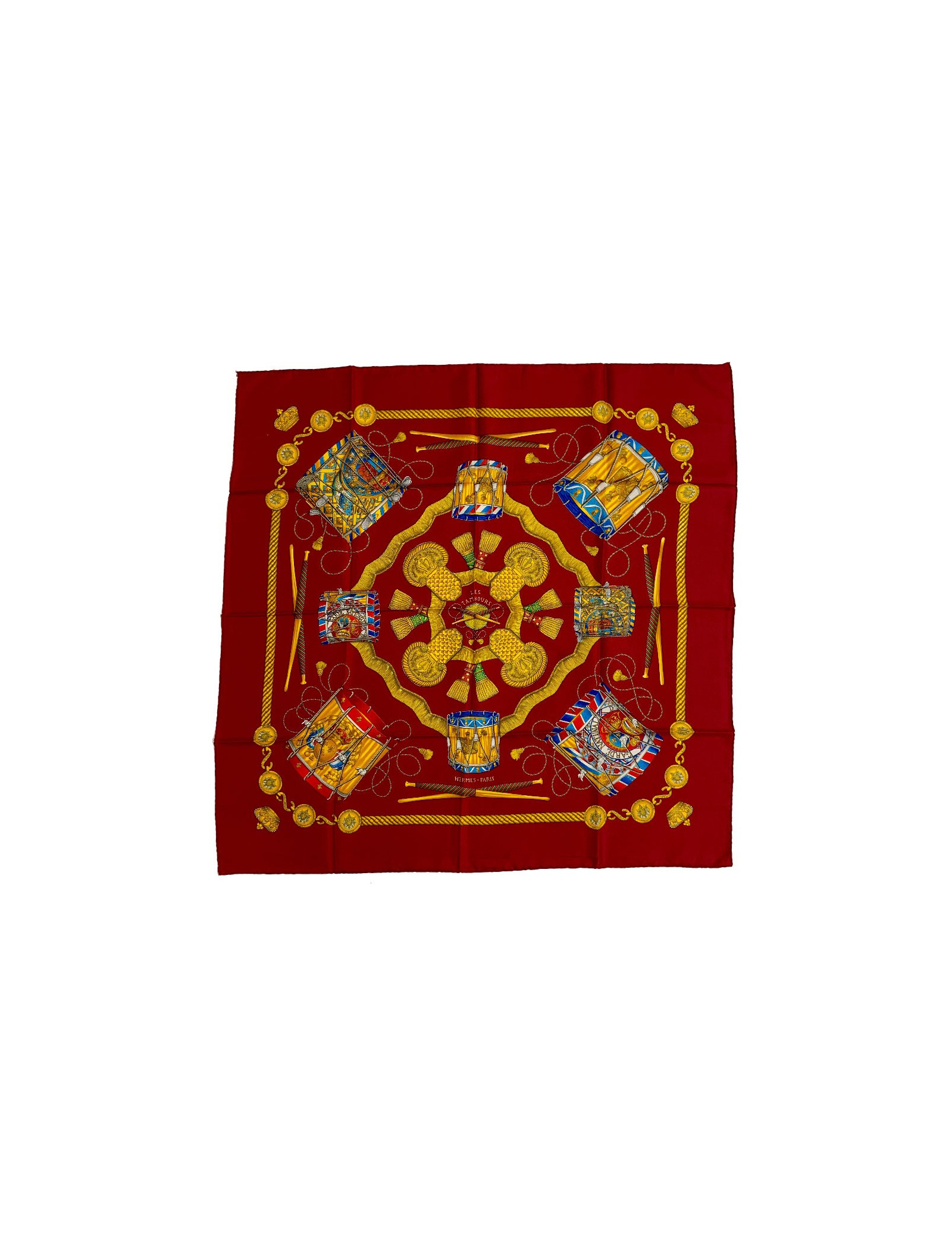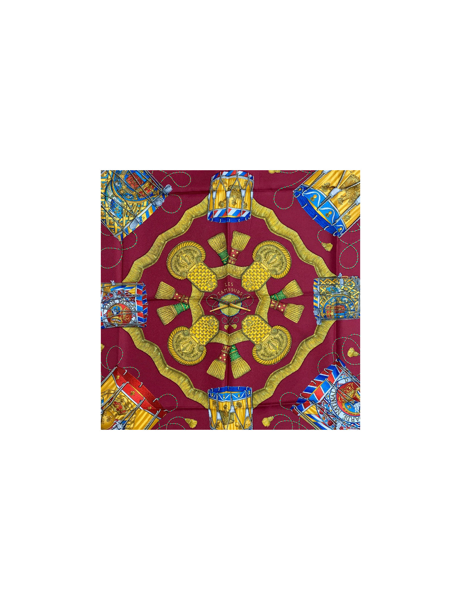 Beautiful HERMES square scarf, Les Tambours design, in wine-red silk twill with gold, blue and red motifs. Designed by Joachim Metz in 1989. It represents the drums, instruments played by the national guard.
