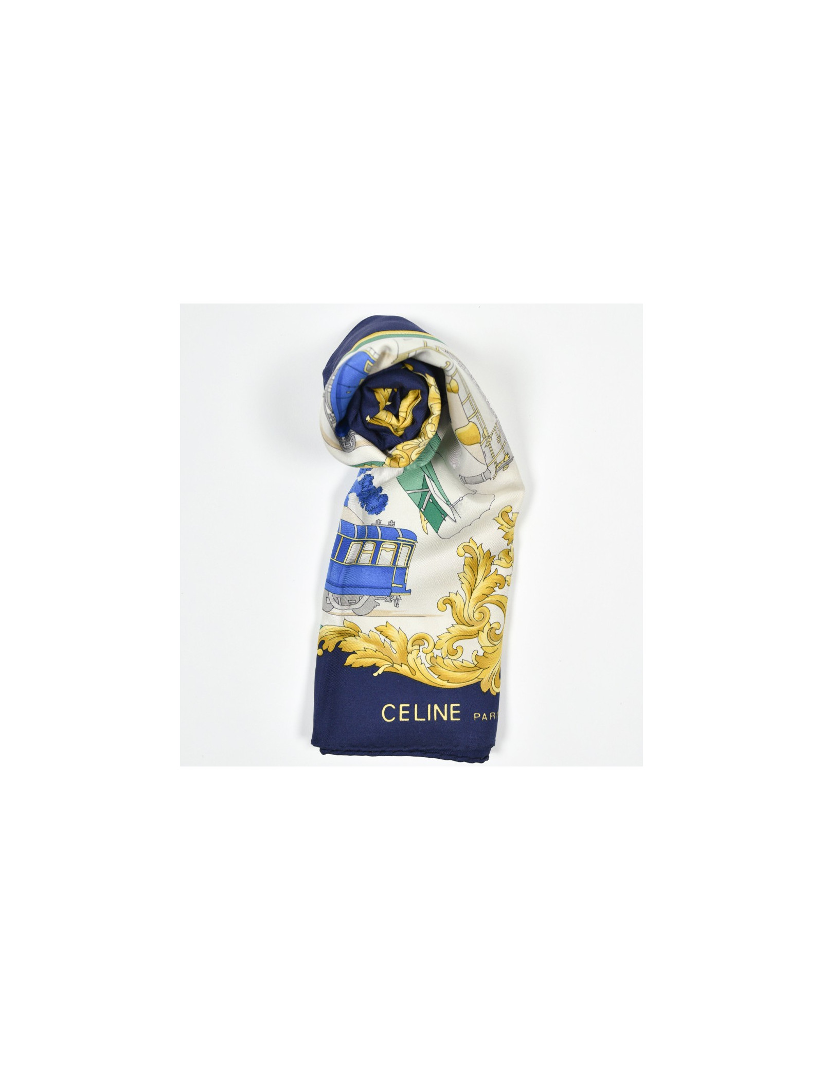 Last items in stock SCARVES AND SHAWLS CELINE sly blue silk scarf CELINE 17056 95.00 € CELINE sly blue silk scarf Condition: very good ( one tiny pulled thread)Material: silk muslinColors: sly blue, greenMeasurements: 84x85cmDetails: CELINE light-blue silk muslin scarf with round stone motifs in shades of green and blue. Delivered in a Valois Vintage Paris dustbag Add to cart