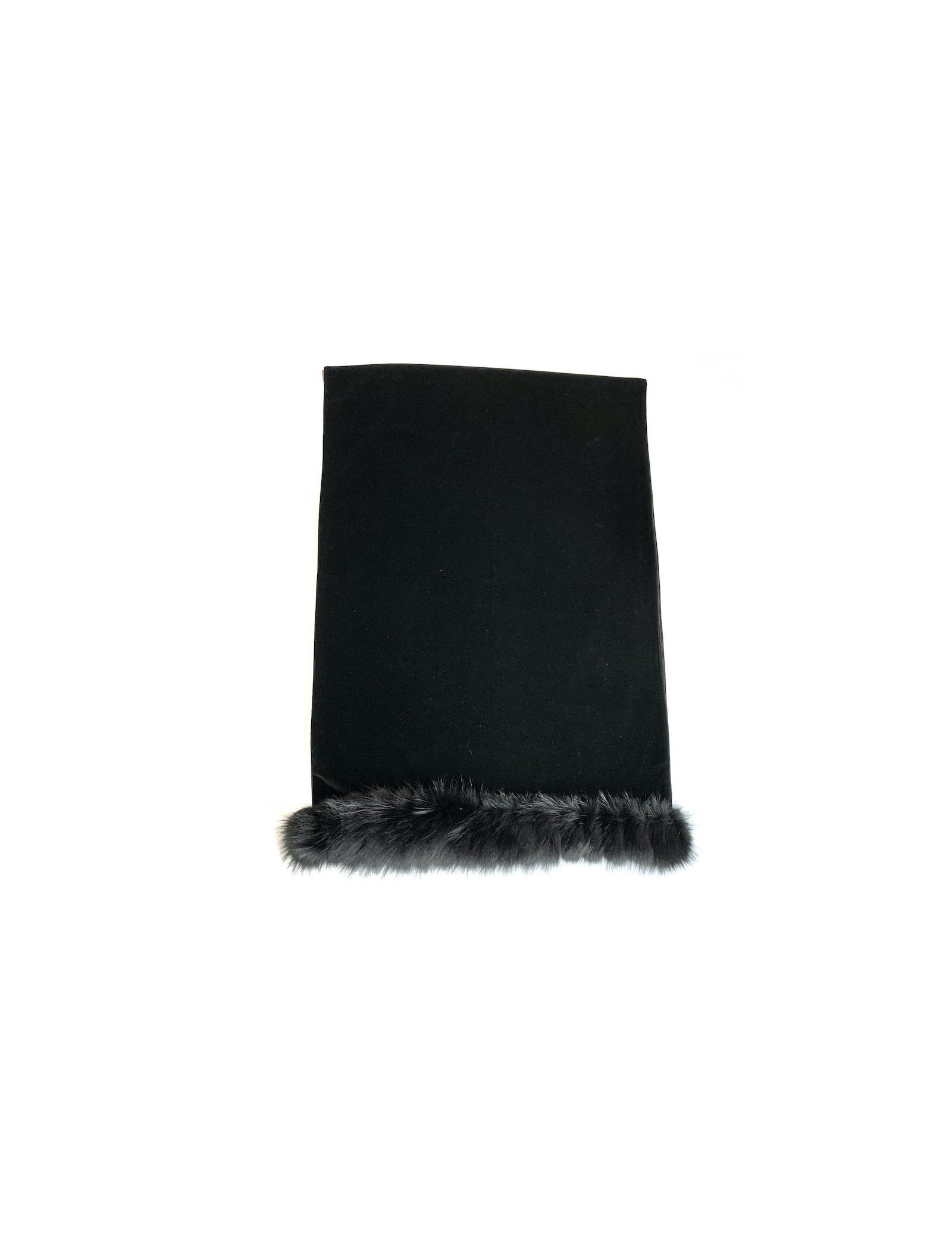 The shawl is signed YVES SAINT LAURENT Fourrures. Made of black velvet on the front and brown on the back, it is trimmed with black fur on each side. Dressed for the winter!