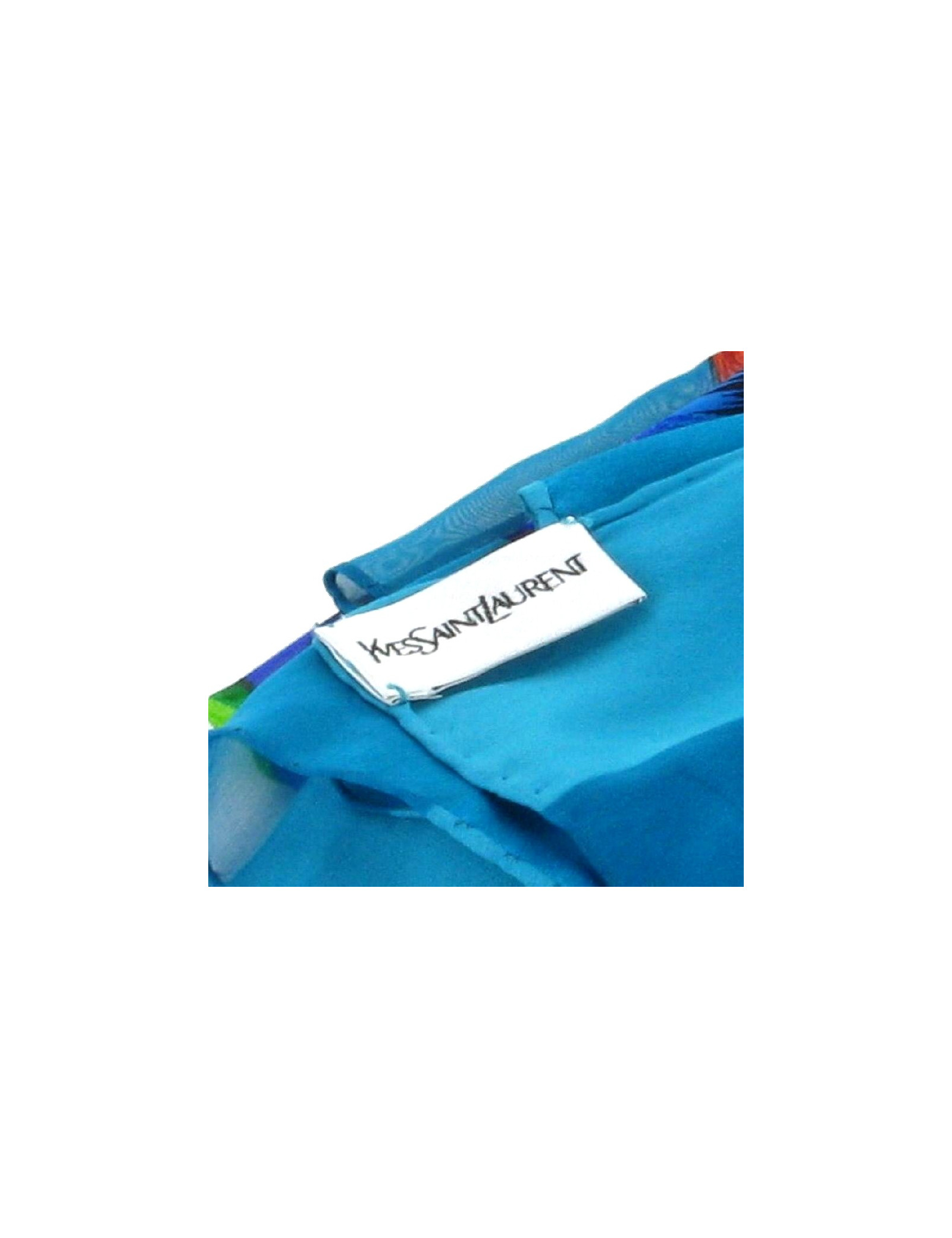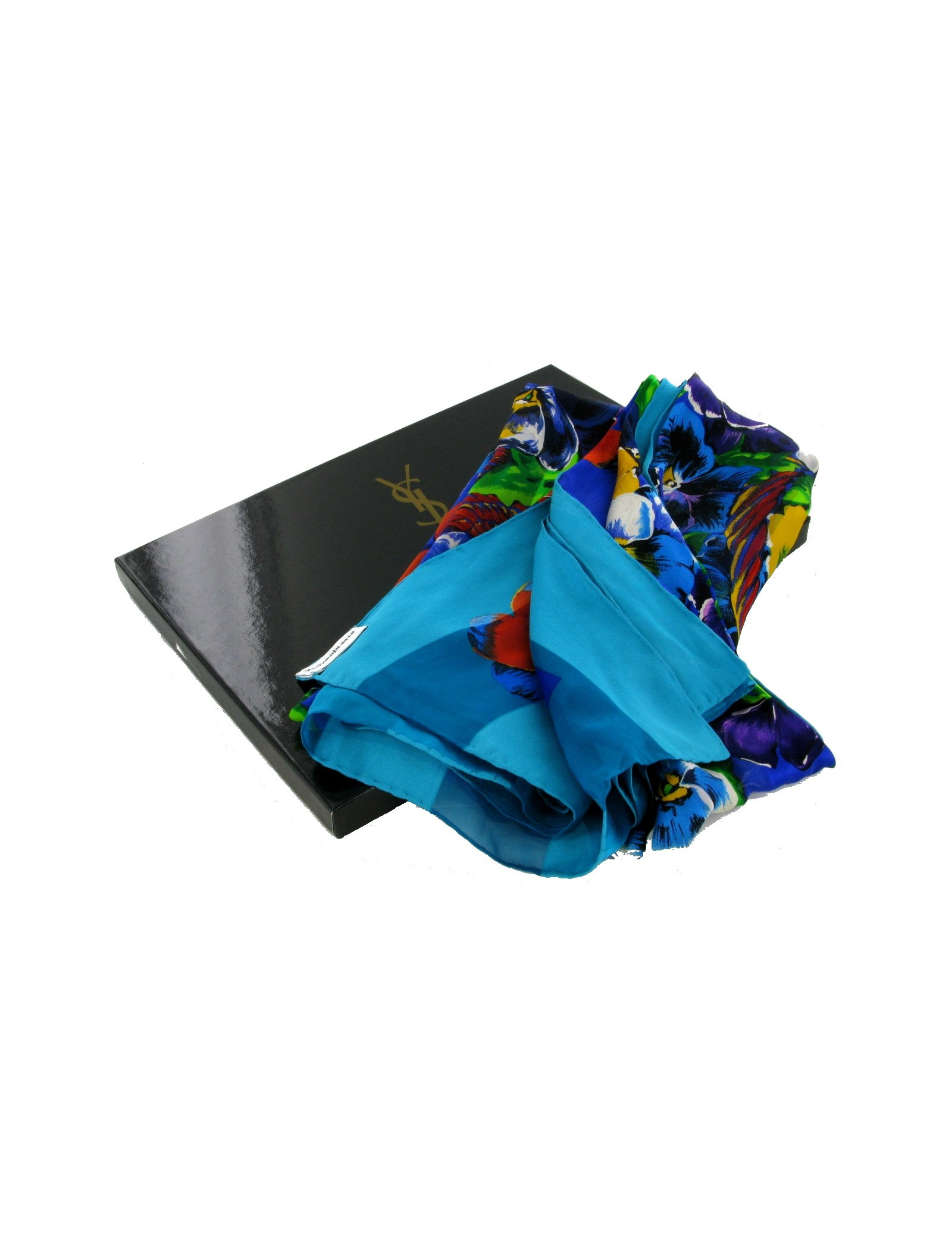 YVES SAINT LAURENT large shawl in 100% silk. This scarf with printed flowers on large turquoise and blue stripes Fund is in perfect condition because never door.