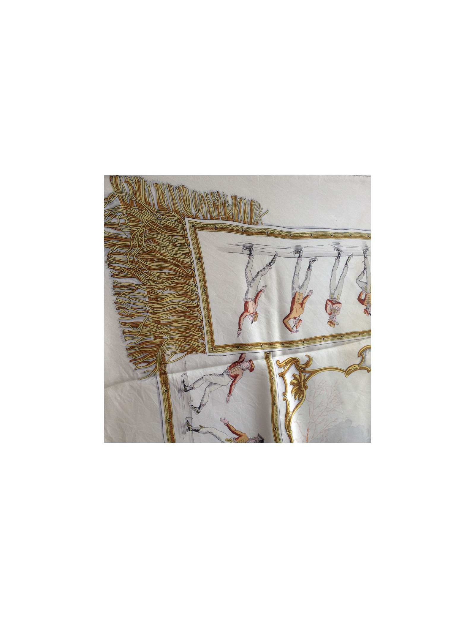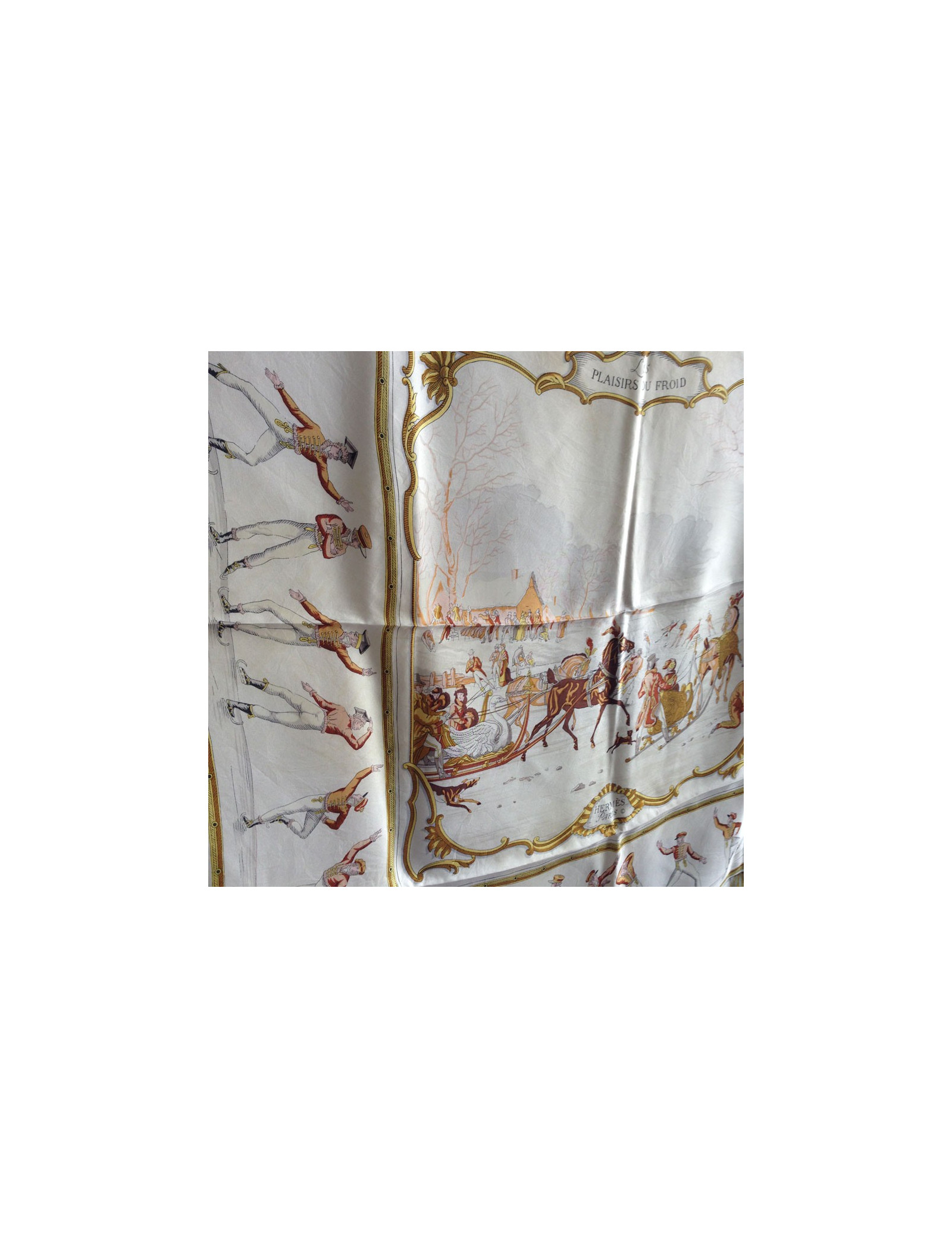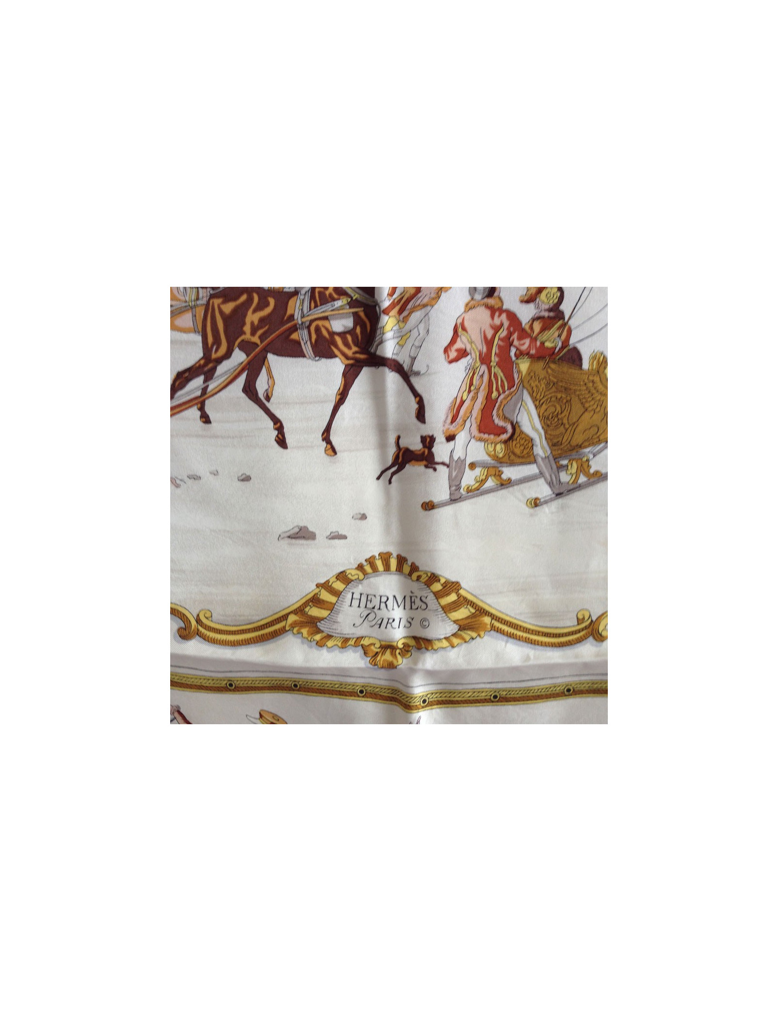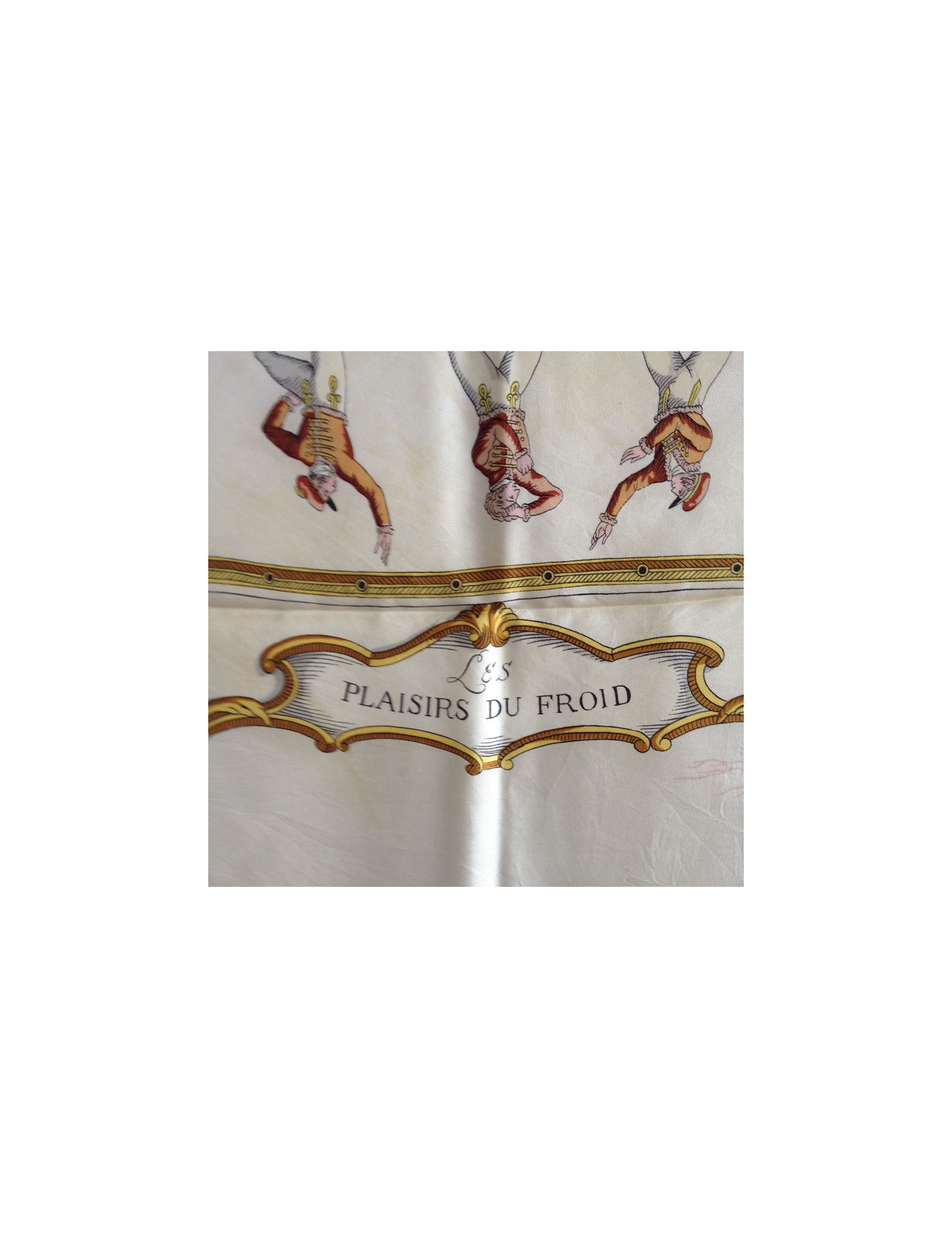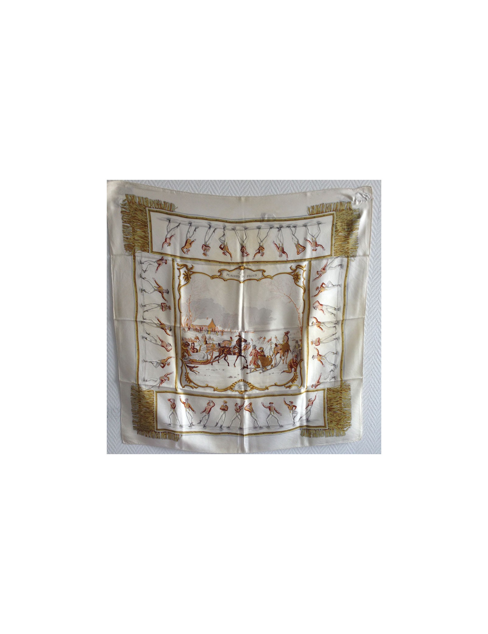 Square HERMES "the pleasures of the cold ', 100% silk." Scarf vintage, in unbleached tones. Discrete tasks and a few slightly drawn threads. Used condition.
