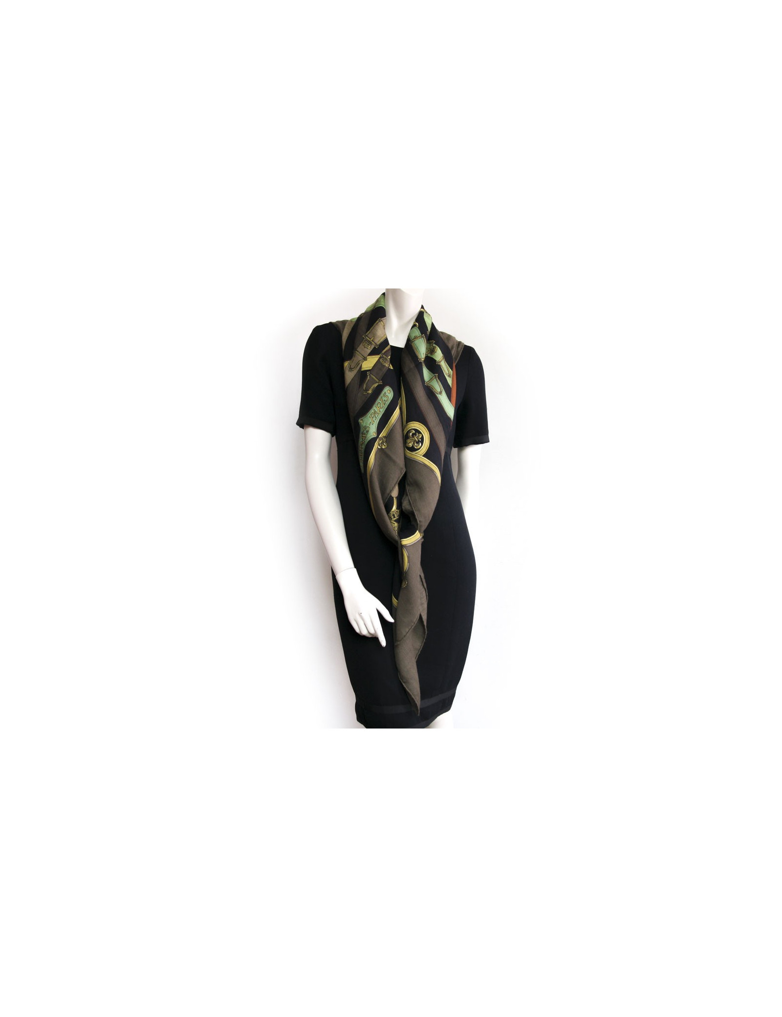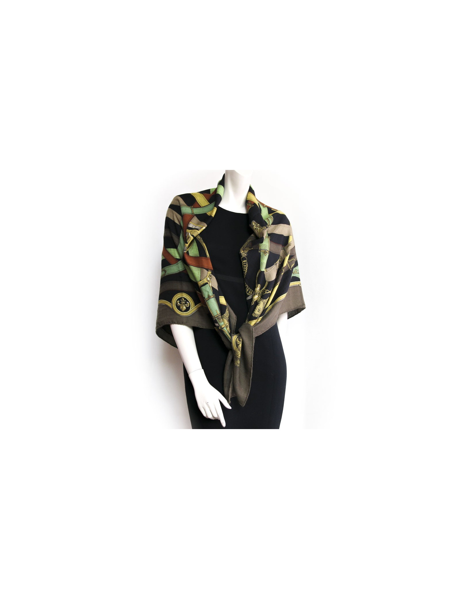 Essential shawl "'Cavalcadour" Hermes, in cashmere and silk in a chevron cloth. It is in very good condition. Colors: Khaki, brick green beige, yellow green, green anise, and gold.