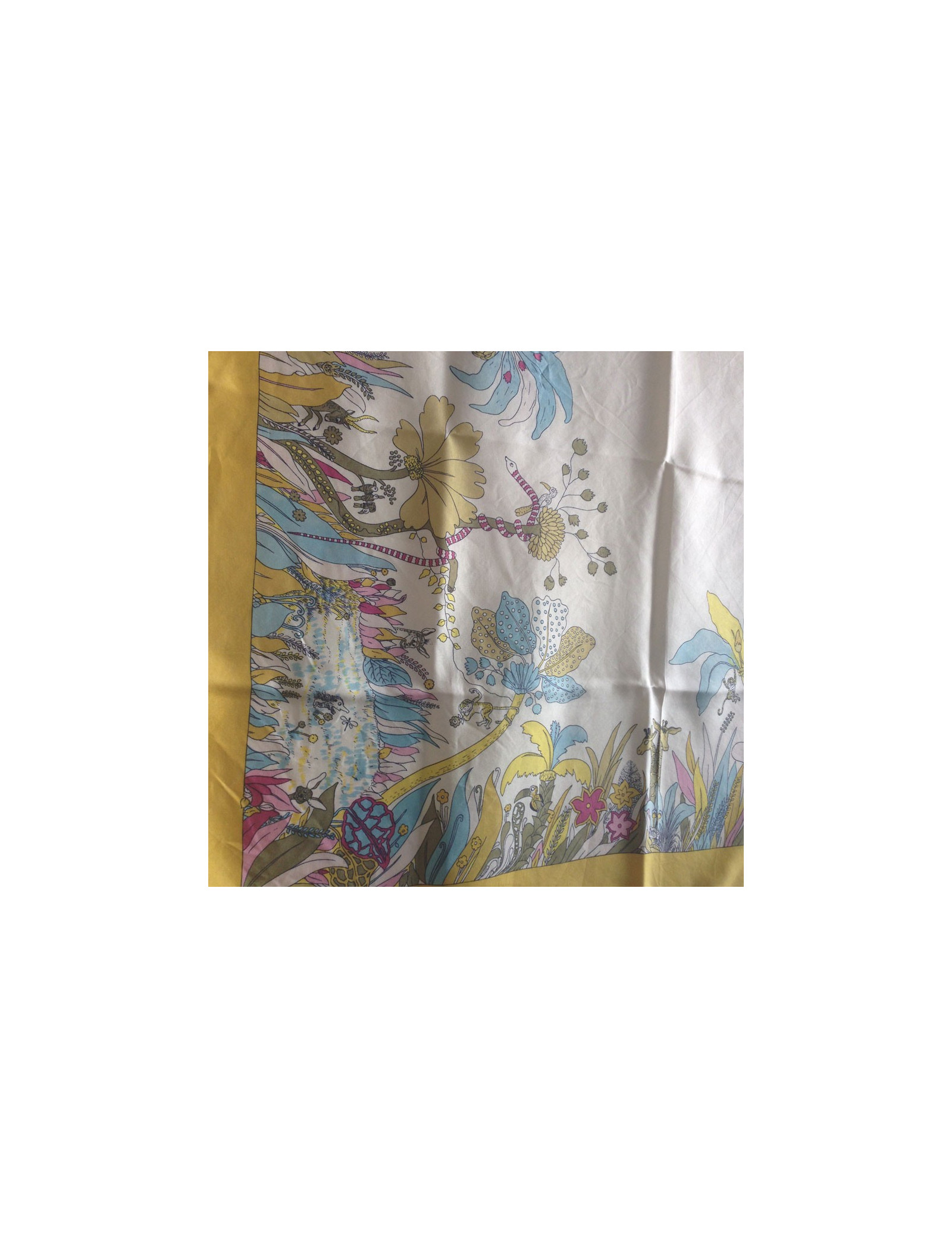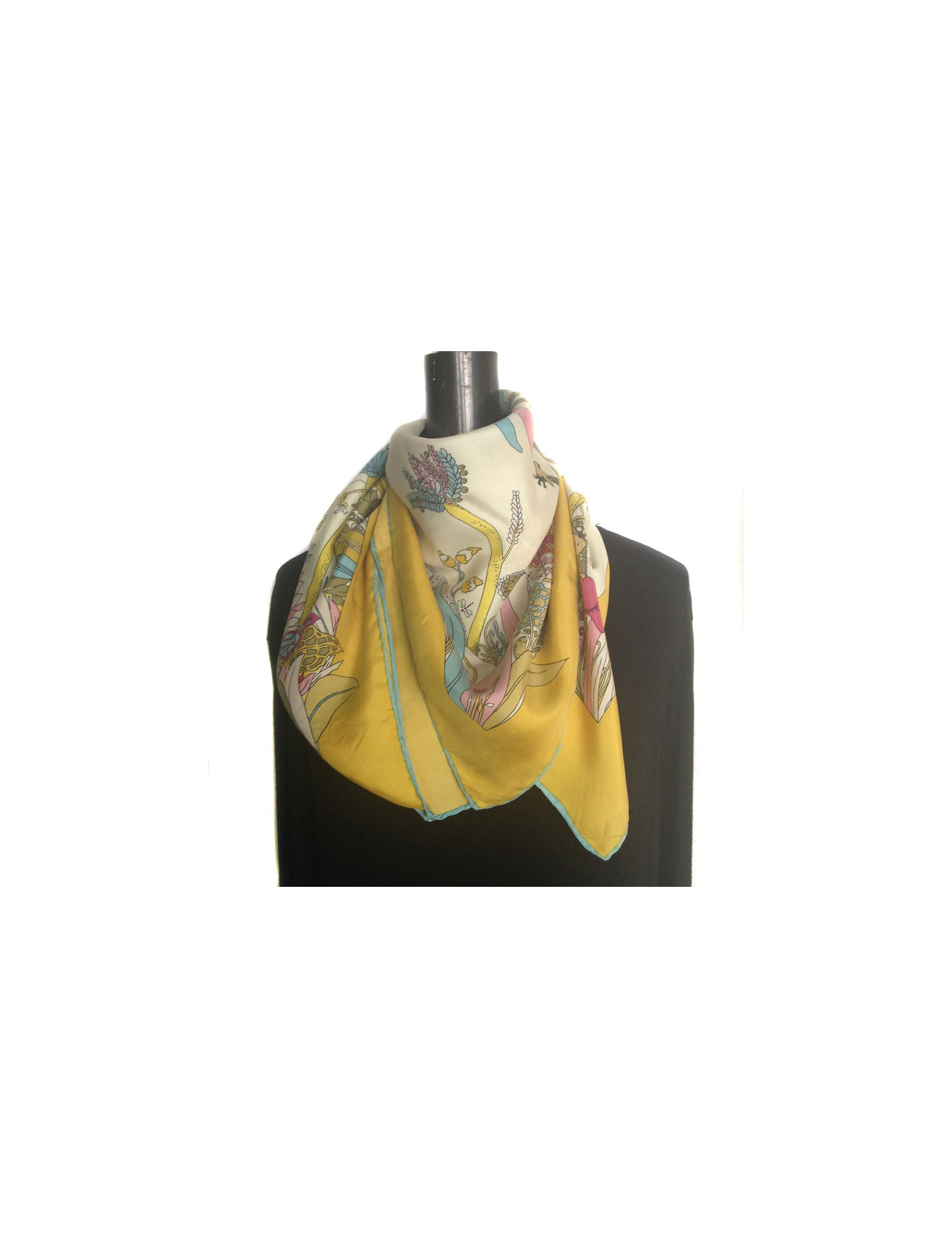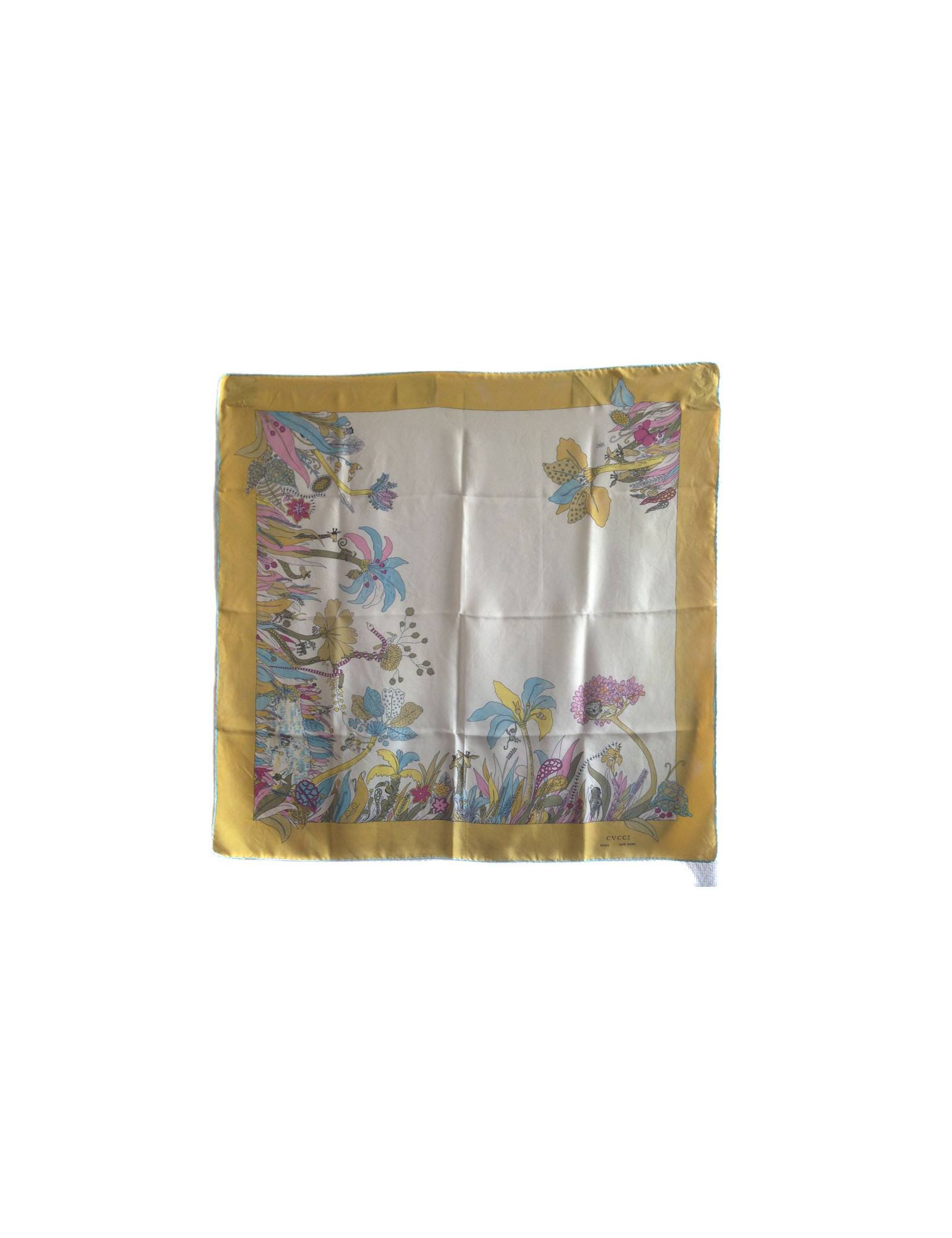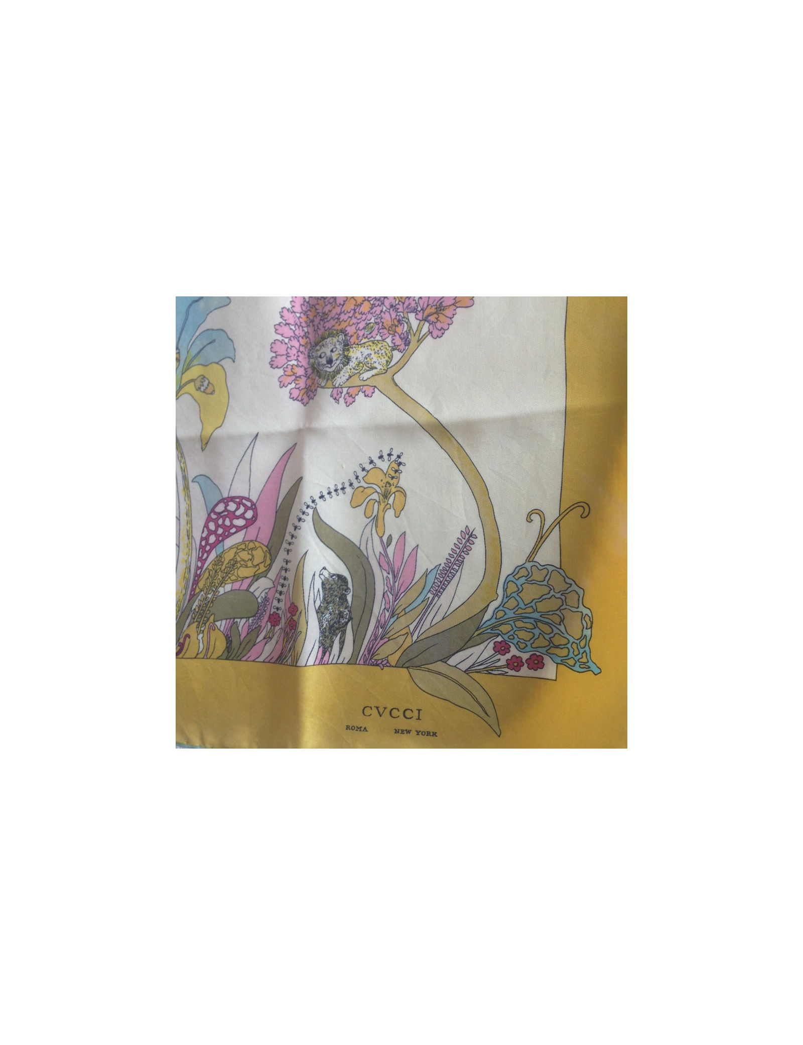 Square of silk GUCCI, vintage, in pastel shades of blue, yellow and purple. Reason: flowers of the Savannah. Signed GUCCI ROMA NEW YORK. Sign of fading on the yellow border (see photo). (Blue sky) trailer is in very good condition.