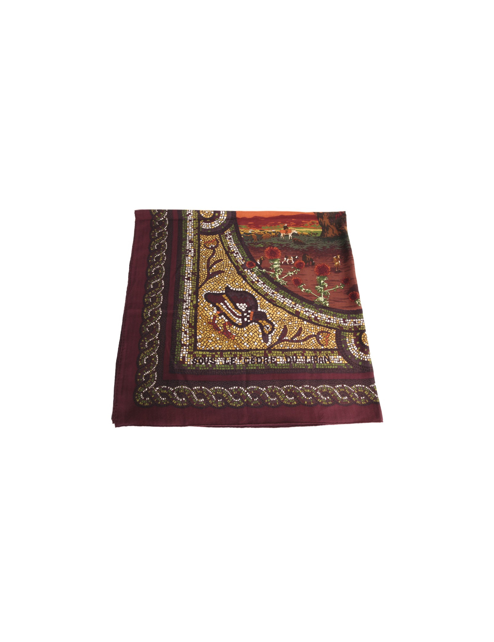 Hermès in cashmere and silk shawl "under the Lebanon Cedar", mosaic patterns with sumptuous warm colours, bright yellow green, Brown, bordeaux. Made in France. In very good condition.