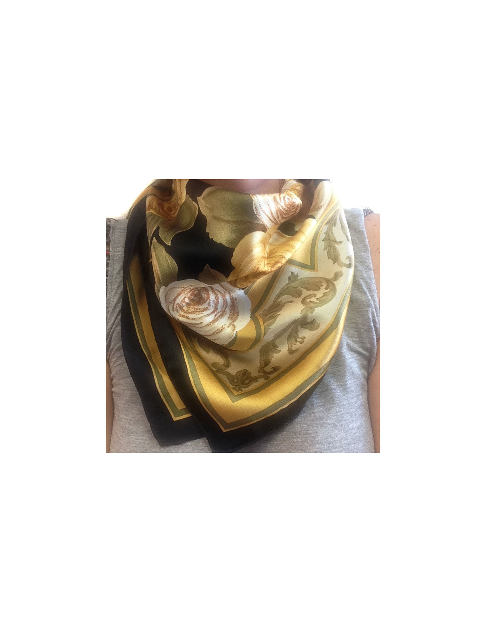 DIOR scarf in black and gold, silk flowers patterns. Black border and highlights fall (Brown, gold, black). The trailer is spotless. The scarf is in very good condition.
