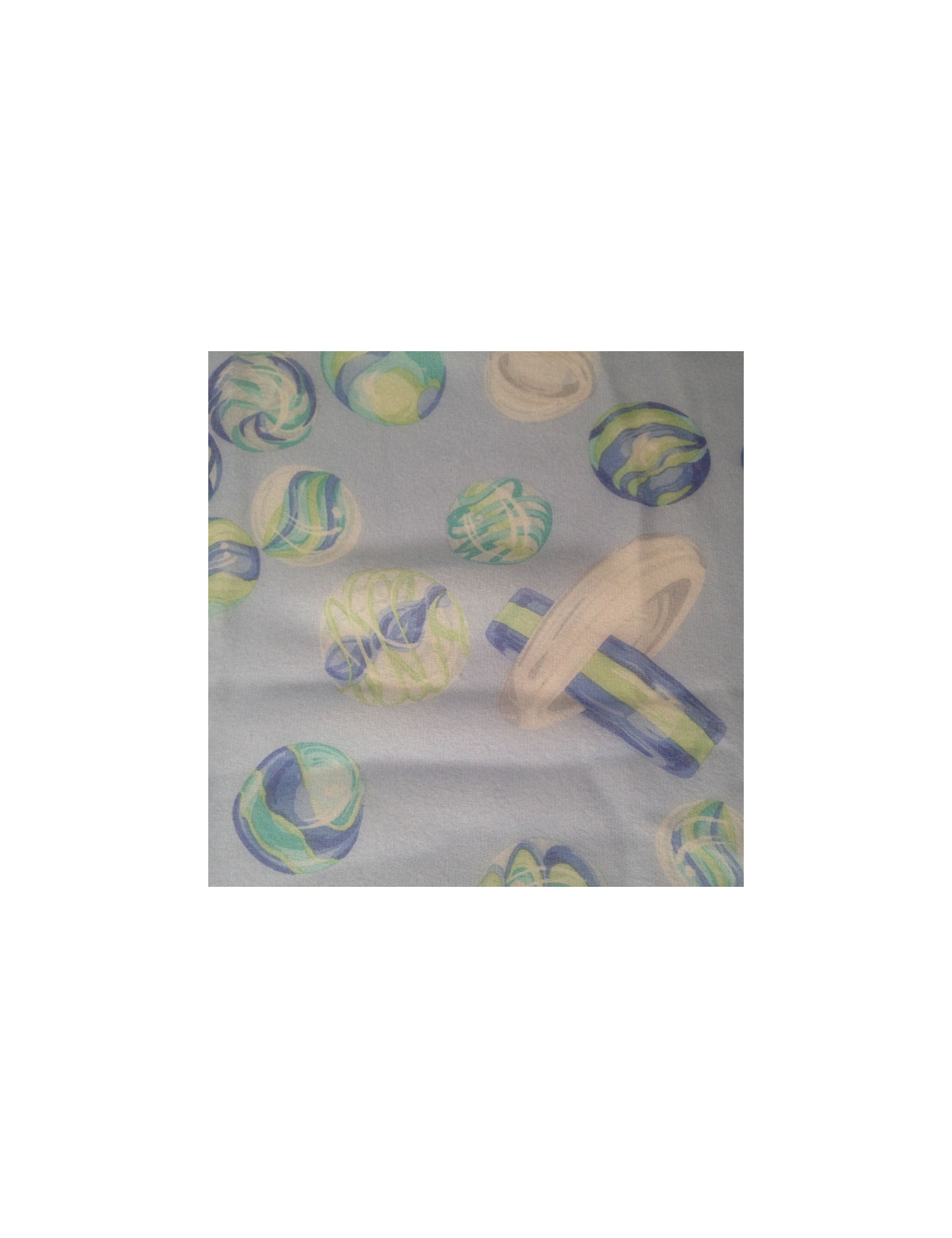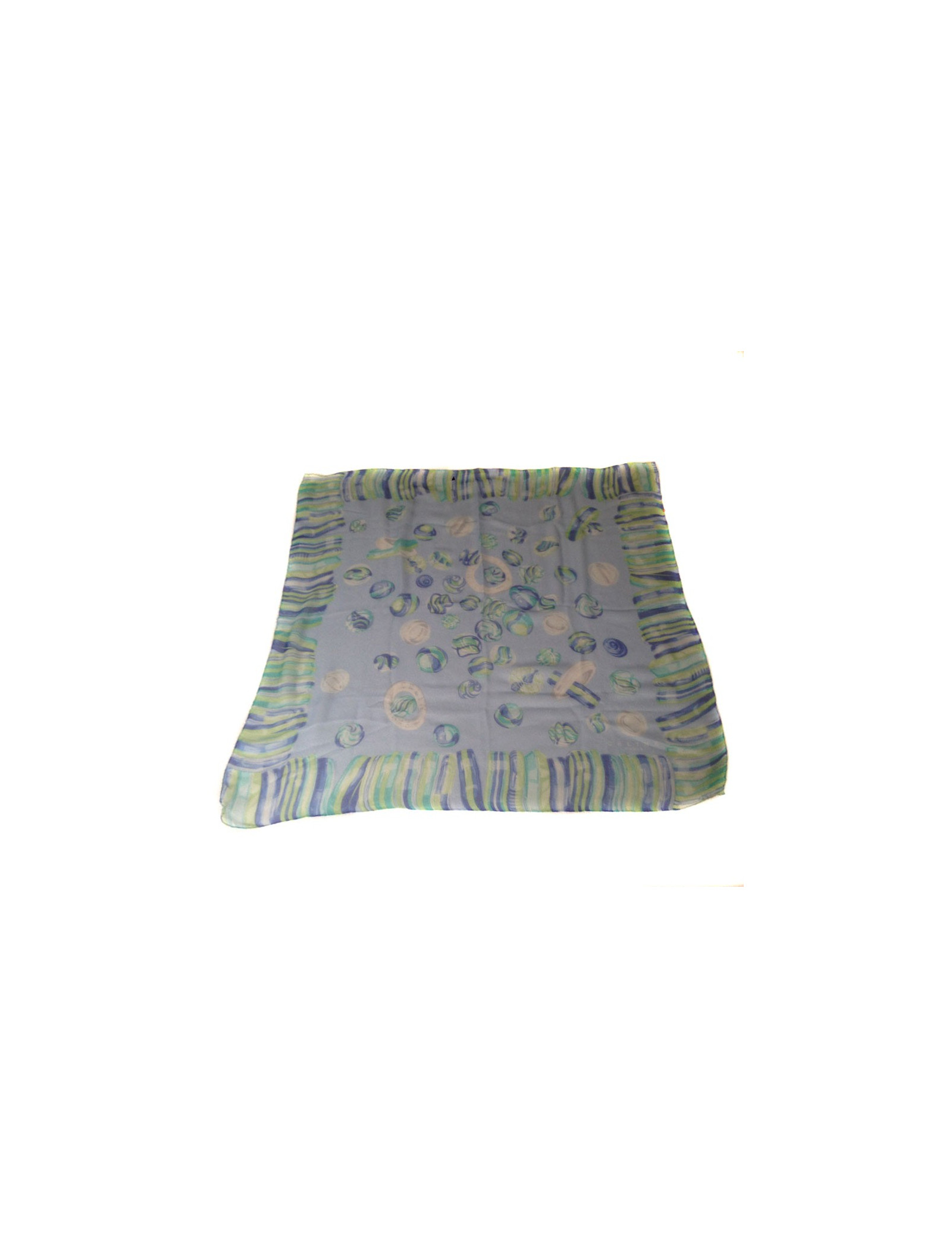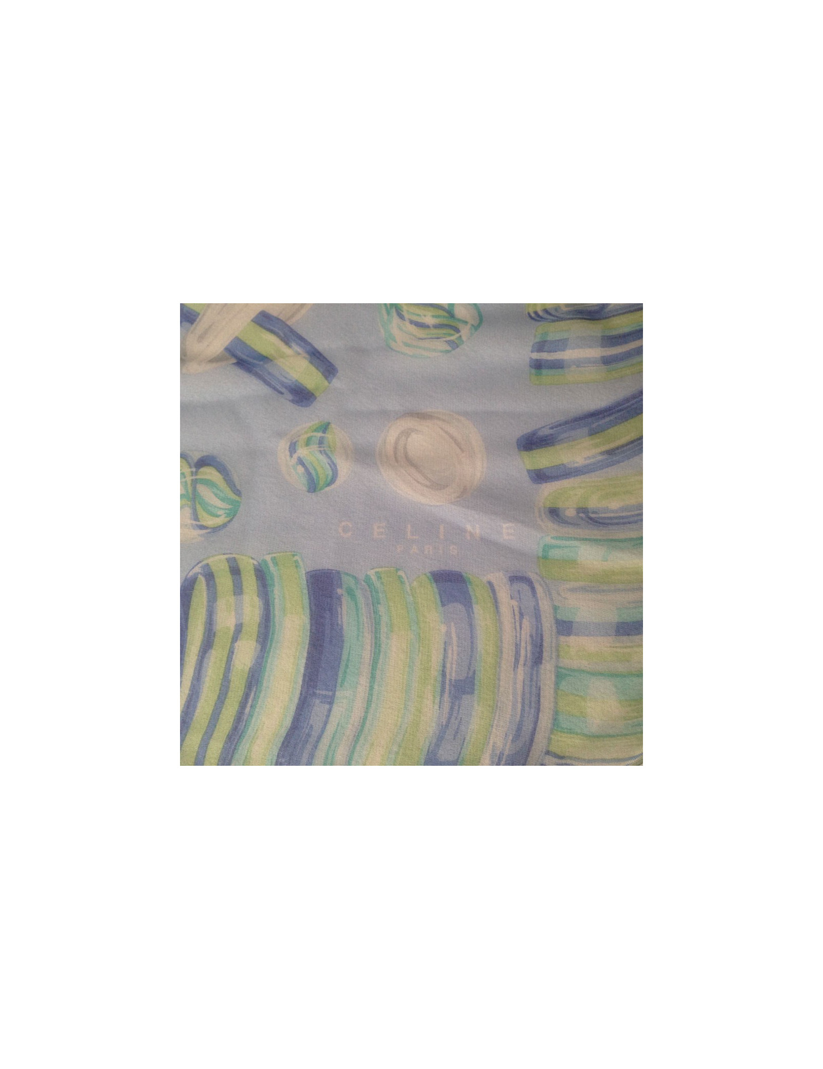 Details: CELINE light-blue silk muslin scarf with round stone motifs in shades of green and blue.