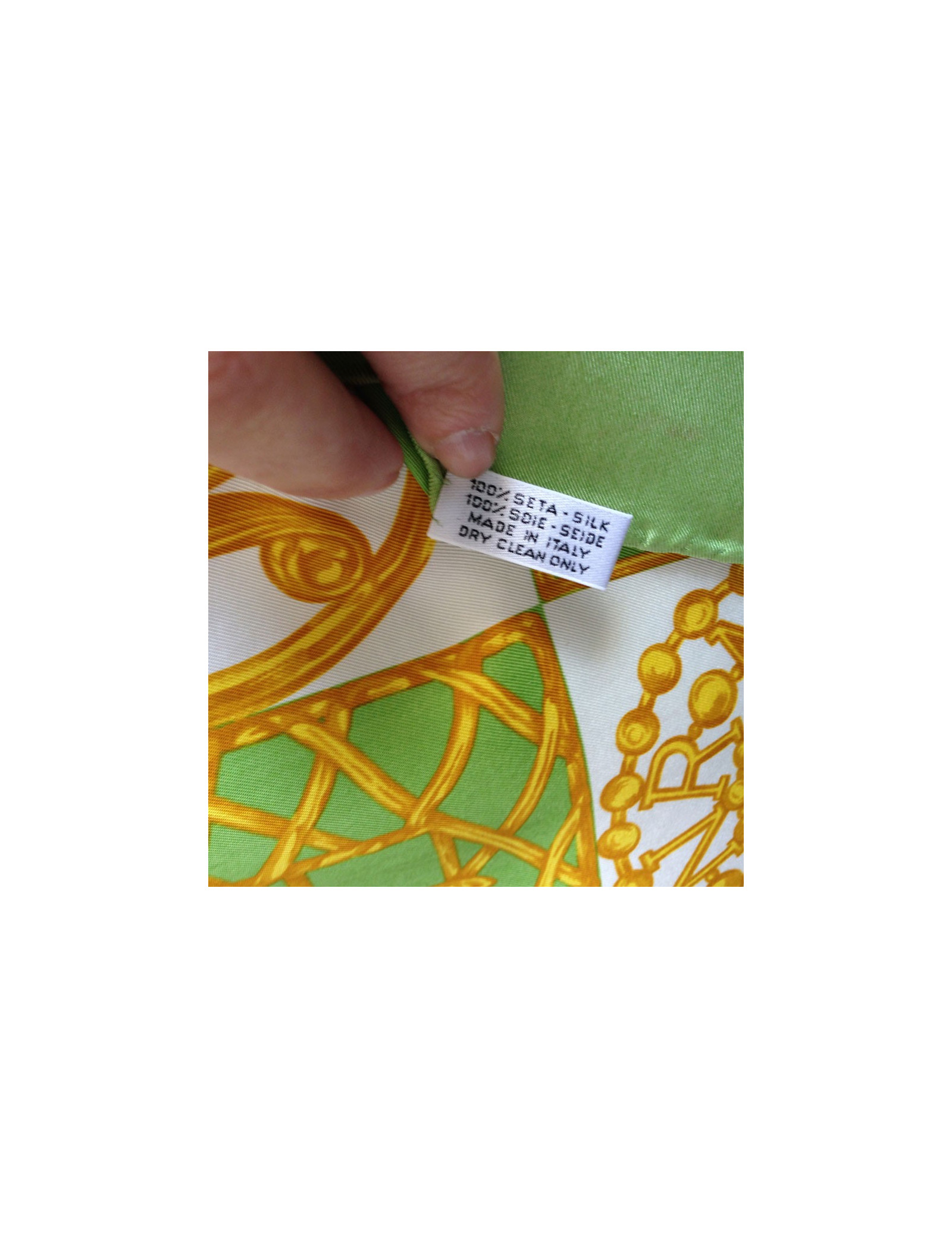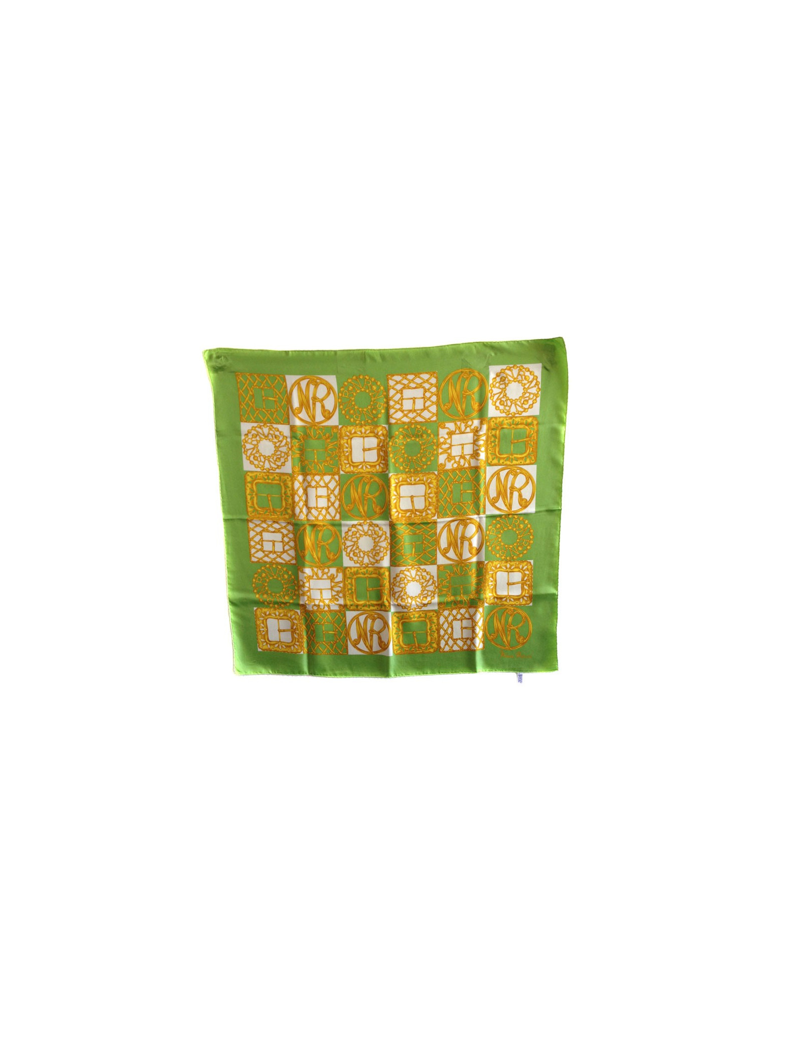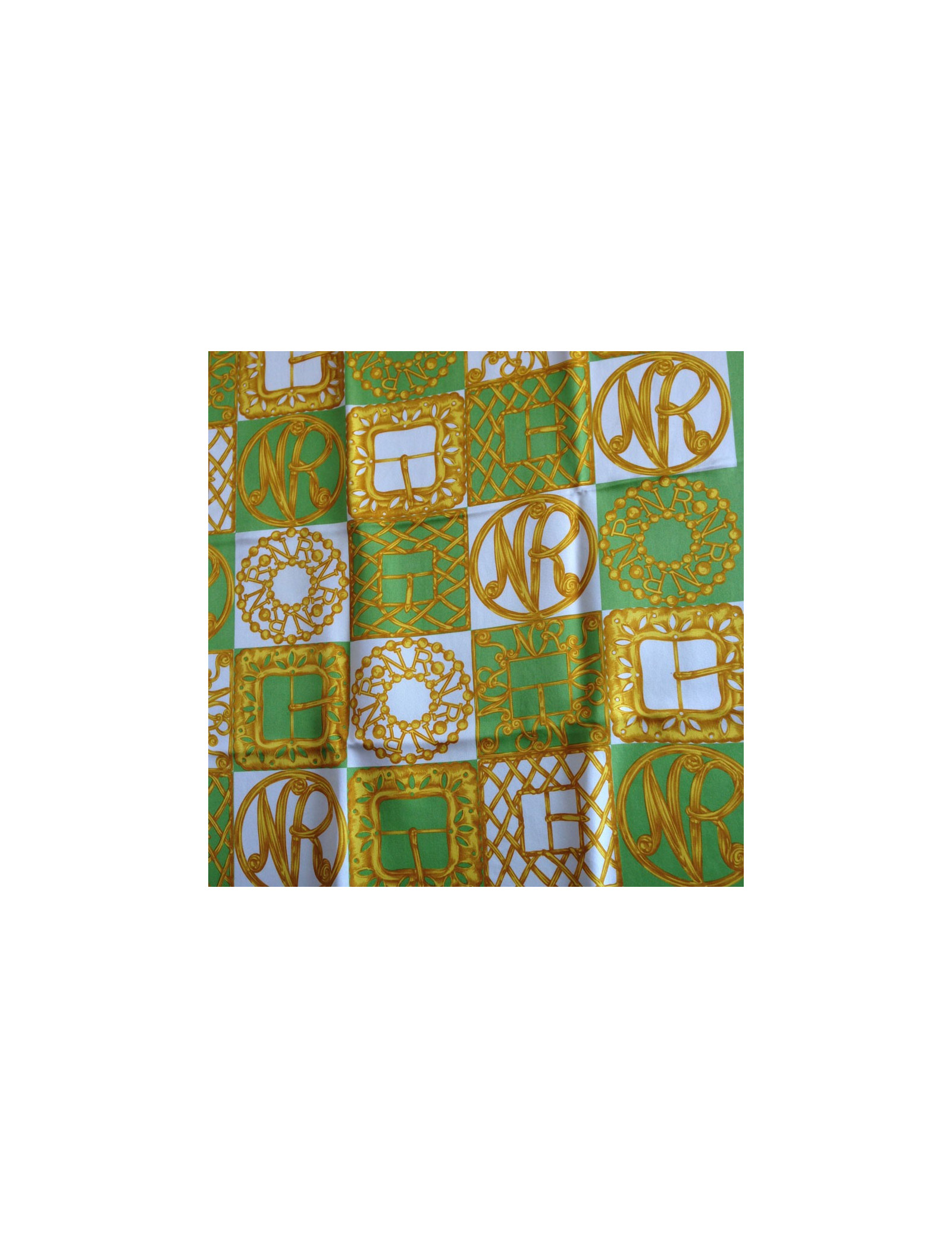 Square of Nina RICCI silk in shades of green, white and gold. Reason: belt buckle, registration NR initials in gold on a green and white checkerboard and Nina RICCI. Vintage square. The trailer is spotless. Light spot near a ground loop, silk slightly damaged in a corner. Material label presents. The square has been cleaned to a luxury cleaners.