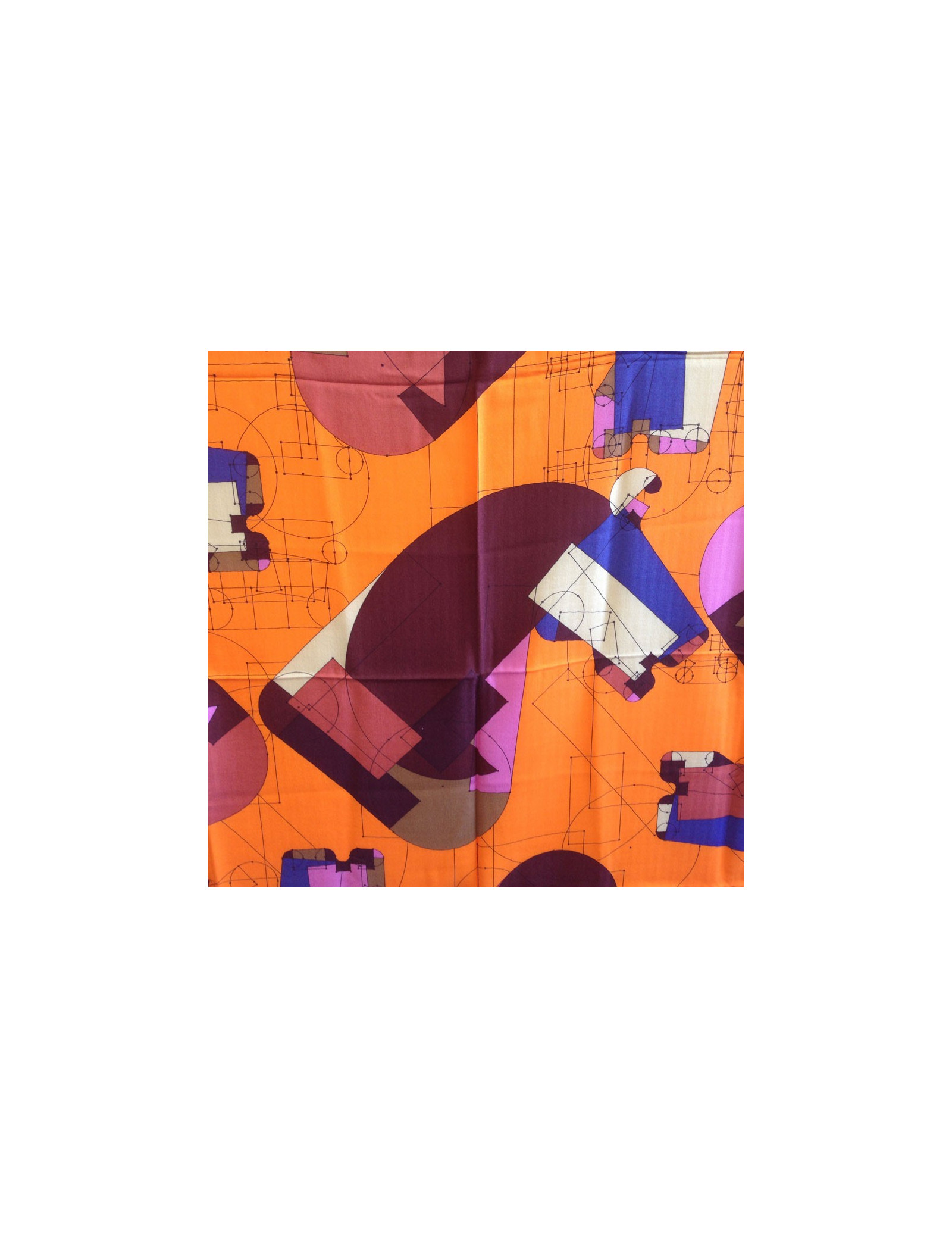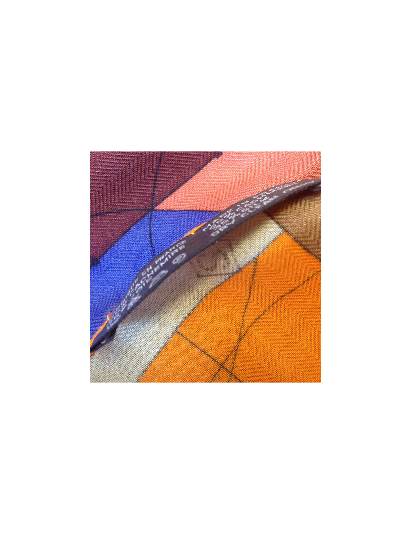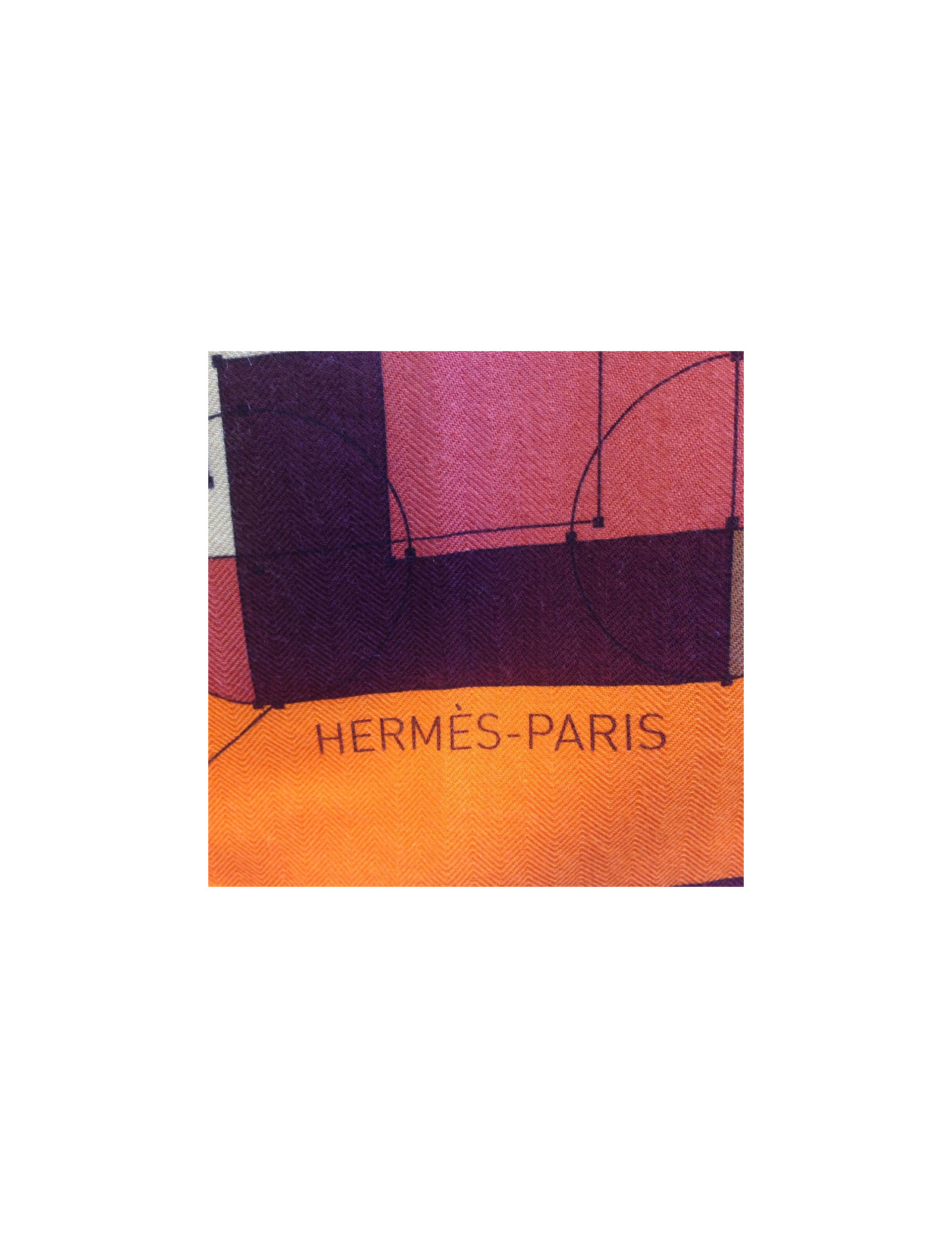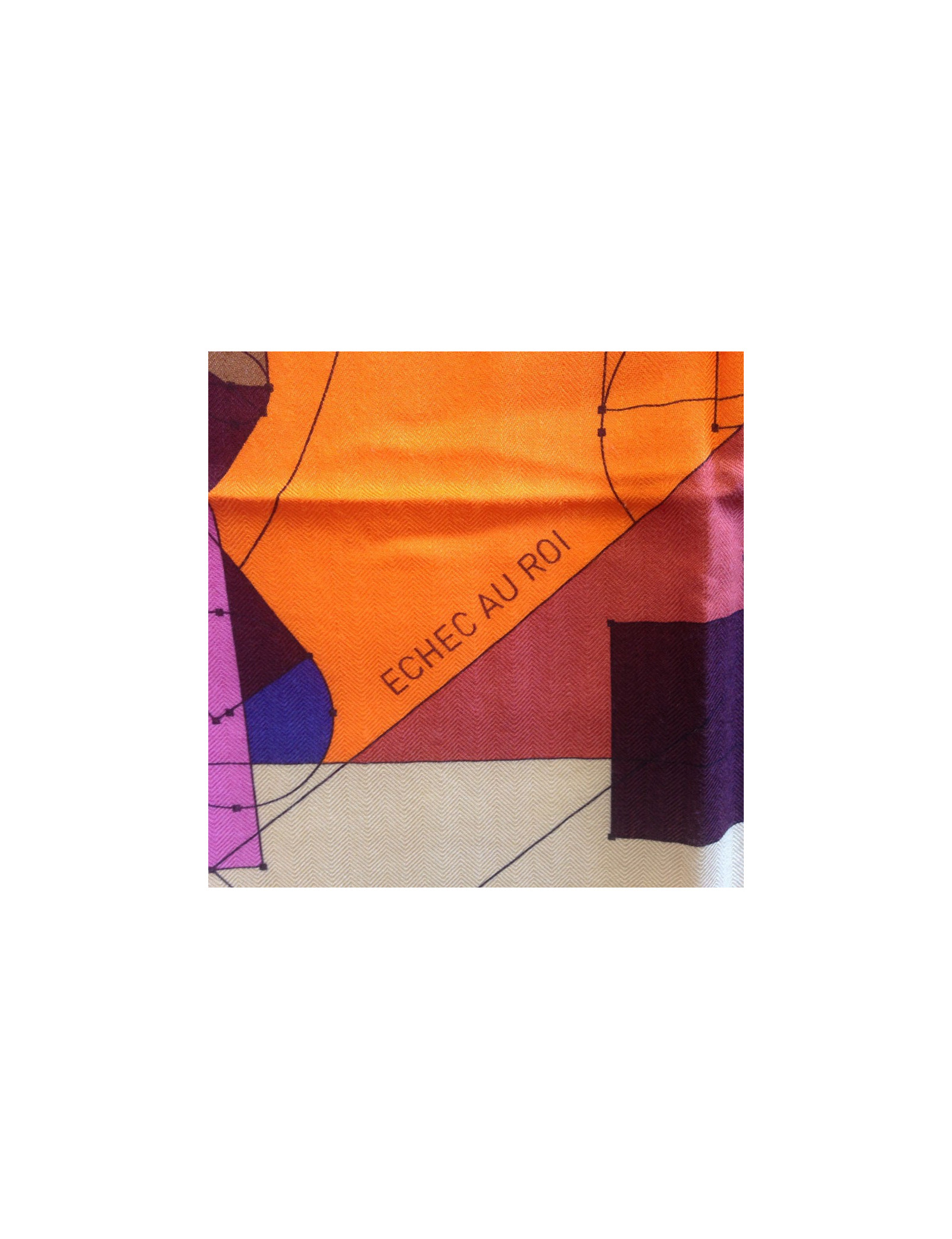 HERMES shawl "Echec au roi" in cashmere and silk, colors: orange, brown, burgundy, pink and beige. The roulotte is impeccable.