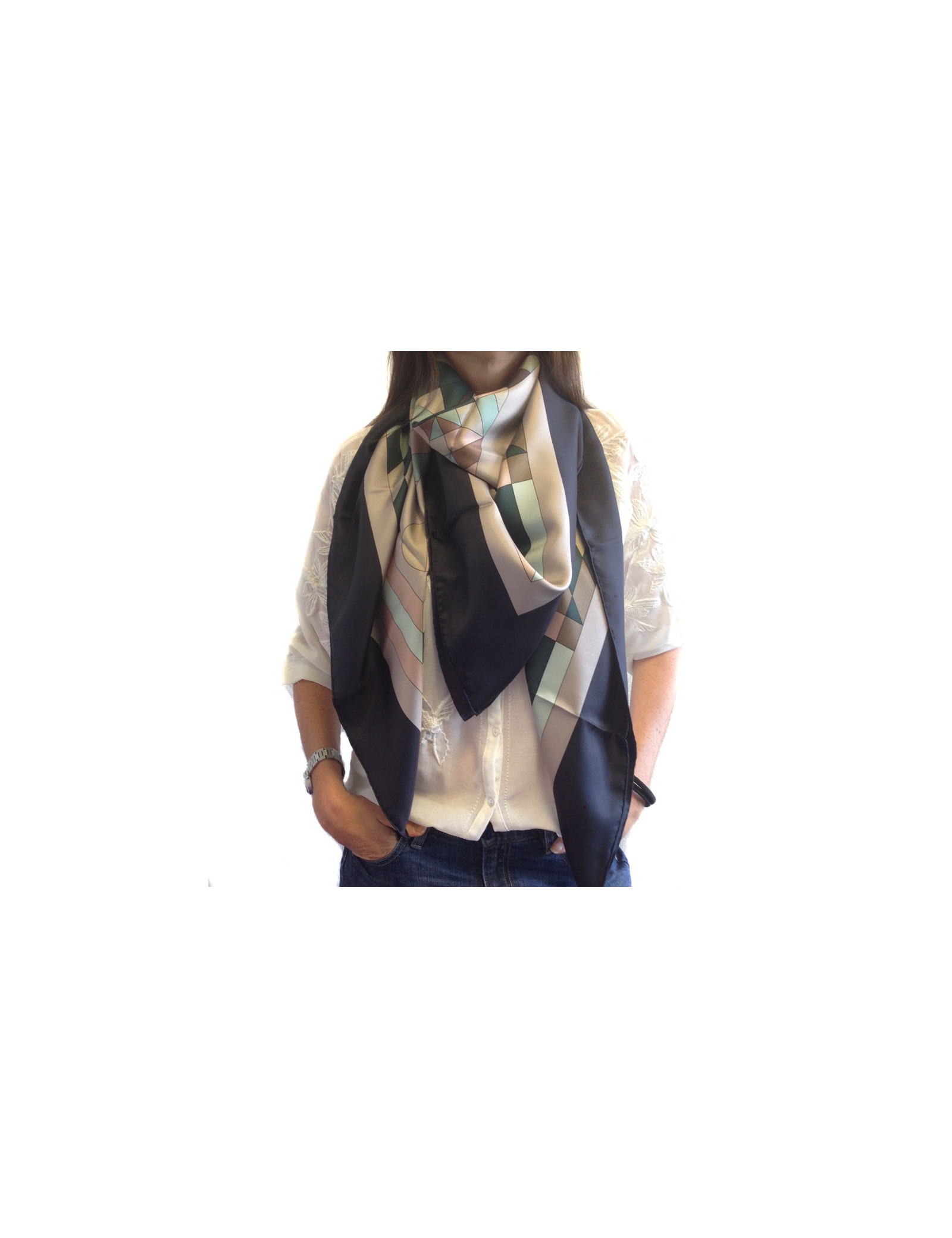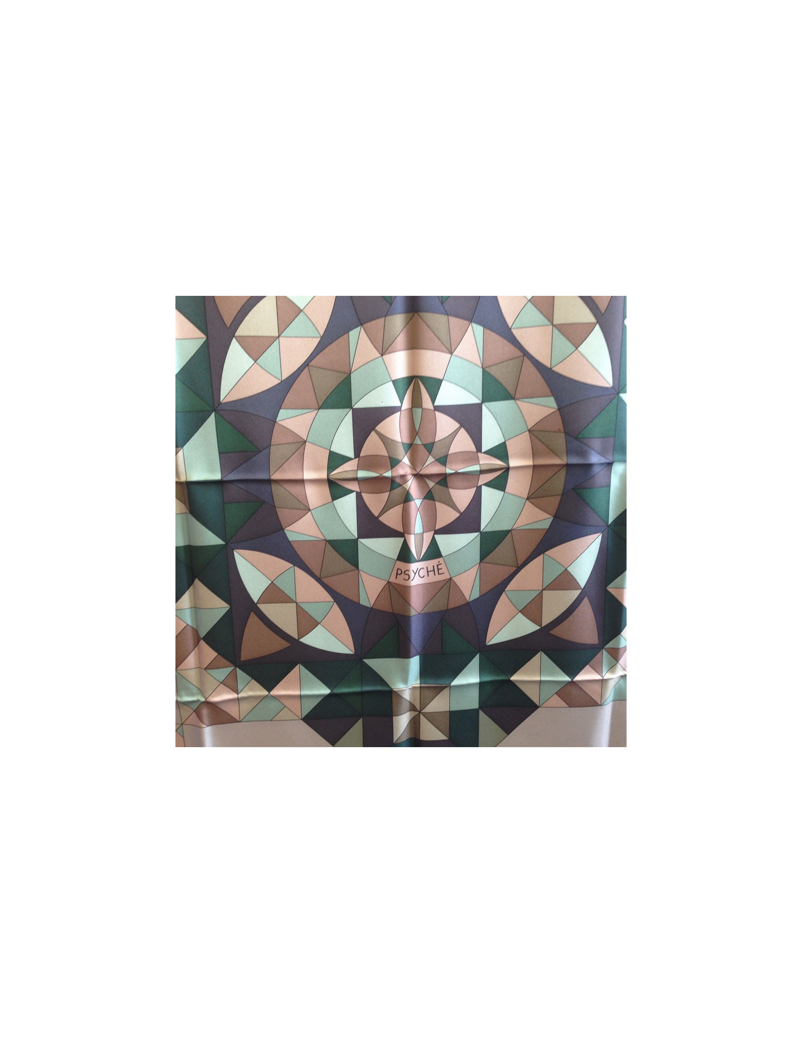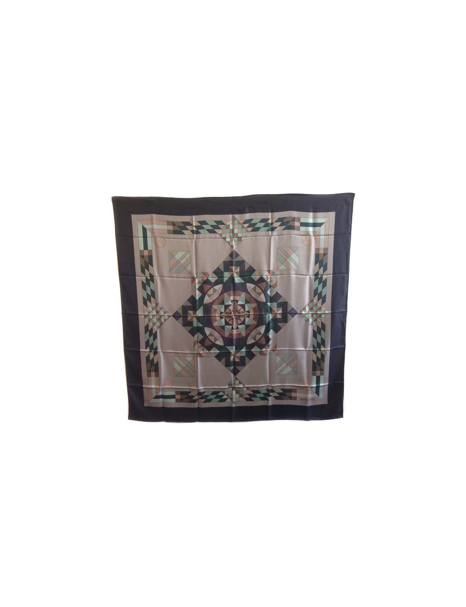Grand carré HERMES modèle "Psyché" en soie. Coloris neutres: noir, étoupe, vert, beige, vieux rose. Le roulotté est impeccable. Petit trou sur le foulard (voir photo). En très bon état.