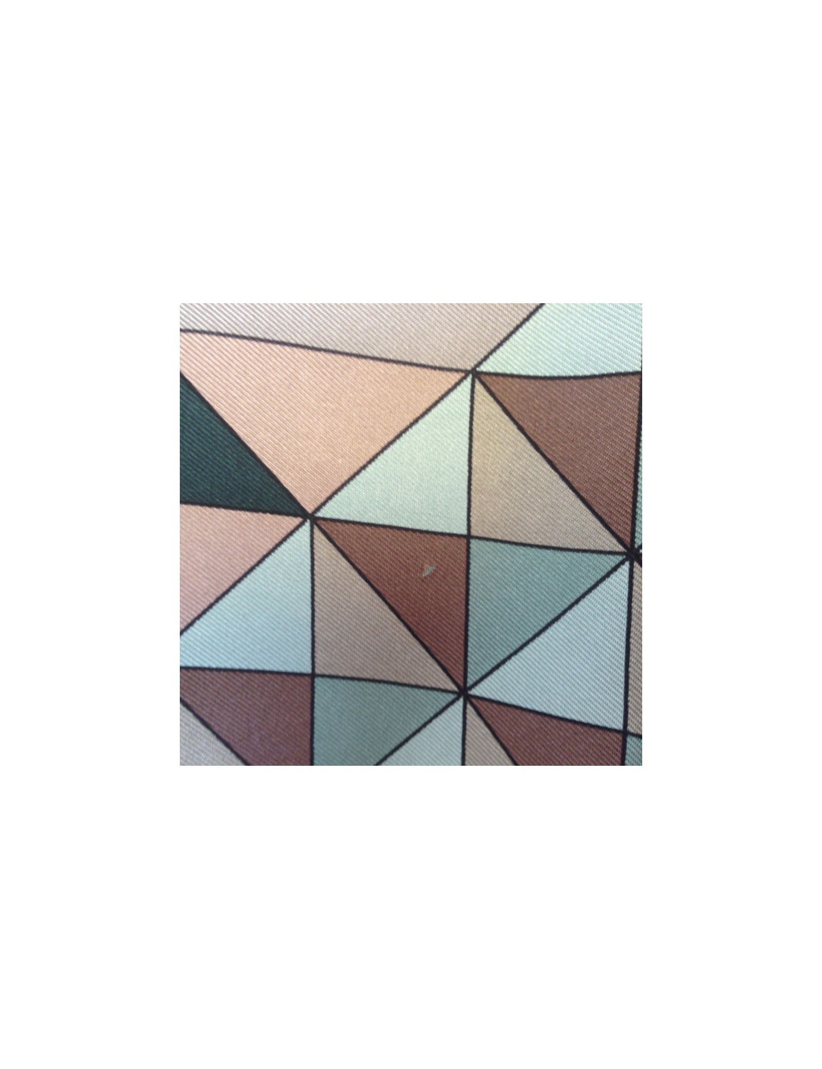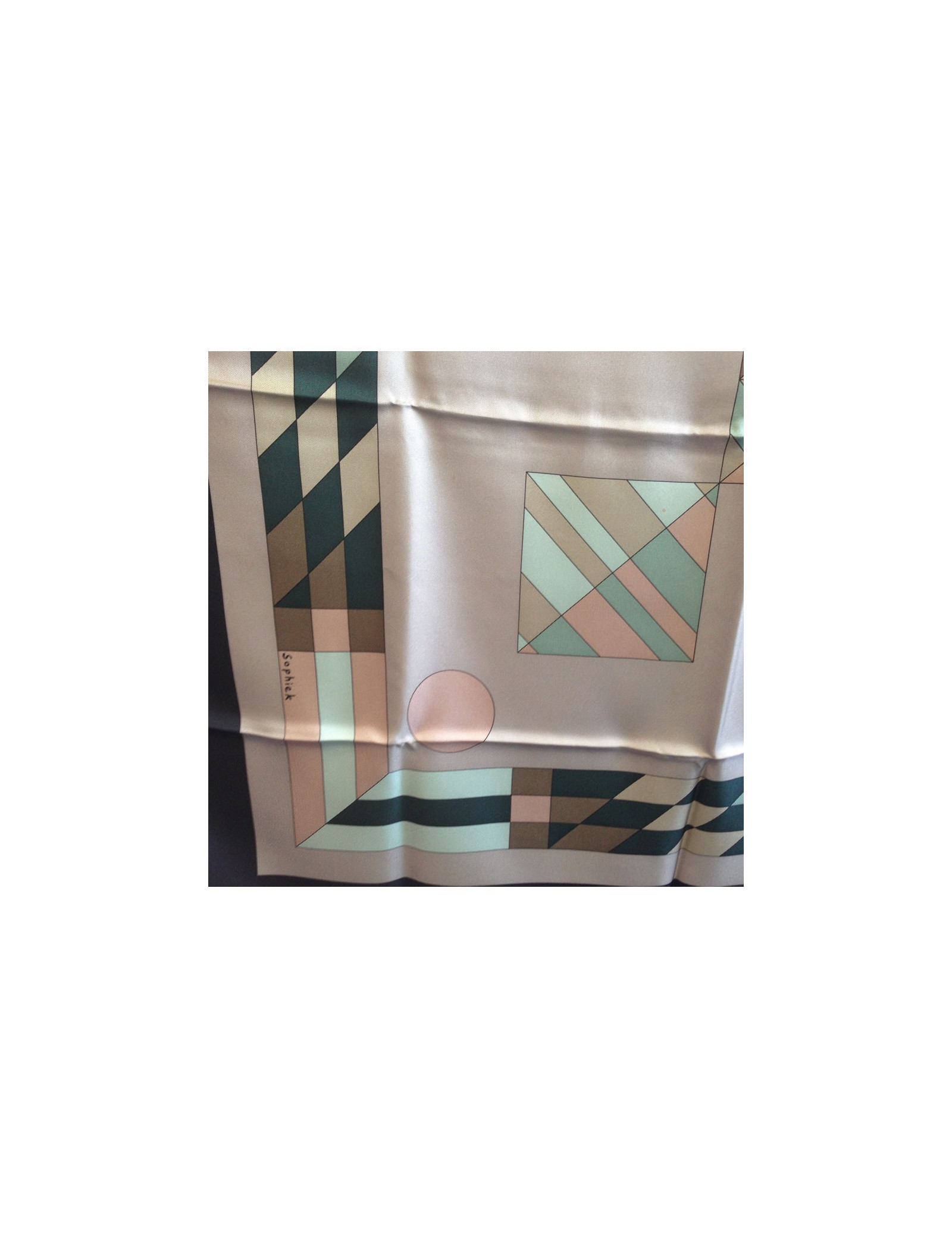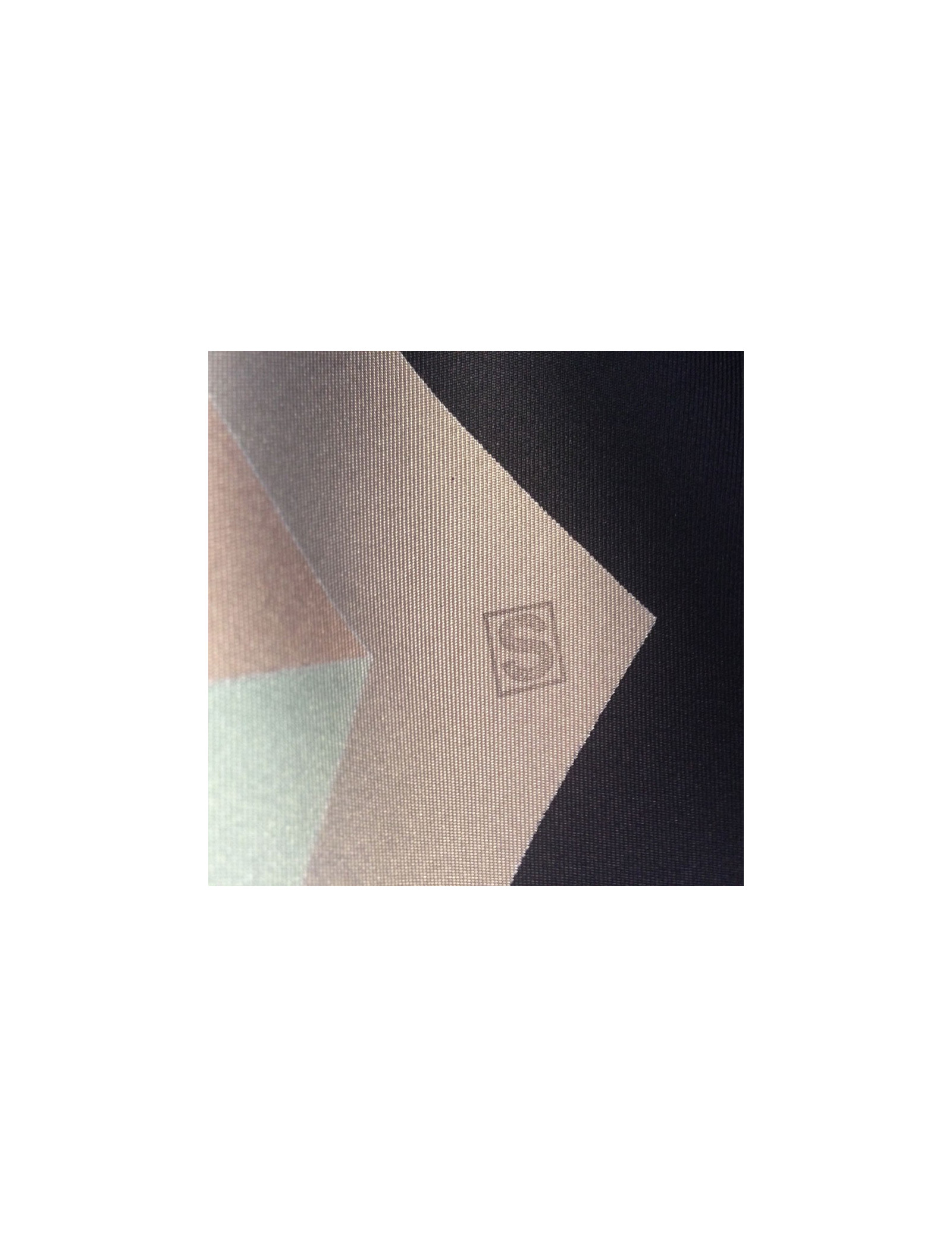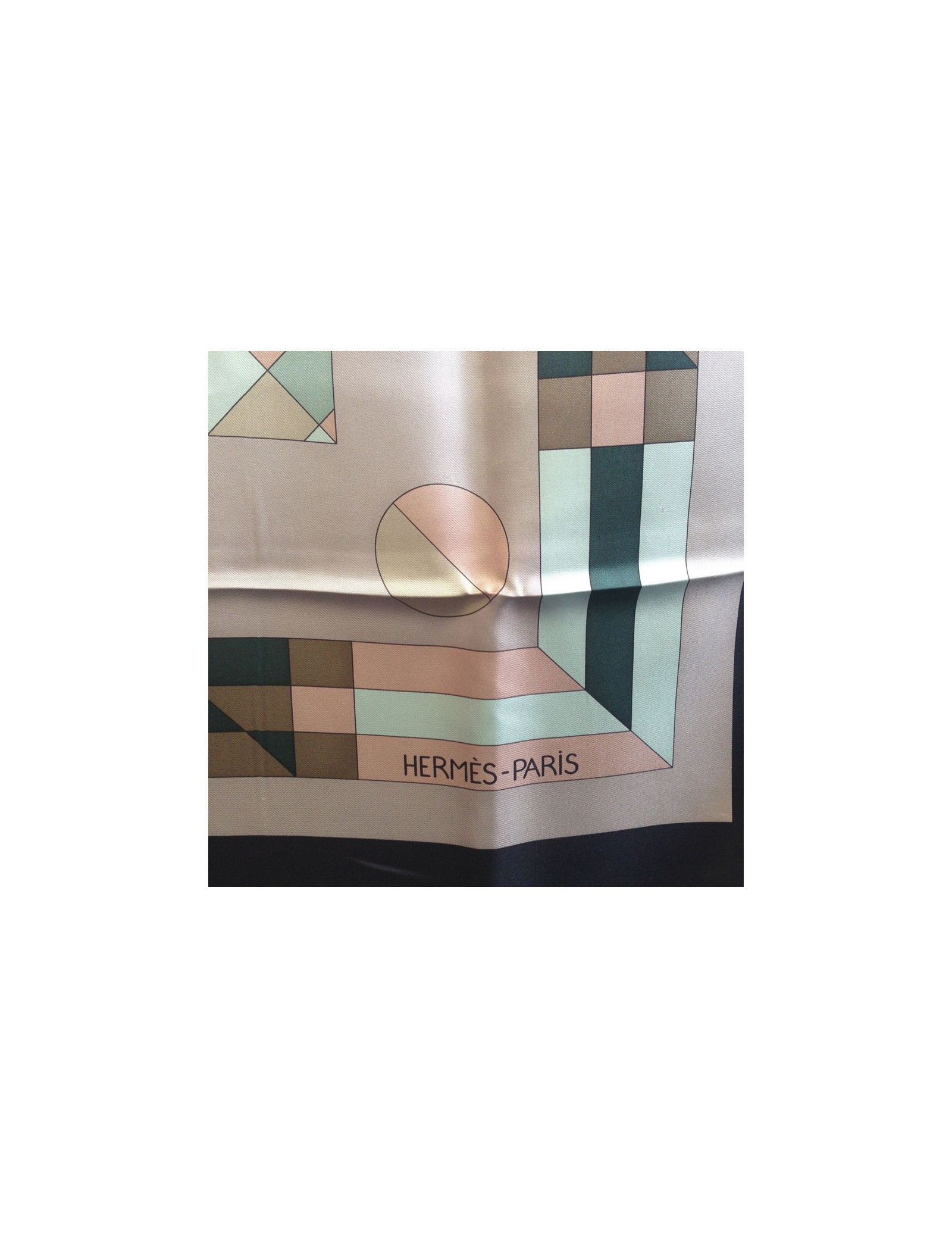 Grand carré HERMES modèle "Psyché" en soie. Coloris neutres: noir, étoupe, vert, beige, vieux rose. Le roulotté est impeccable. Petit trou sur le foulard (voir photo). En très bon état.