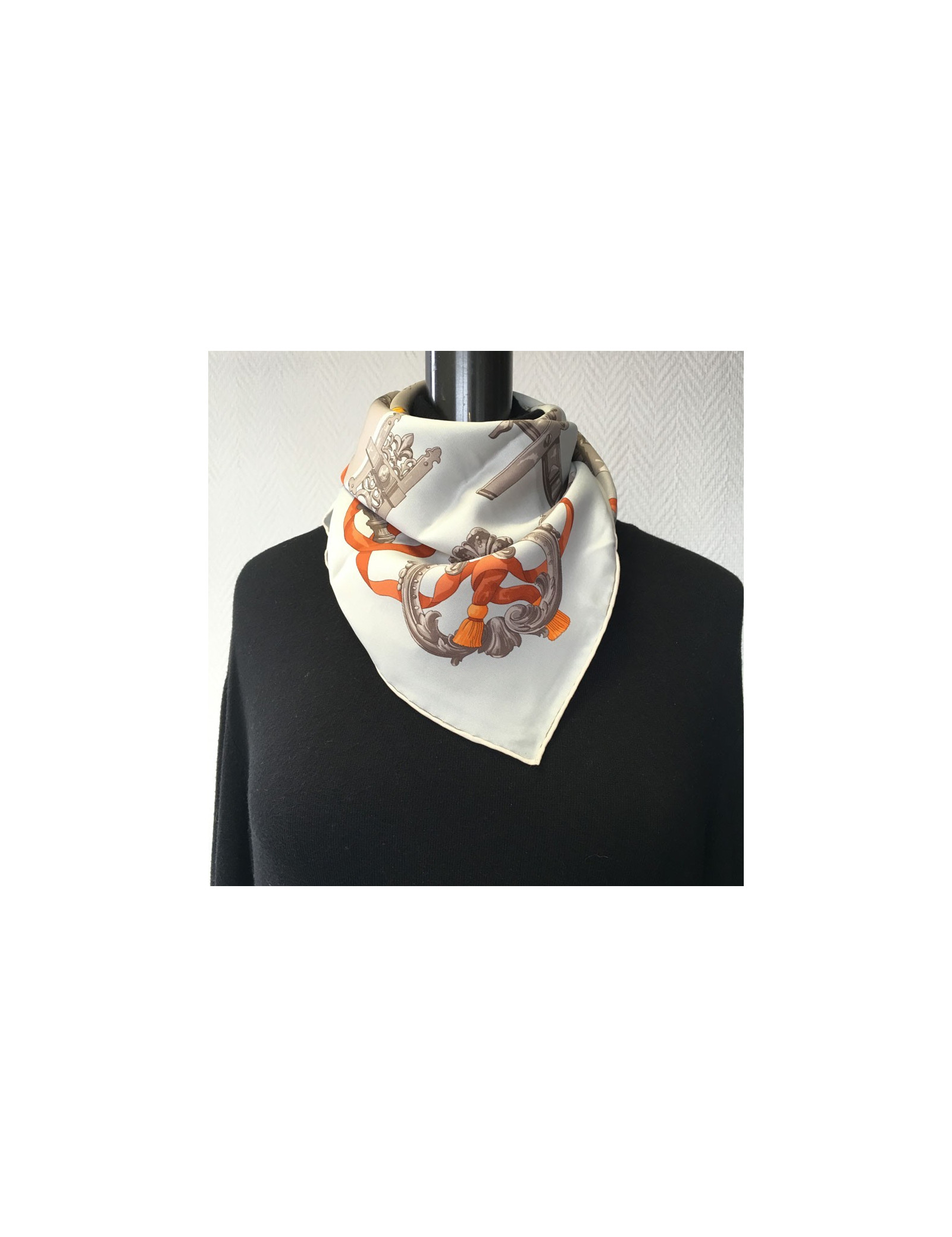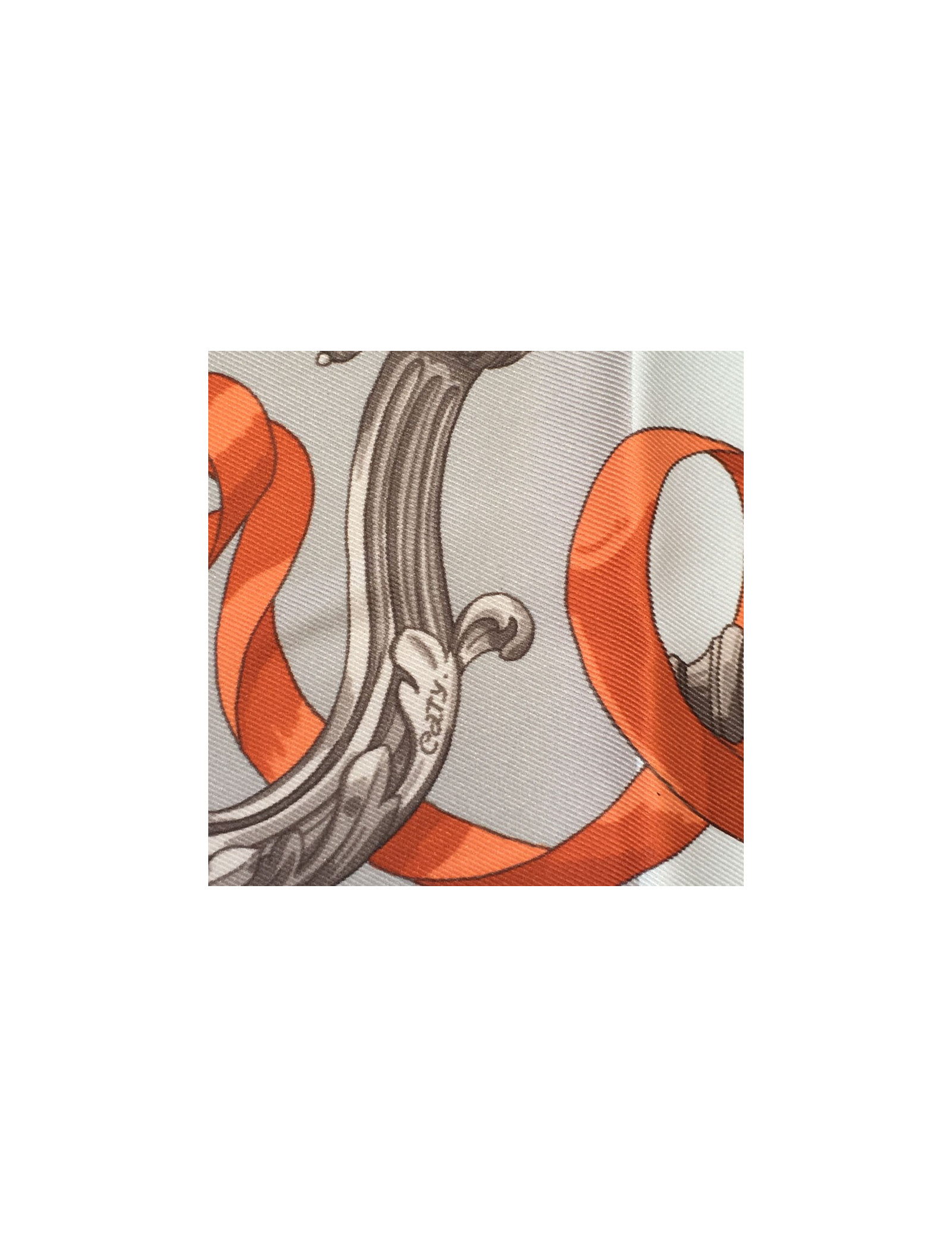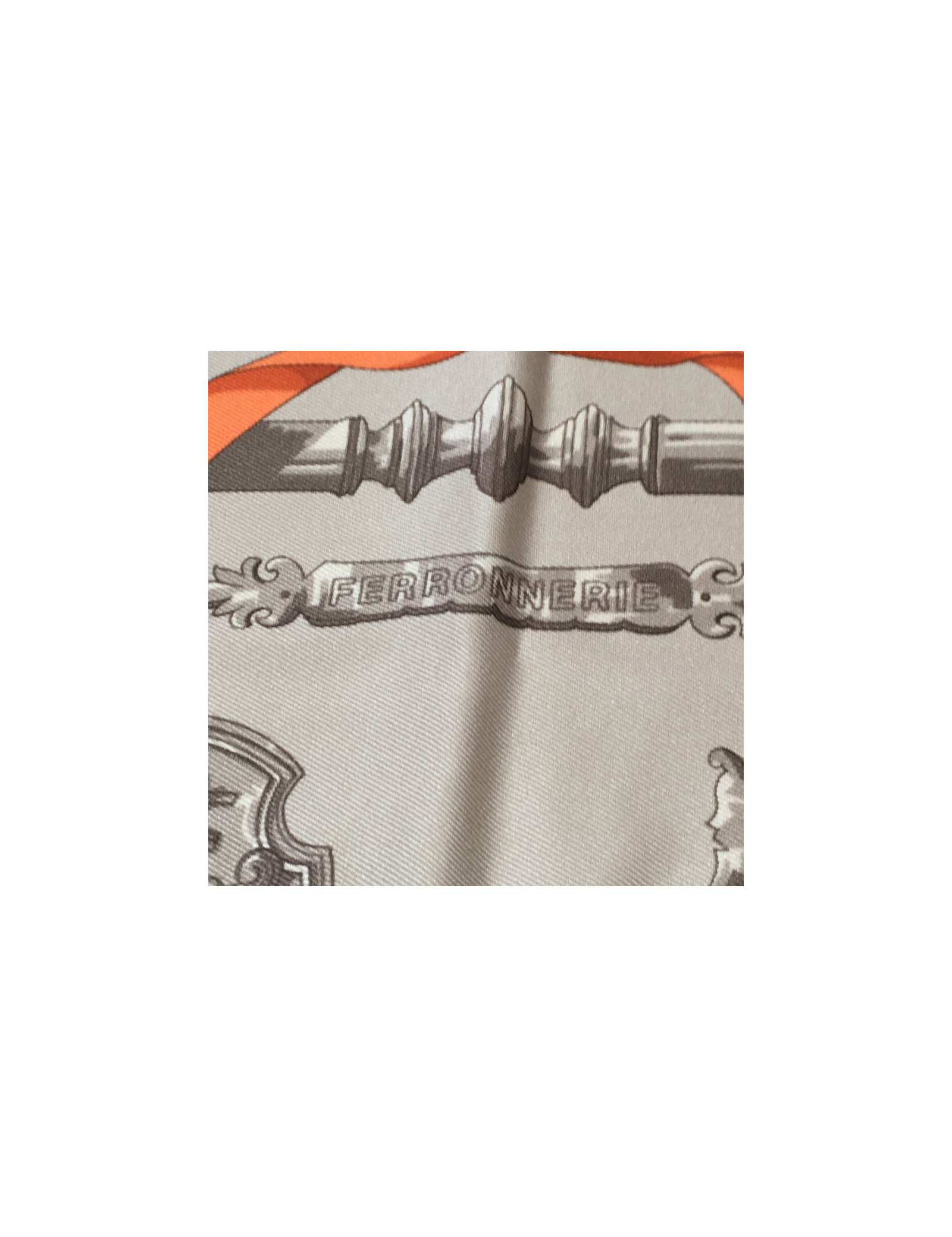 Hermès 'Ferronnerie' small scarf in taupe, gray, yellow and orange silk. In very good shape. A small stain on the gray background. The roulotté is impeccable.
