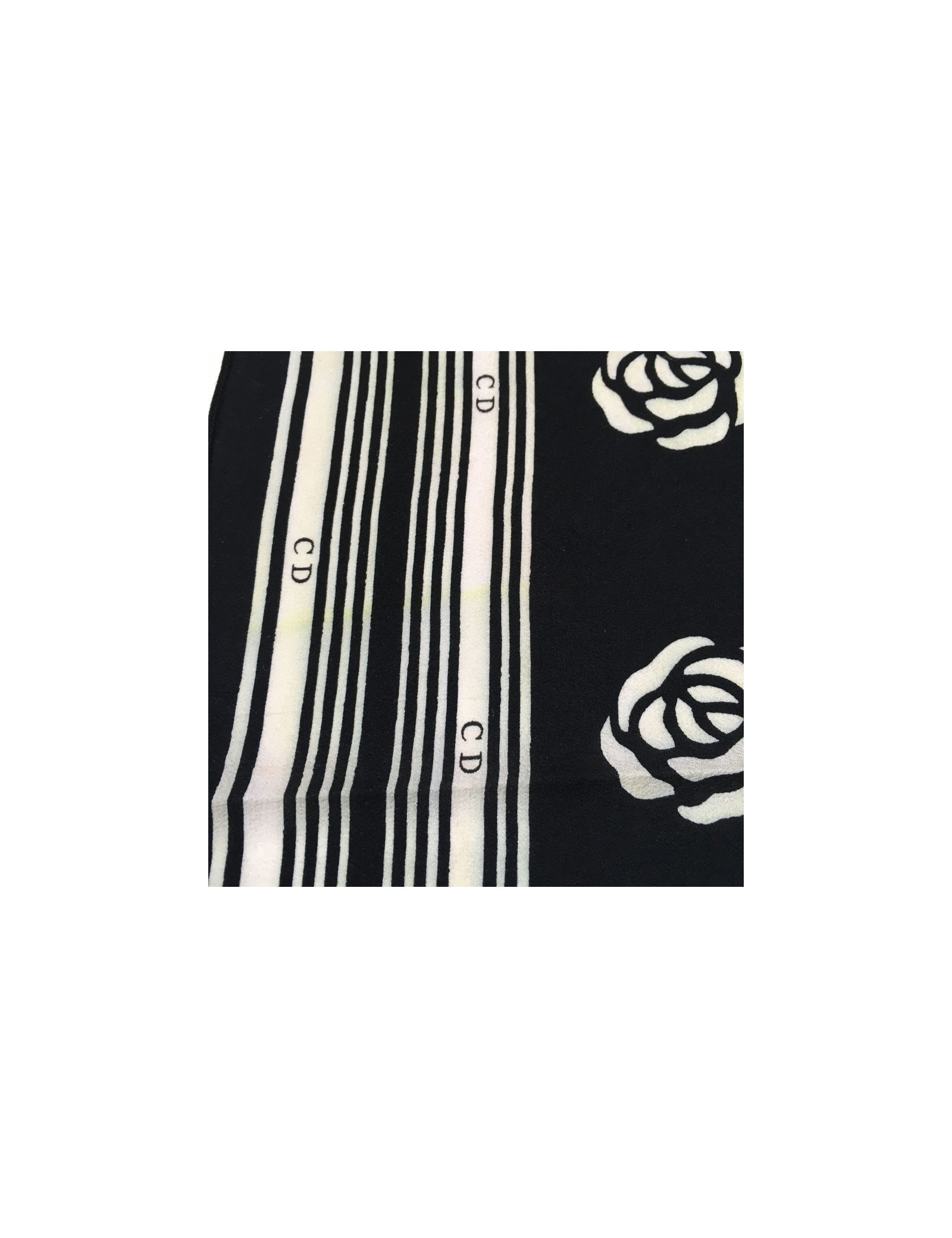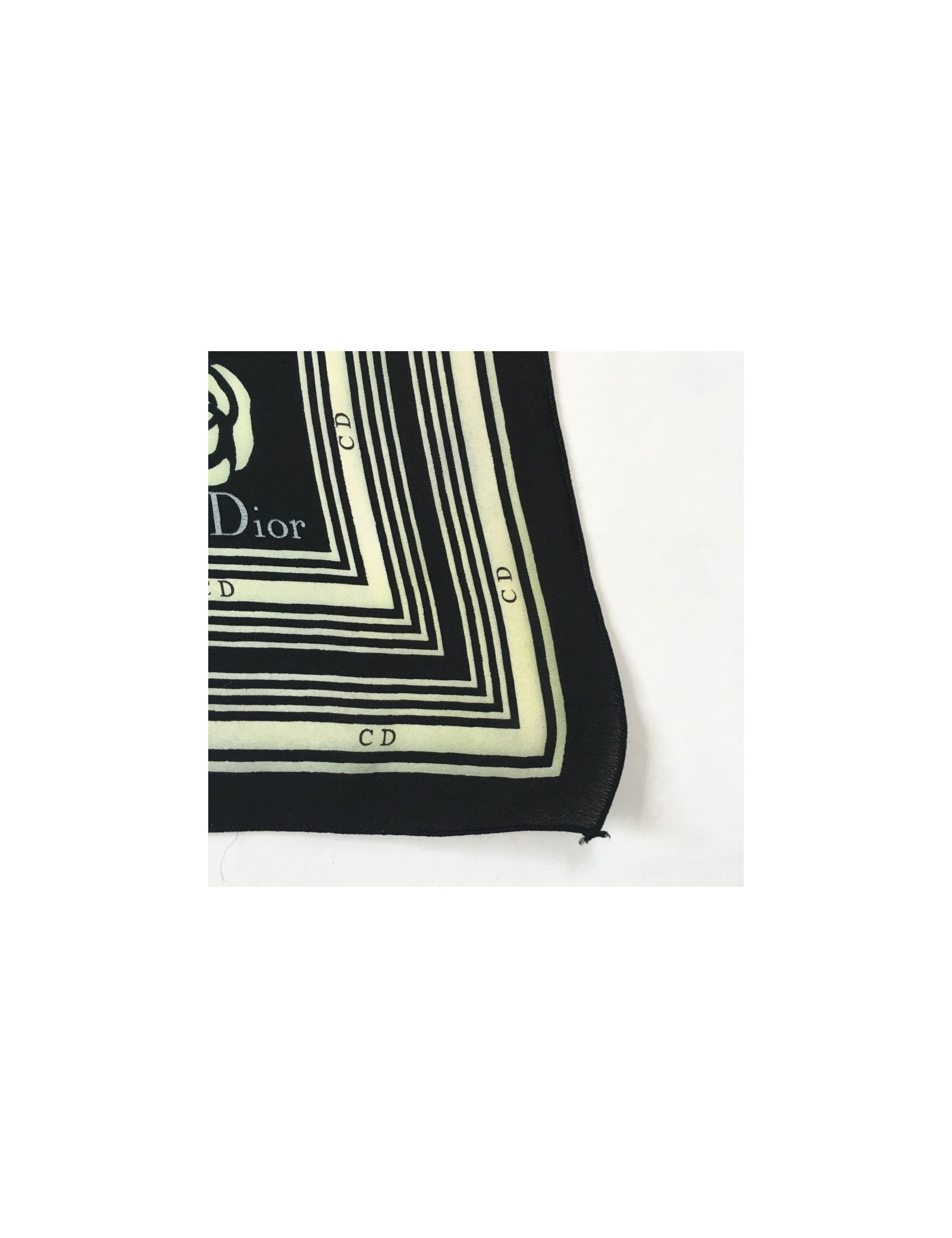 Square "CD" DIOR silk black and beige. For light stains and discolorations on the whole of the headscarf (see photos). Label of missing material. Correct state.