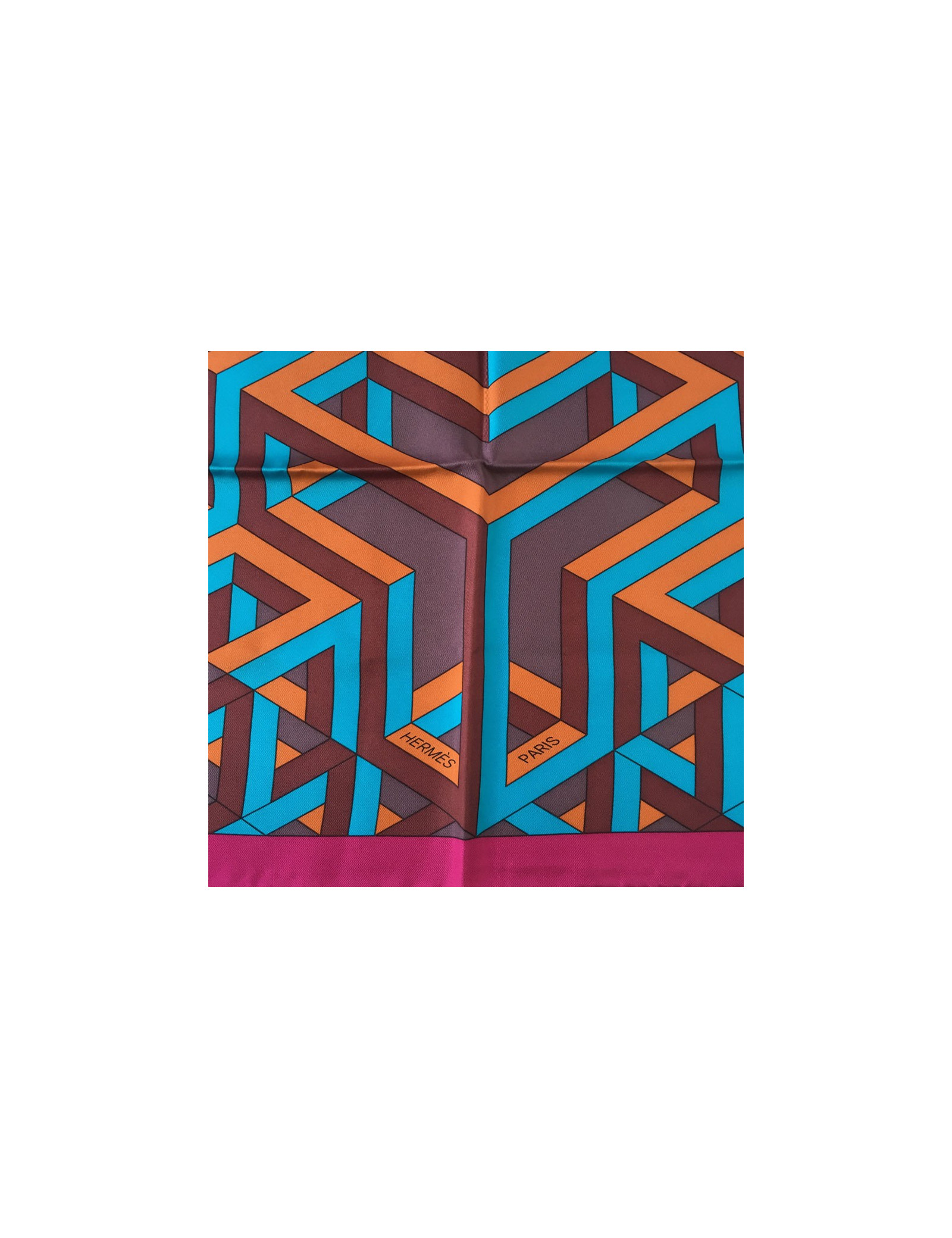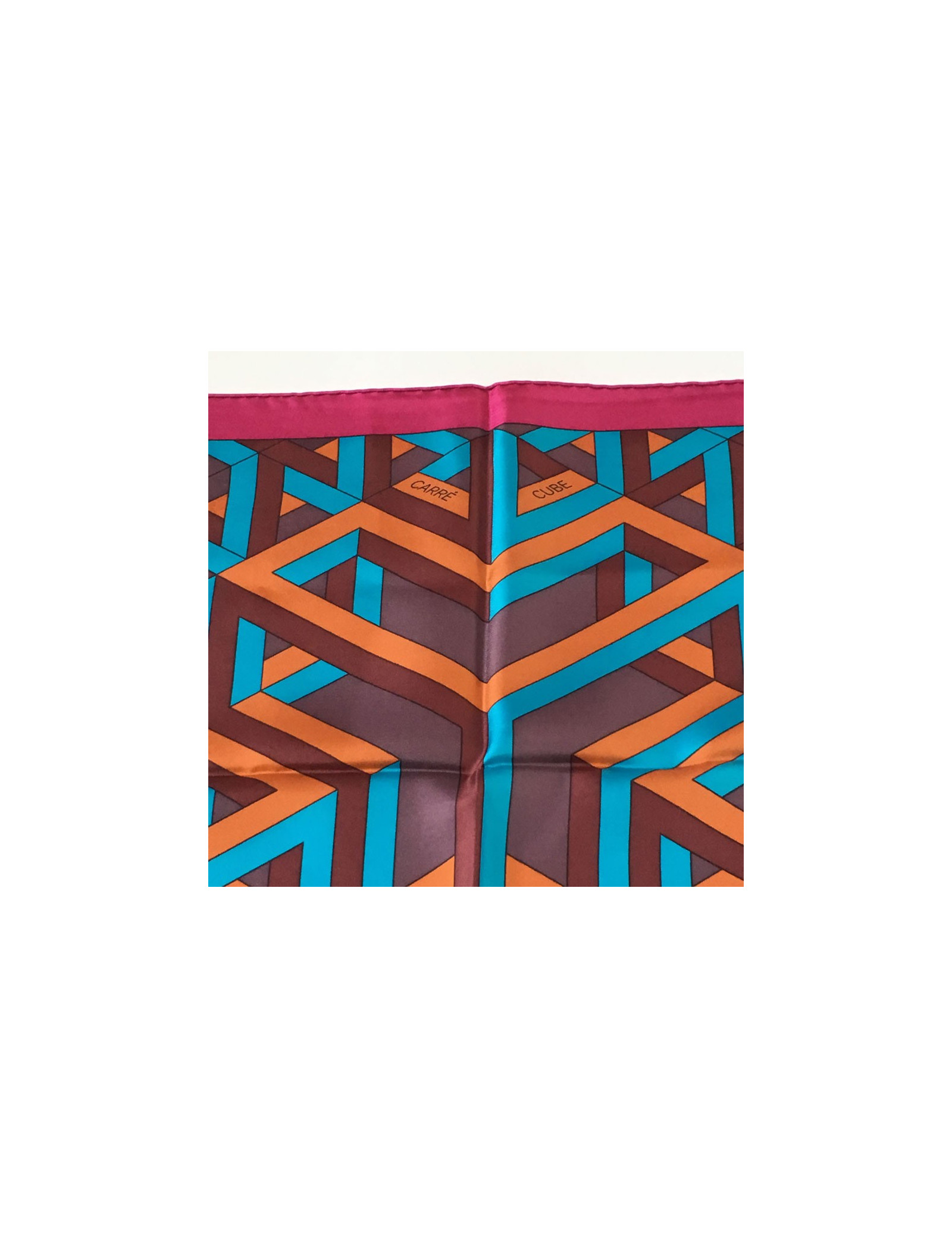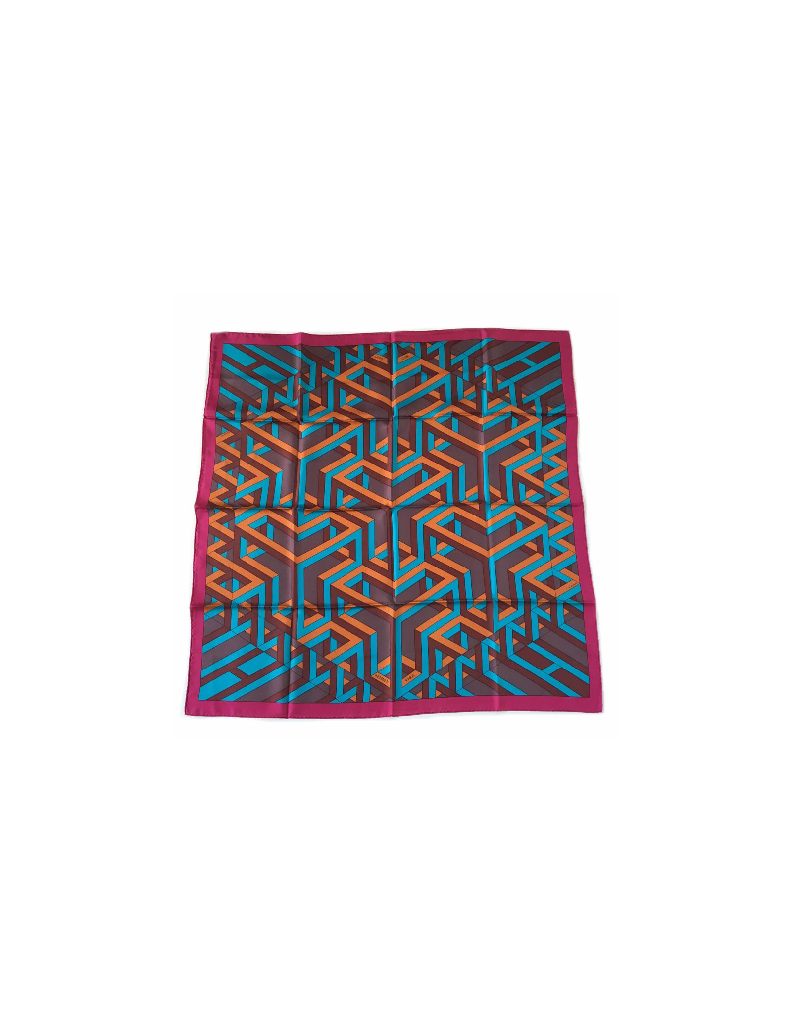 Hermès "Square Cube" in silk fuchsia, turquoise and rust