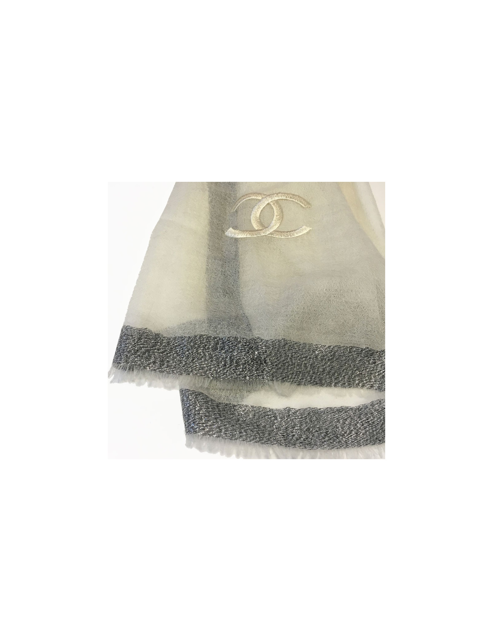 Beautiful CHANEL shawl with small fringes in ivory and anthracite, dark gray border and silver thread silk