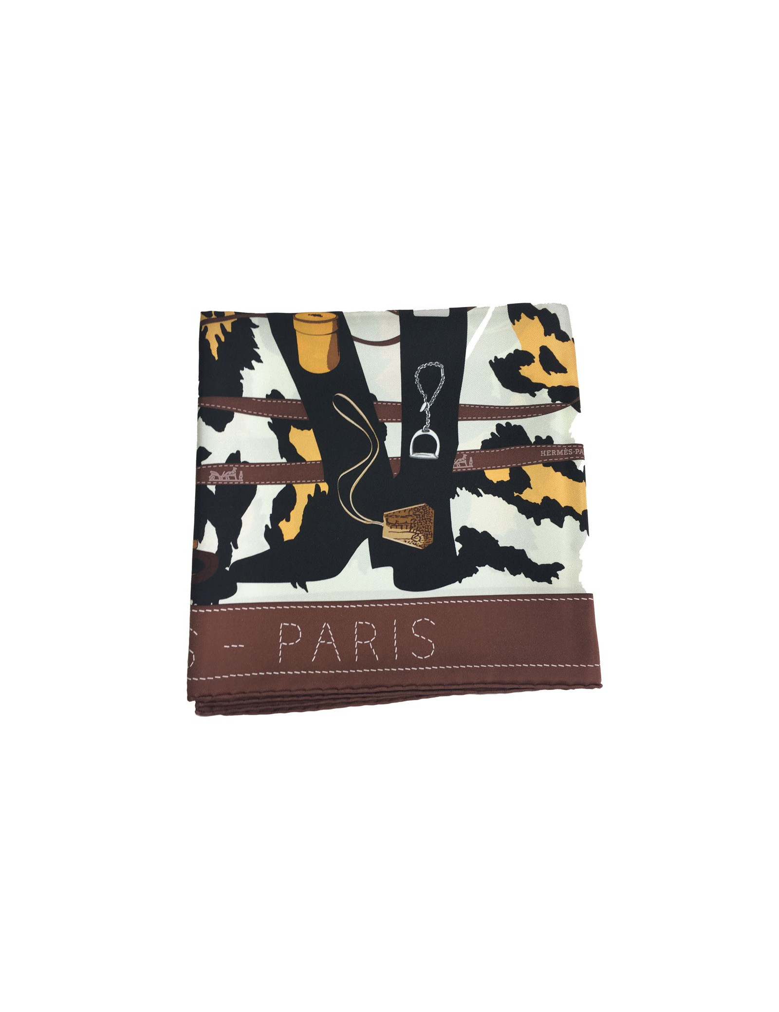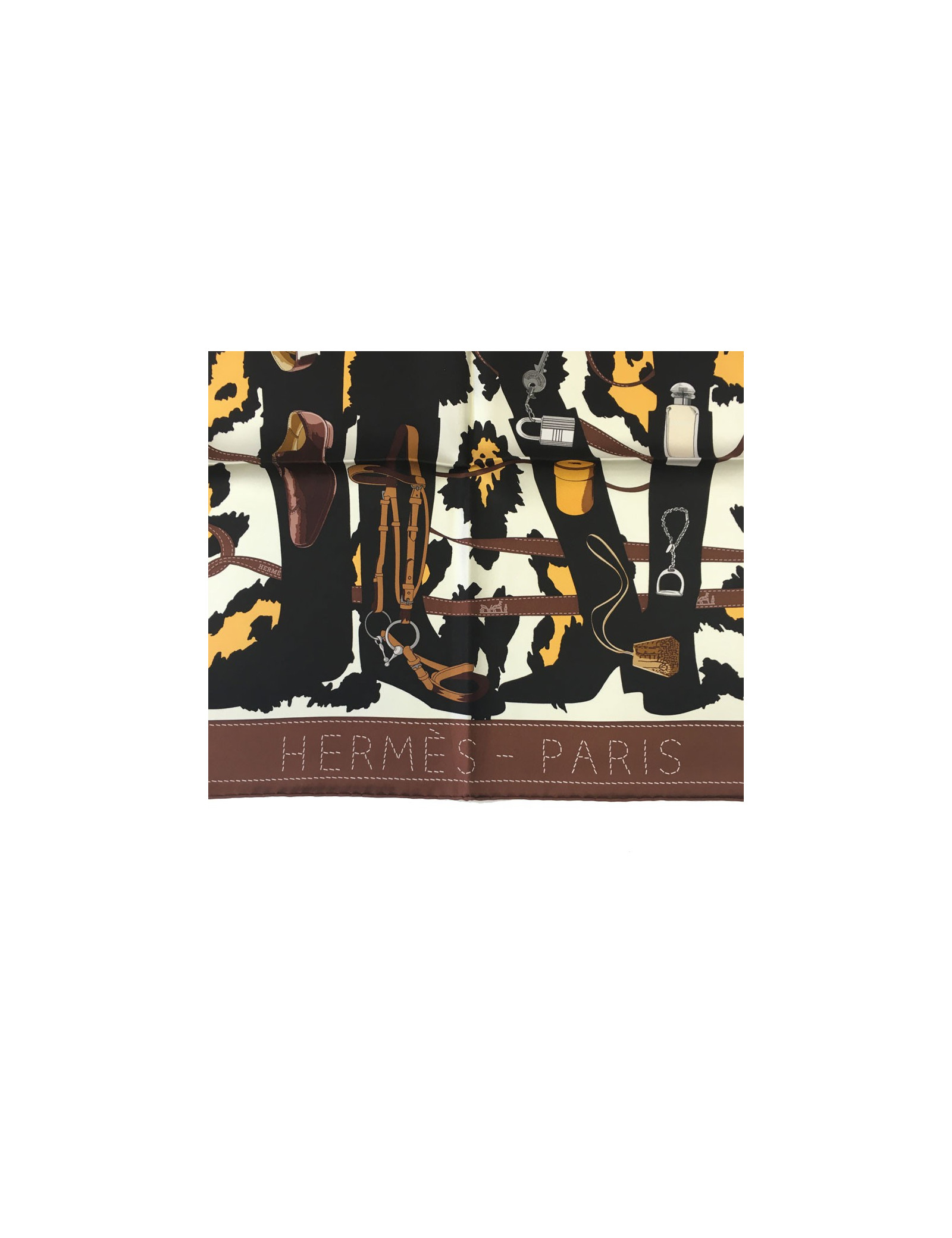 Hermès 'Monsieur, Madame' scarf in ivory silk and brown border, patterns : symbols of the brand: leather goods, jewels, bags, perfumes.