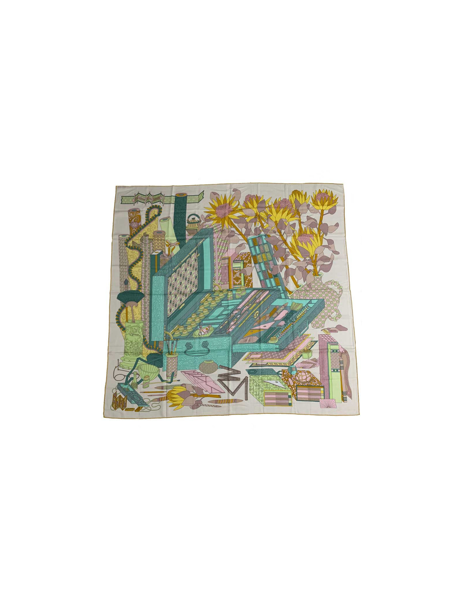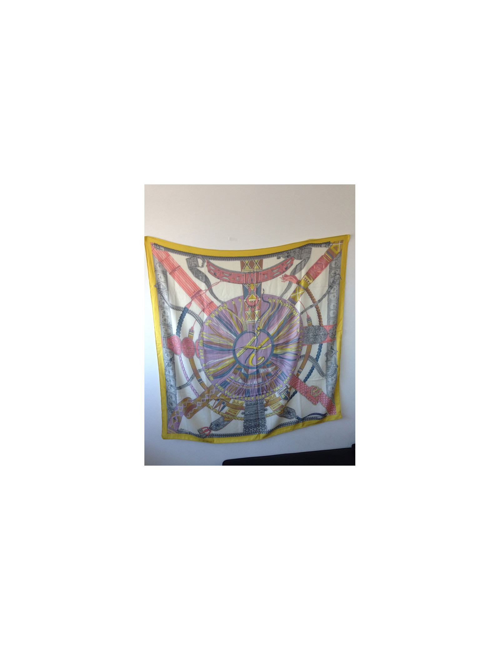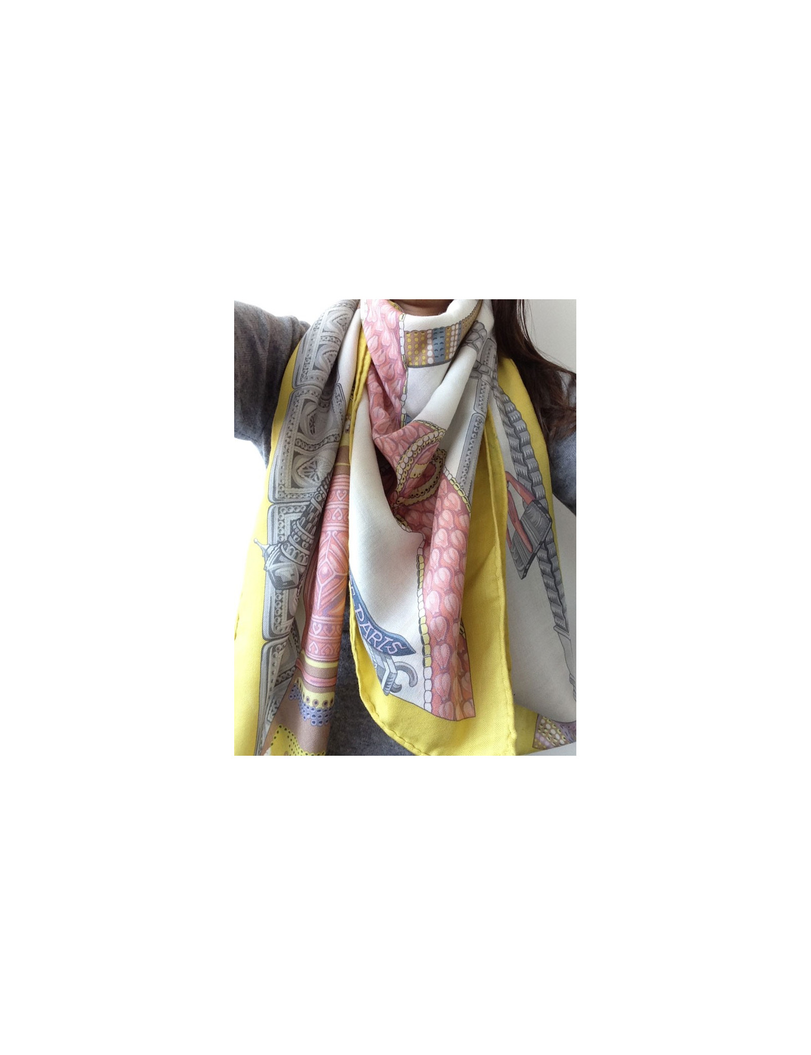 Large shawl 'Belts and links' Hermès in cashmere and silk in the colours white, pink, yellow, signed Toutsy.